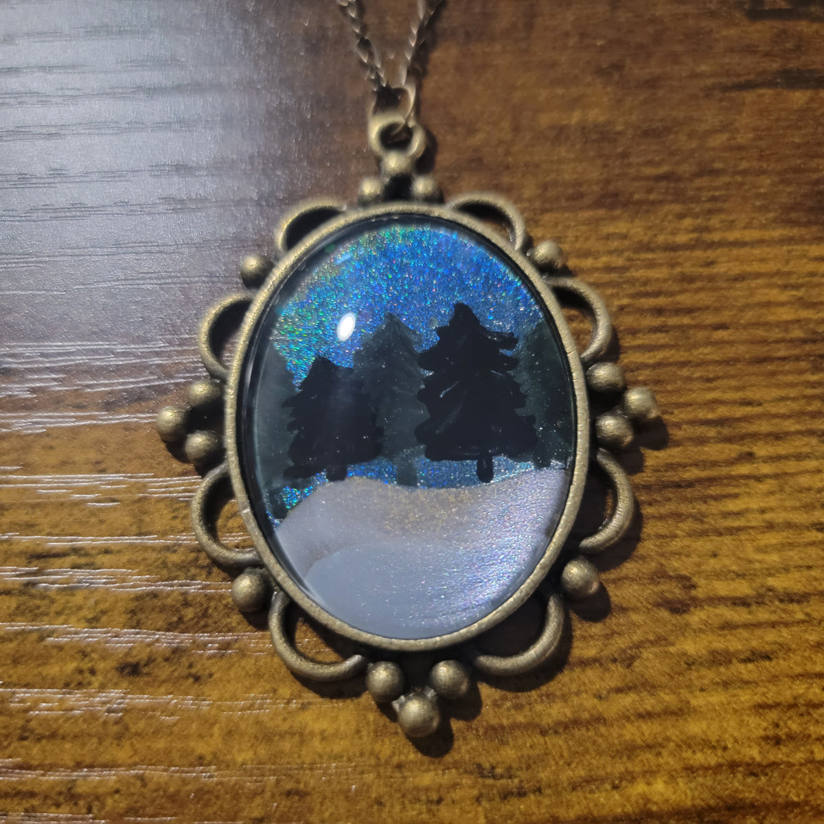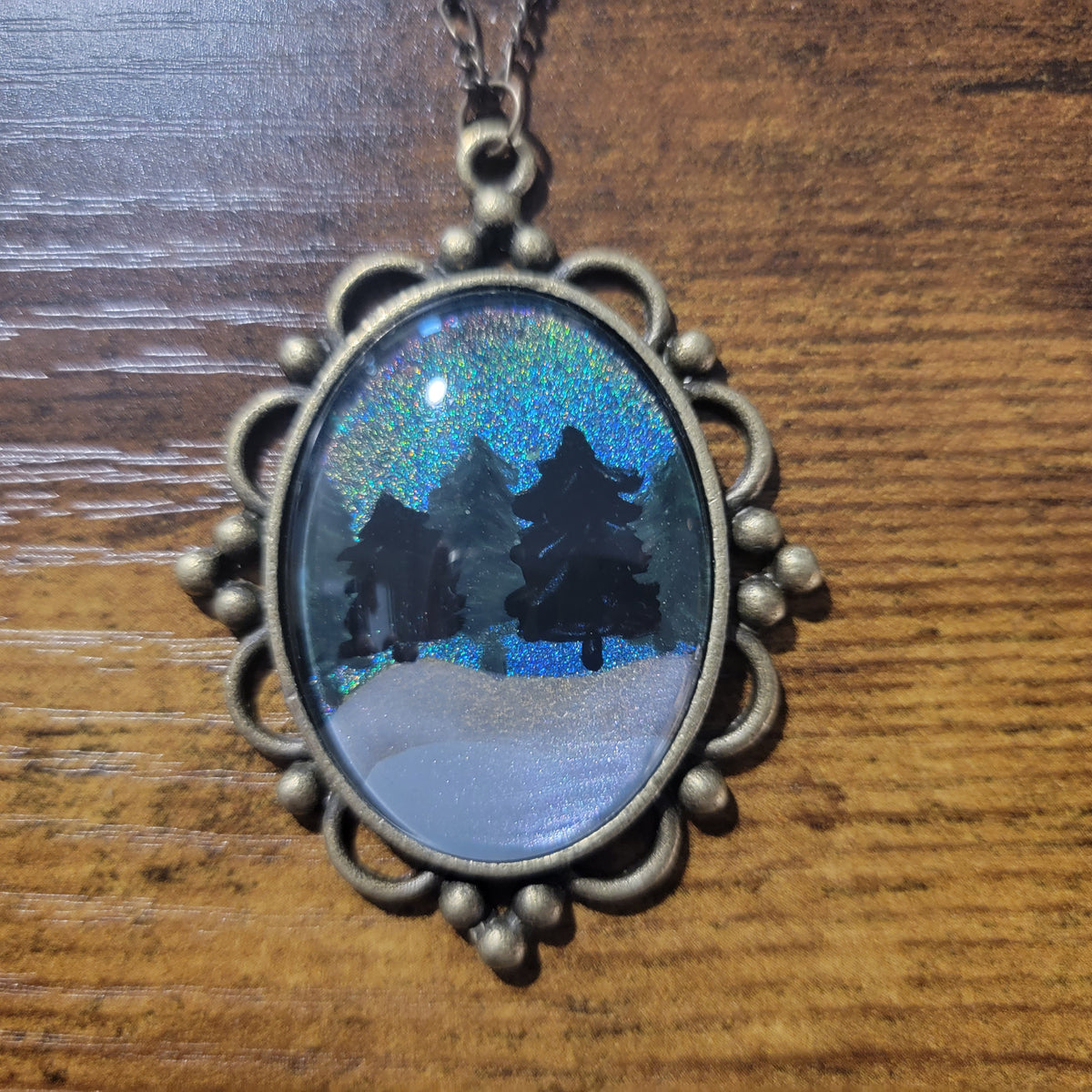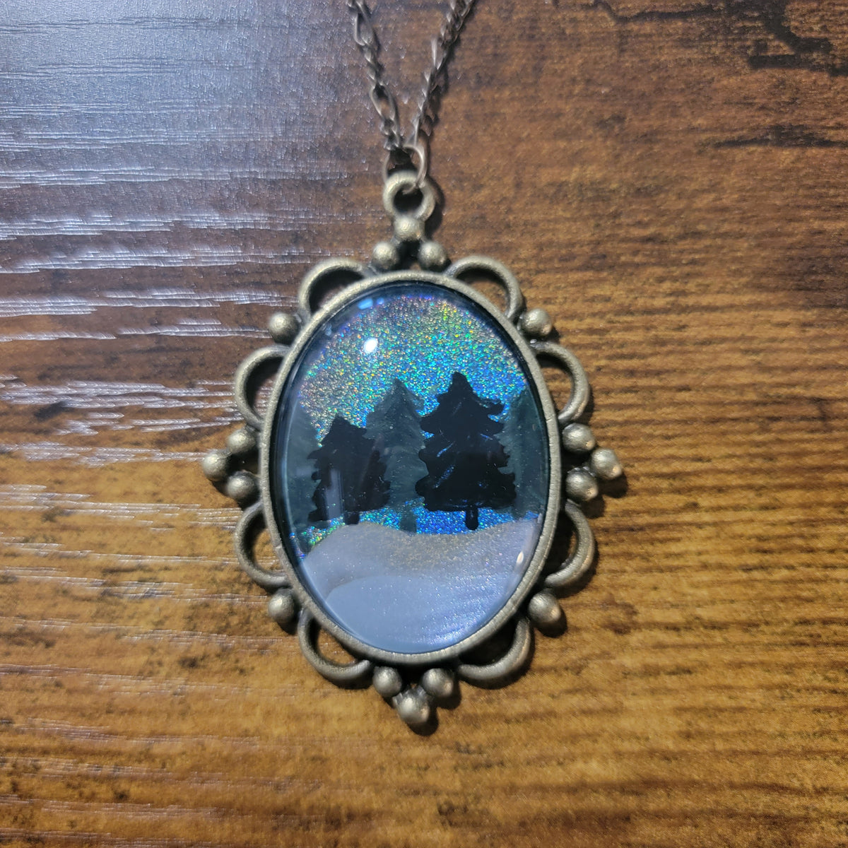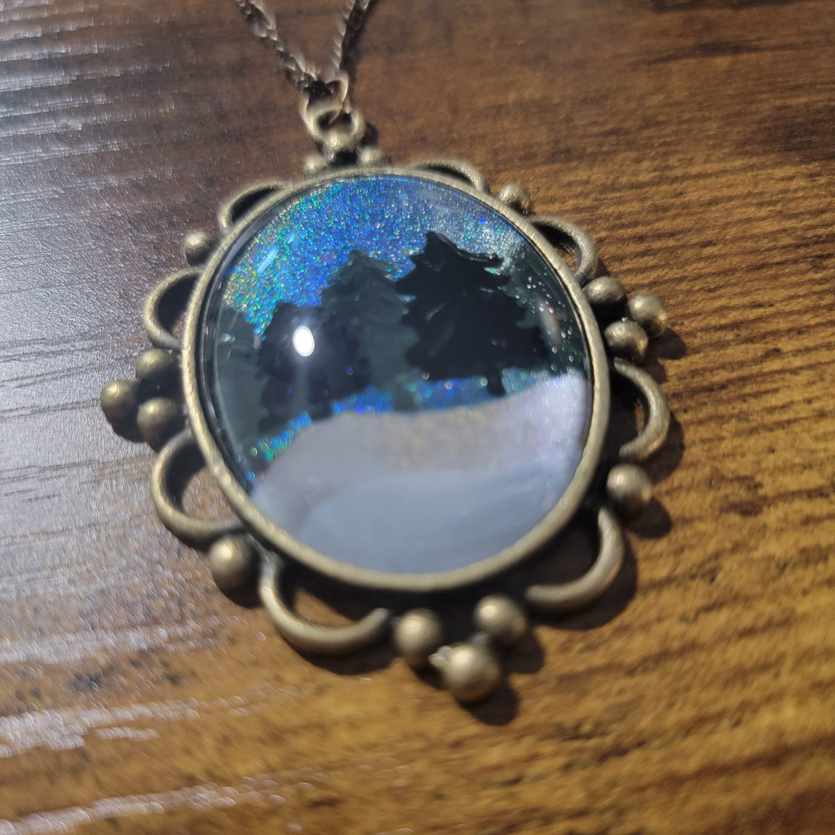 A one of a kind hand-painted pendant featuring evergreens on snowy hills. The sky behind them has glitter and a color changing sky. This one has a lighter sky filled with glitter that sparkles in a full rainbow of colors.