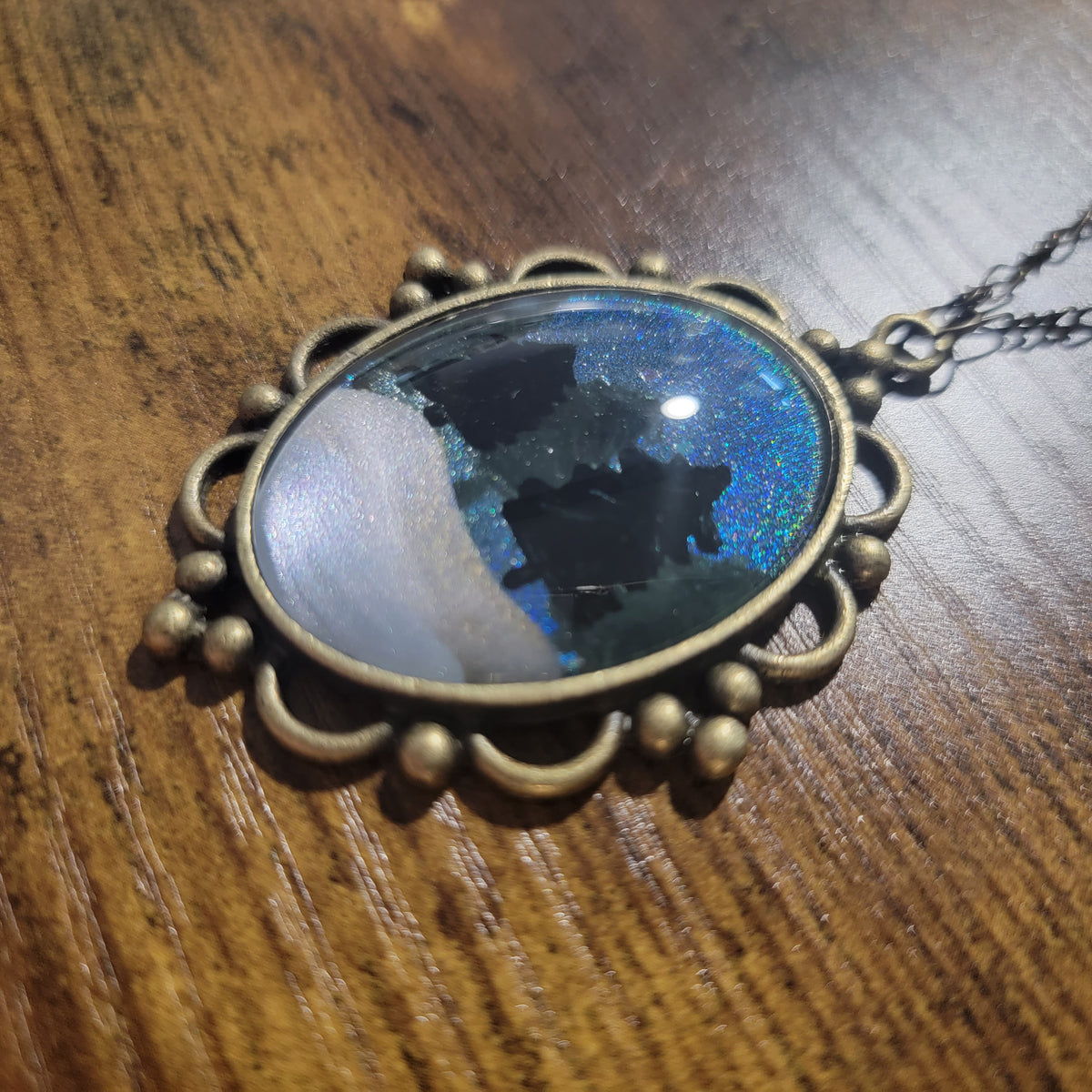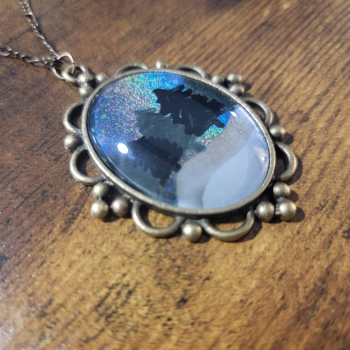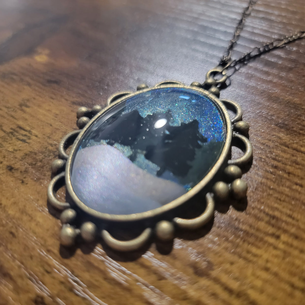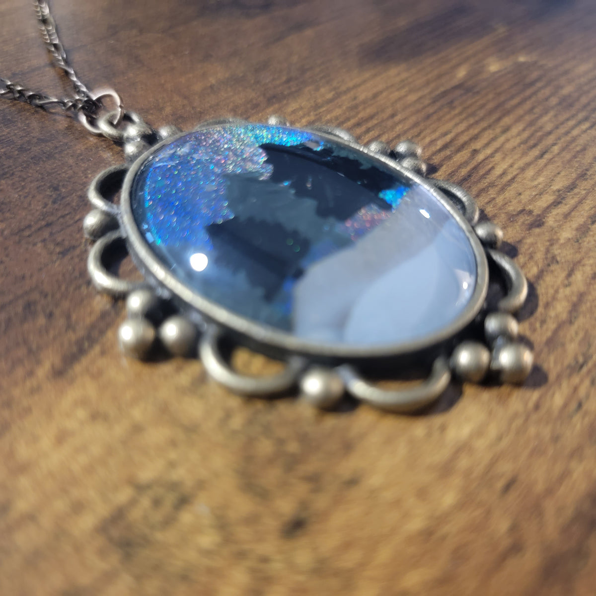 A one of a kind hand-painted pendant featuring evergreens on snowy hills. The sky behind them has glitter and a color changing sky. This one has a lighter sky filled with glitter that sparkles in a full rainbow of colors.
