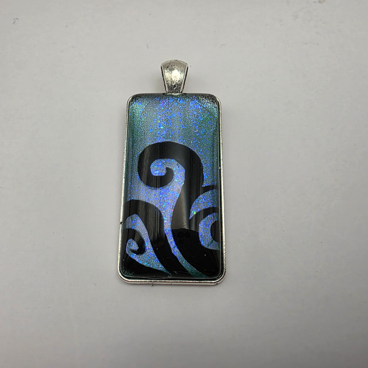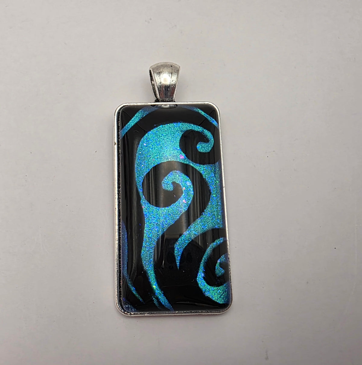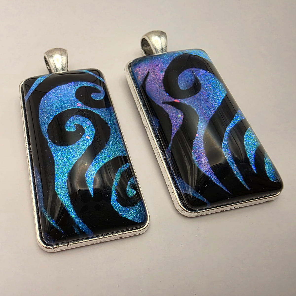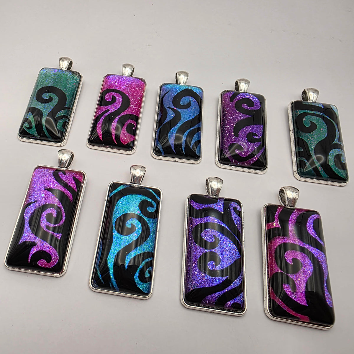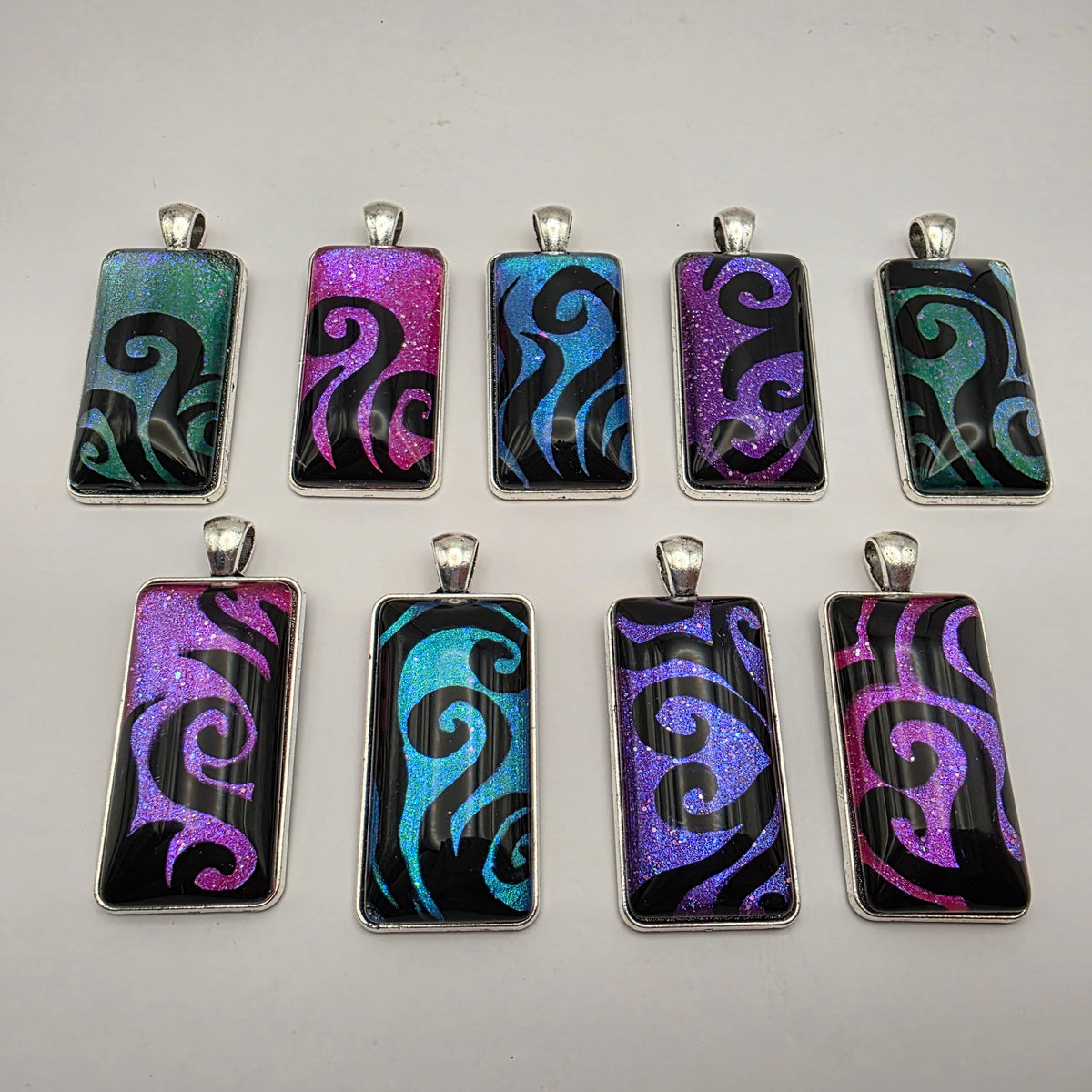 A pendant featuring black swirling designs painted against a colorful background. Pick your favorite color from the bunch!