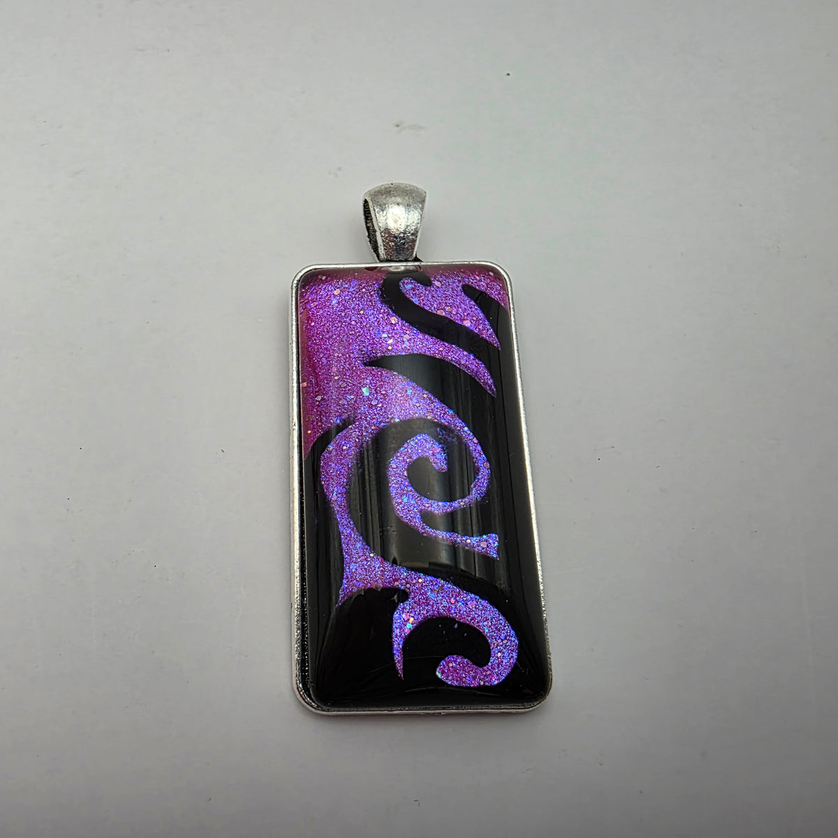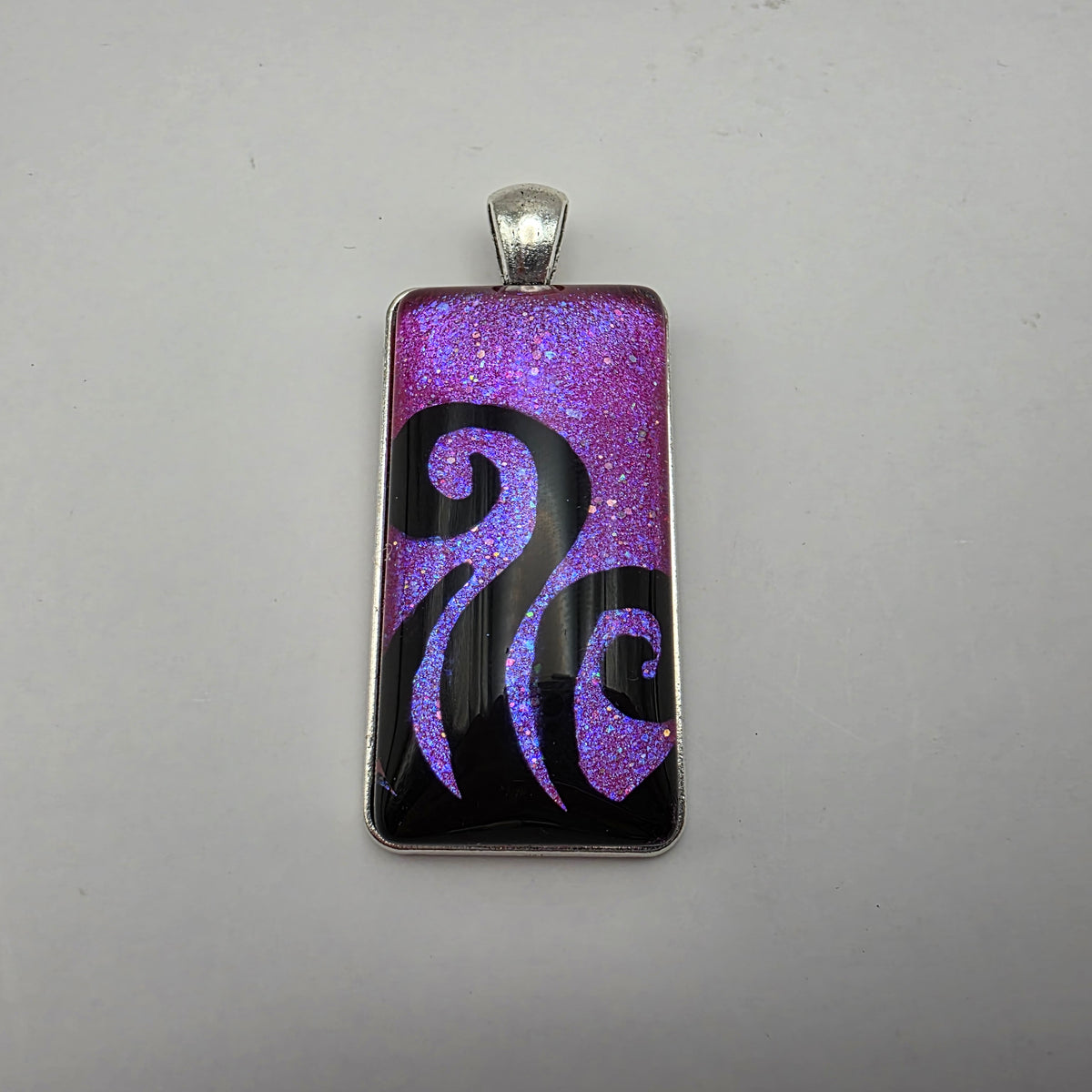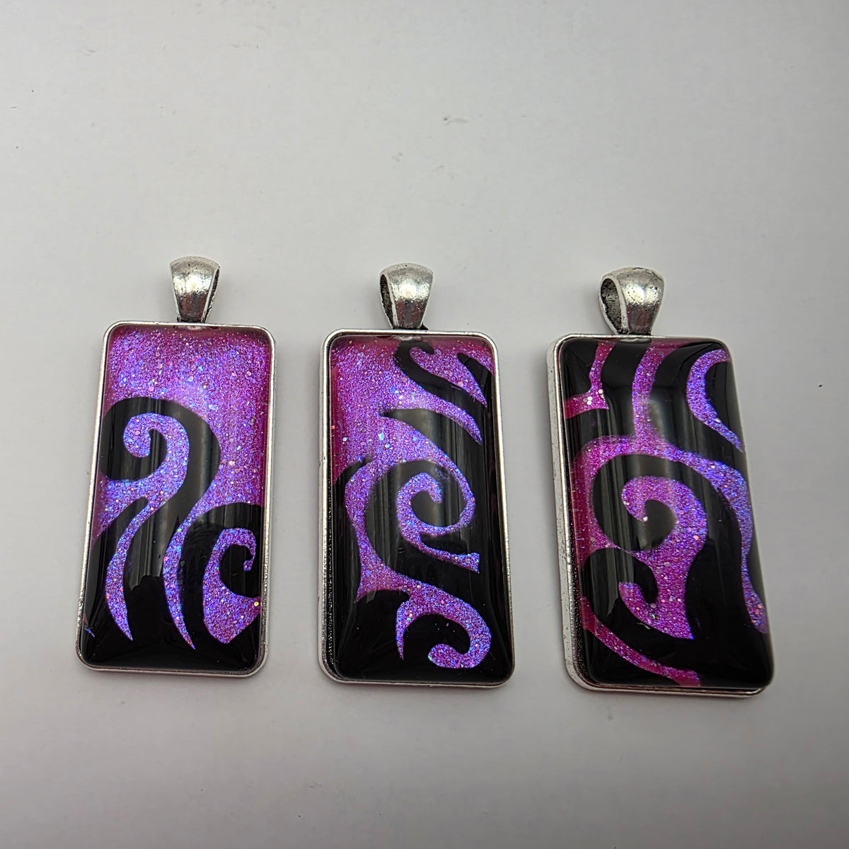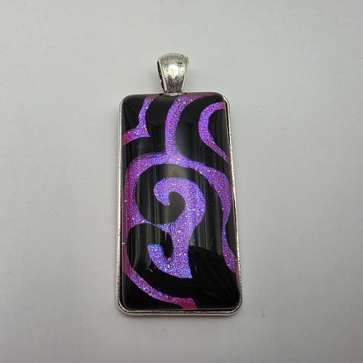 A pendant featuring black swirling designs painted against a colorful background. Pick your favorite color from the bunch!
