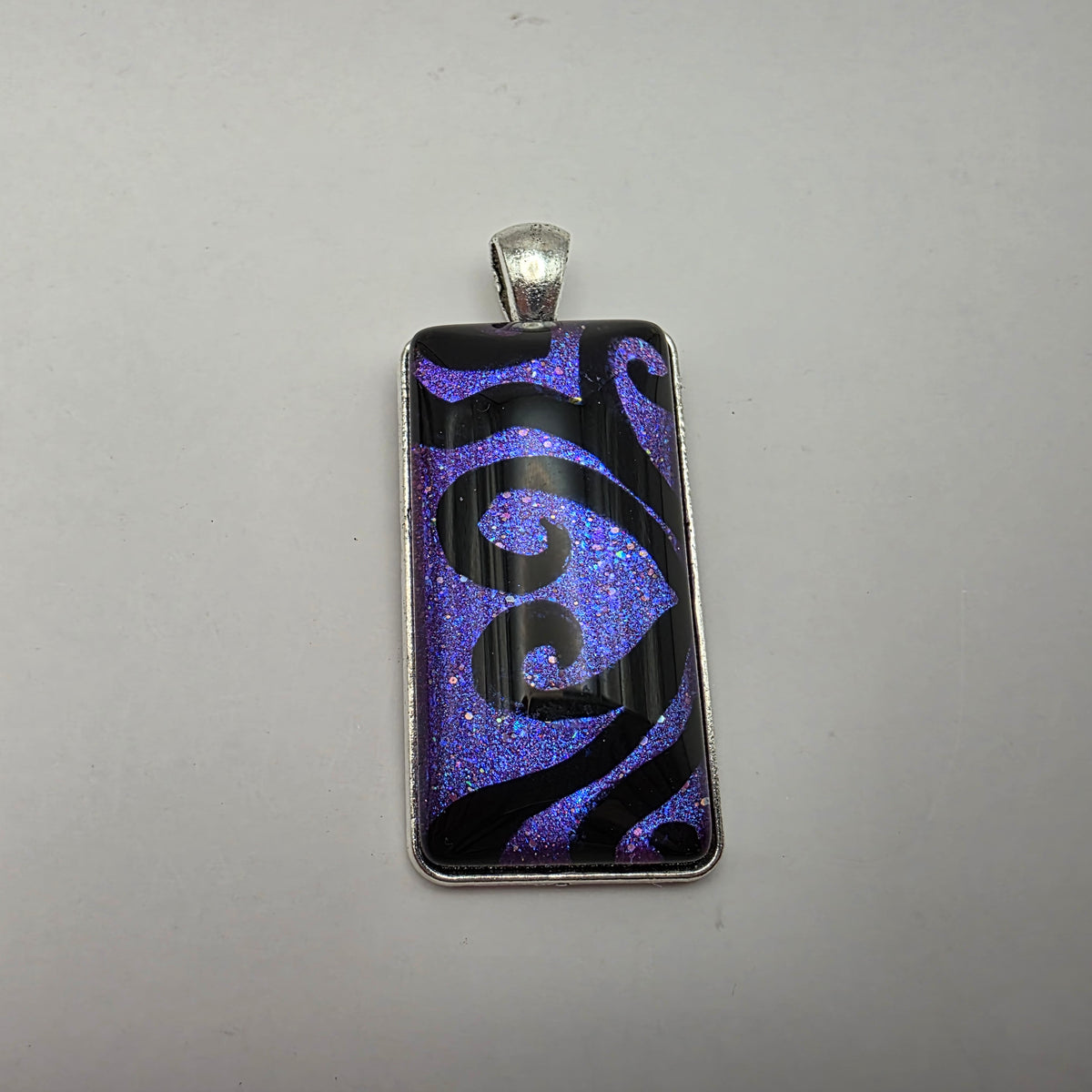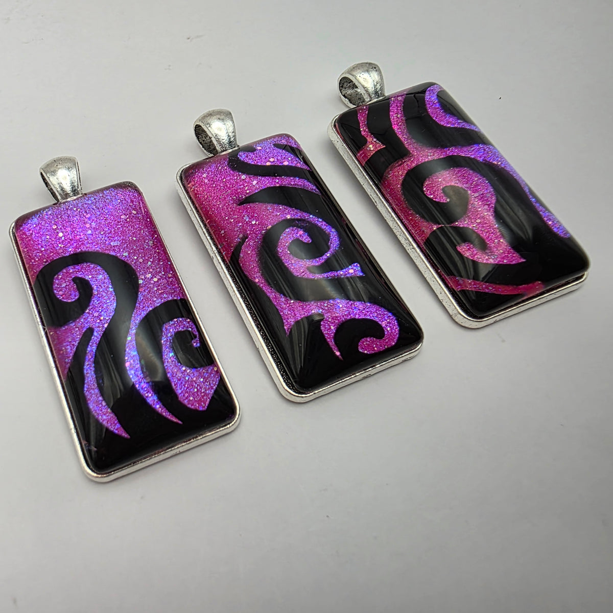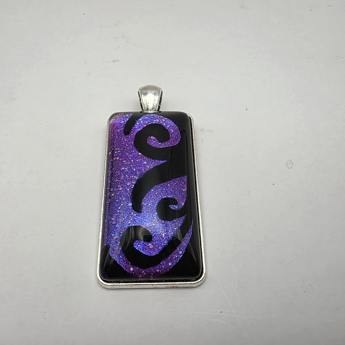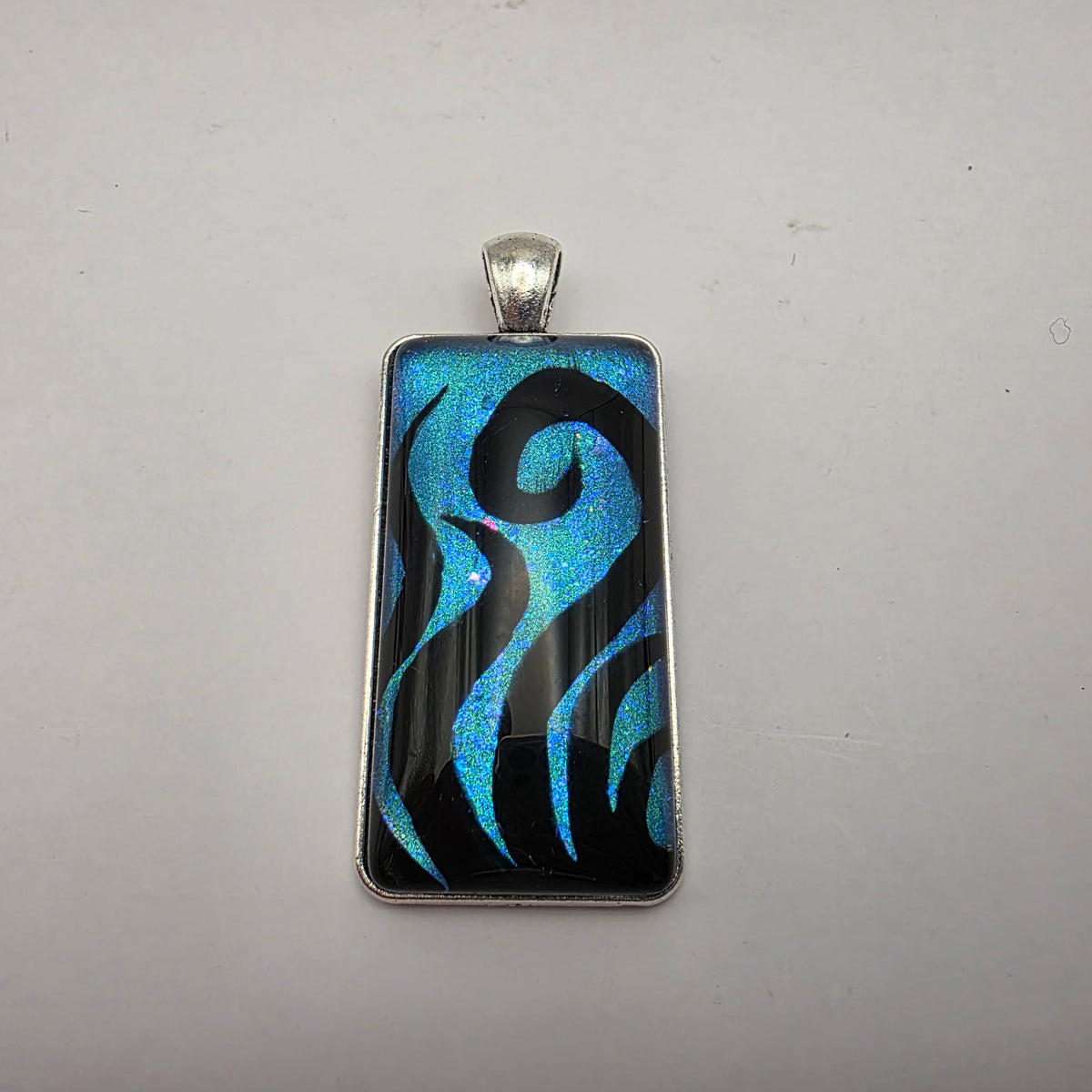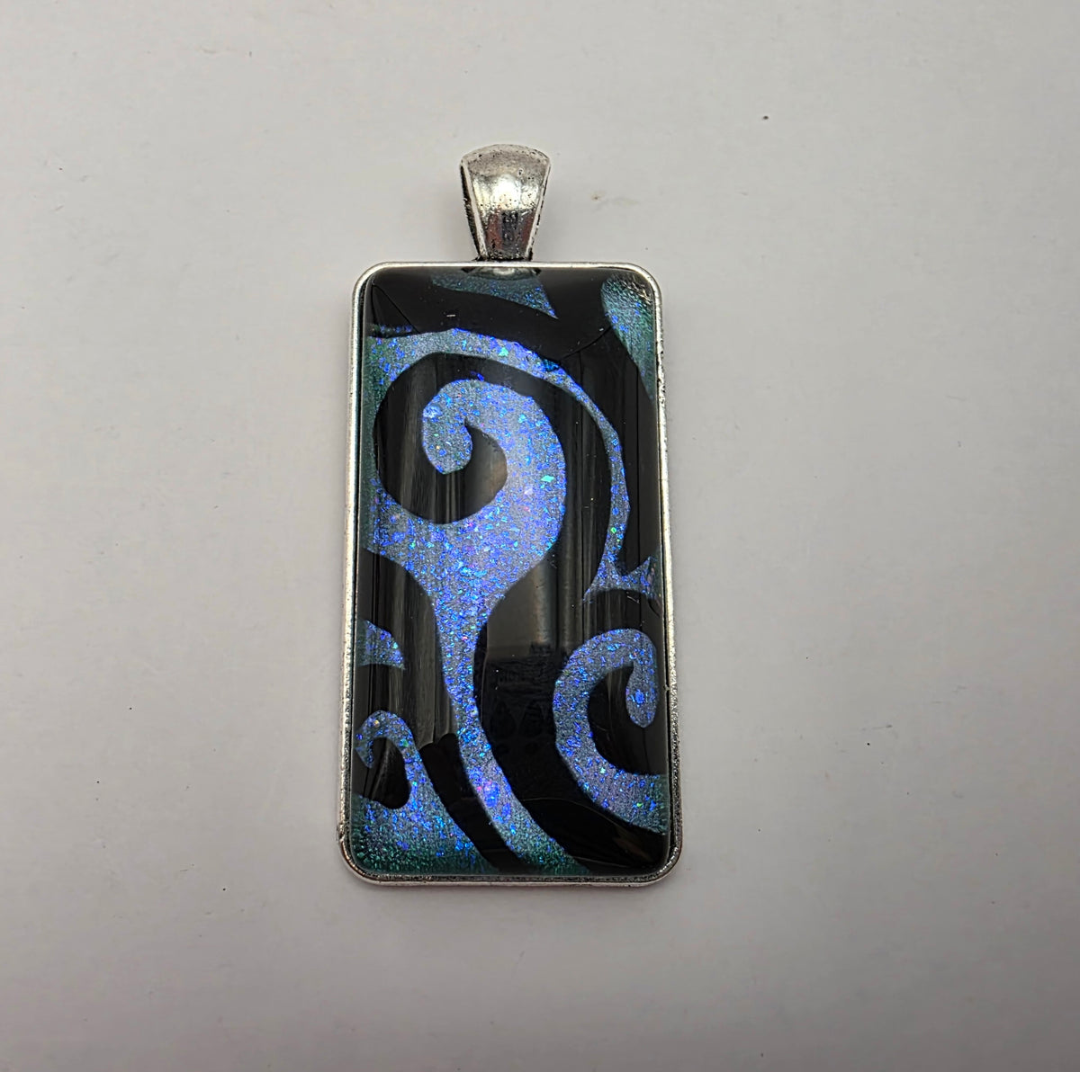 A pendant featuring black swirling designs painted against a colorful background. Pick your favorite color from the bunch!