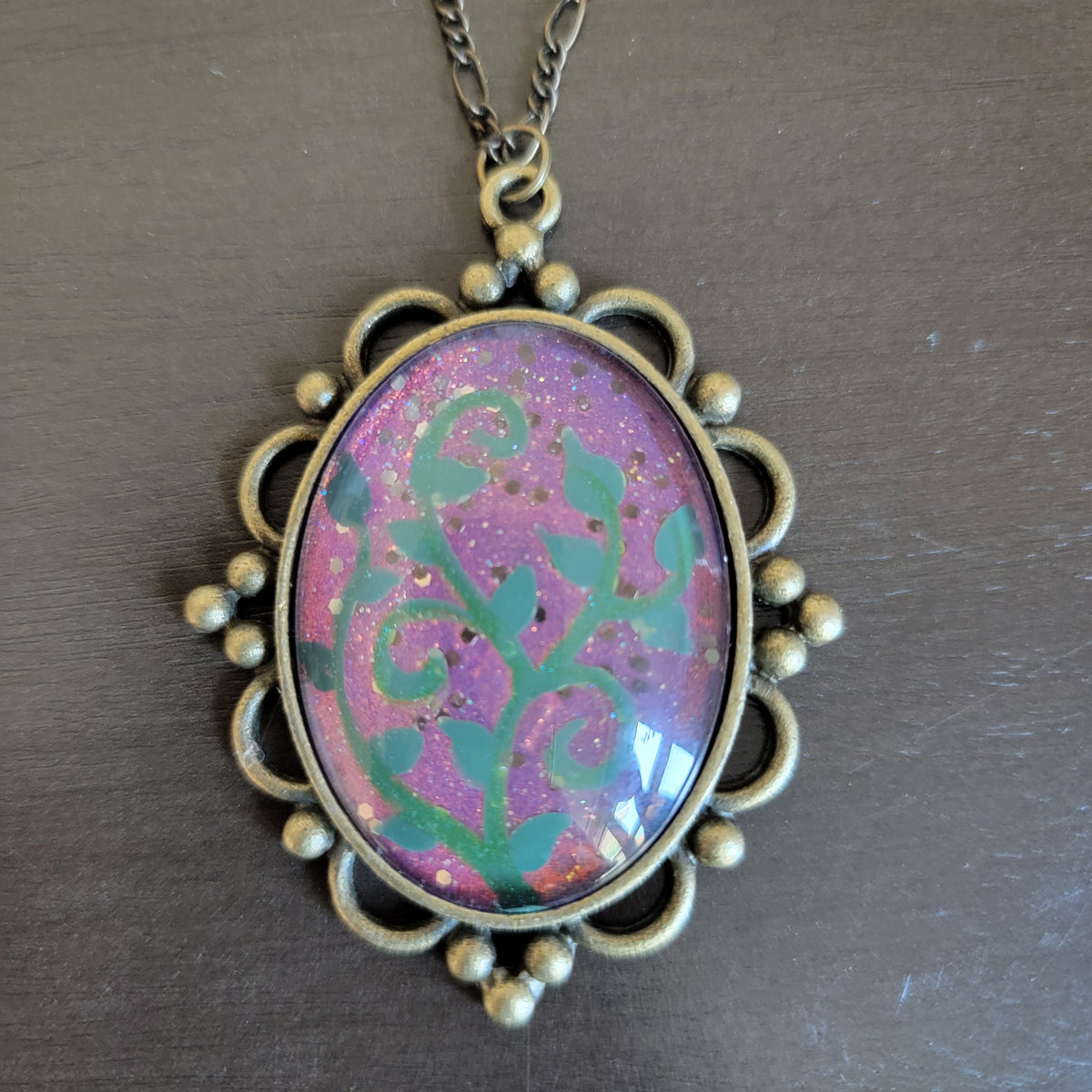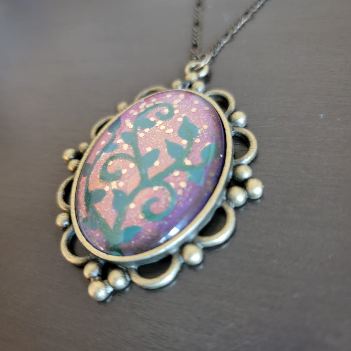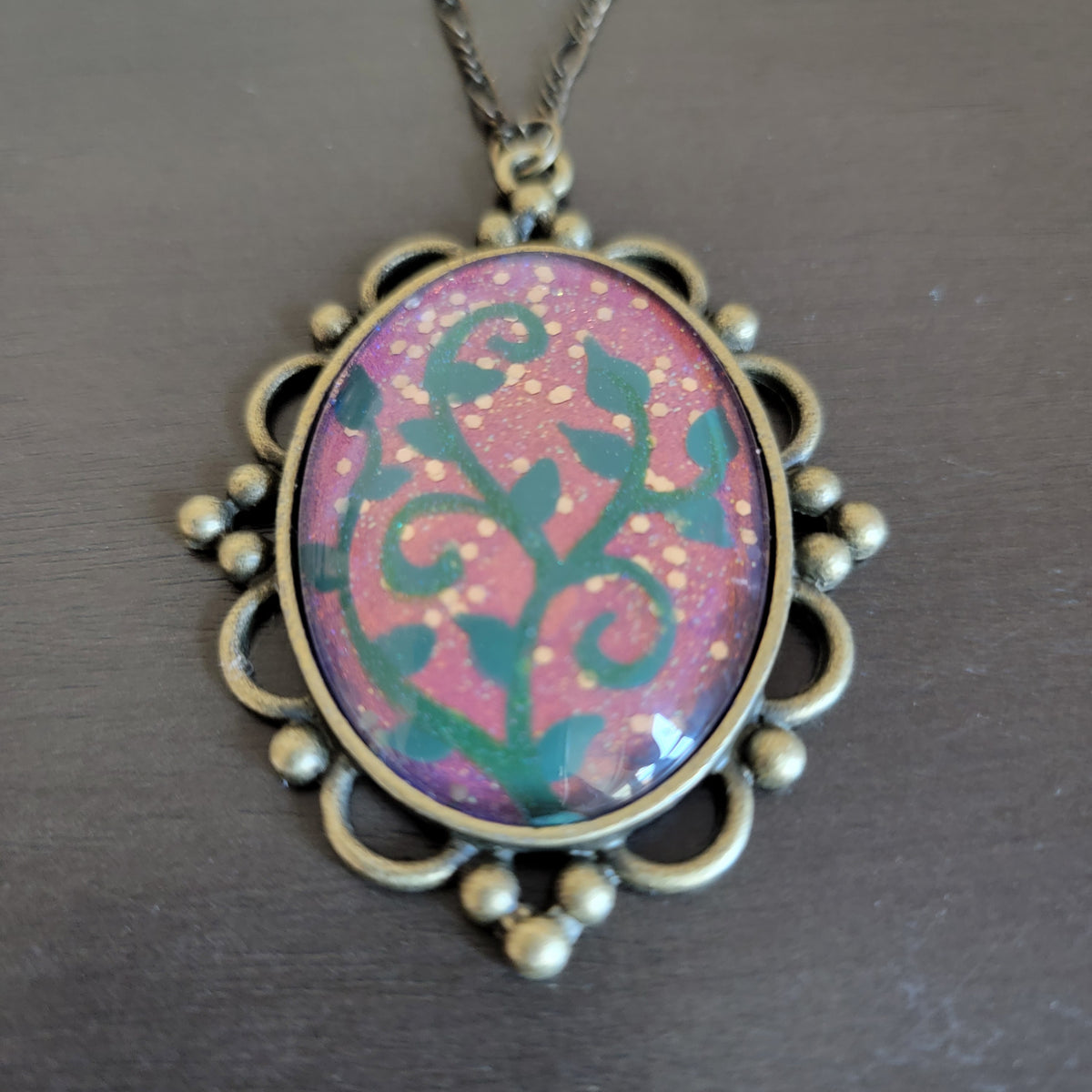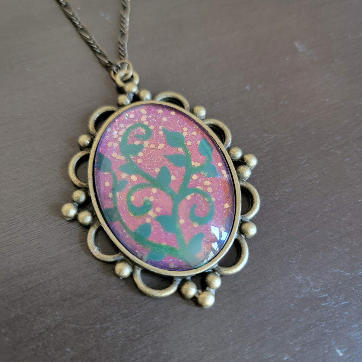 A one of a kind hand-painted pendant featuring swirling green vines against a glittery iridescent pink background.