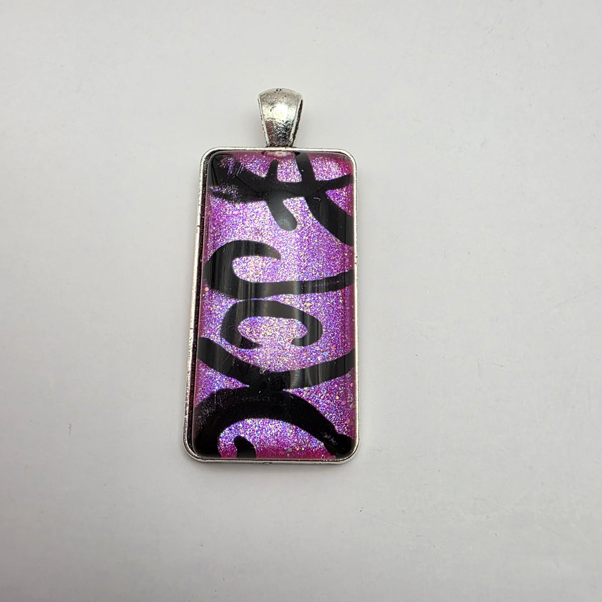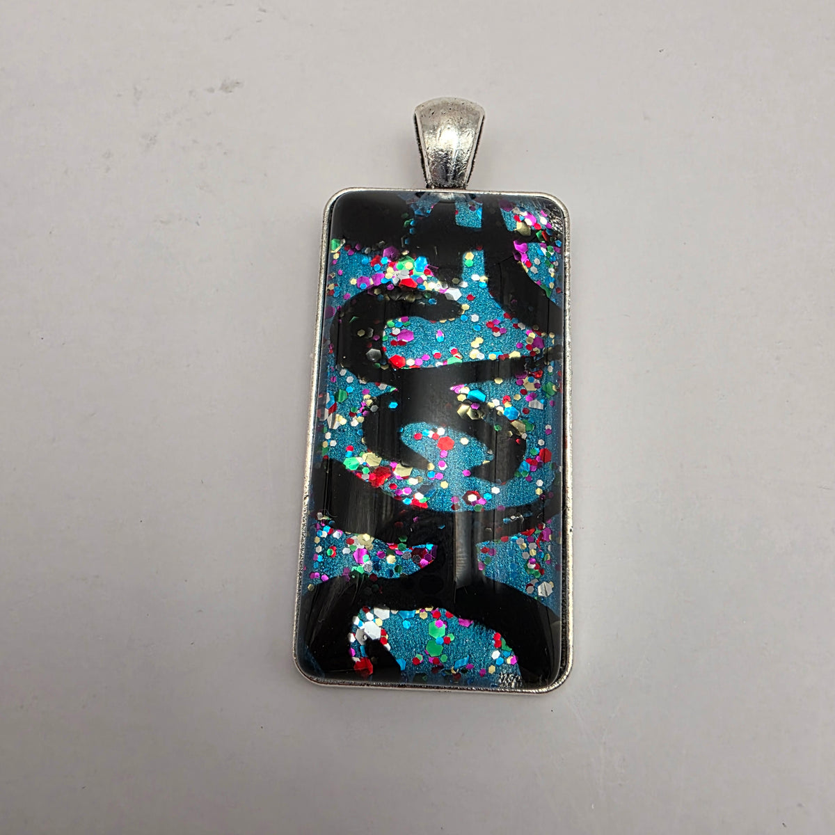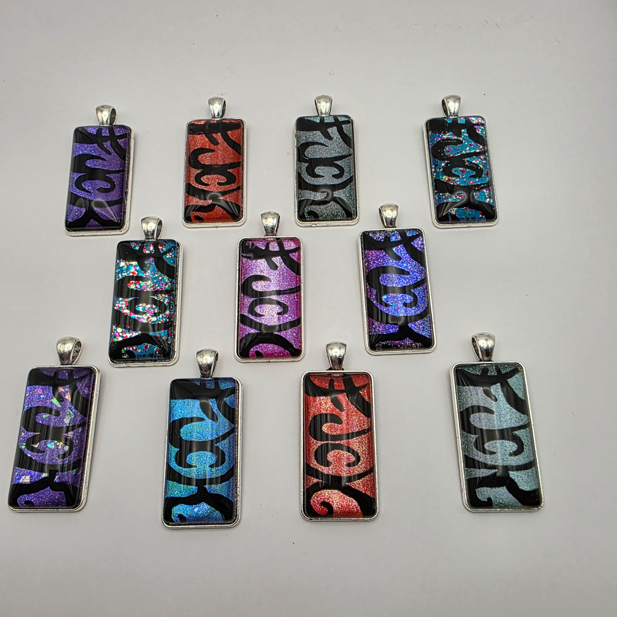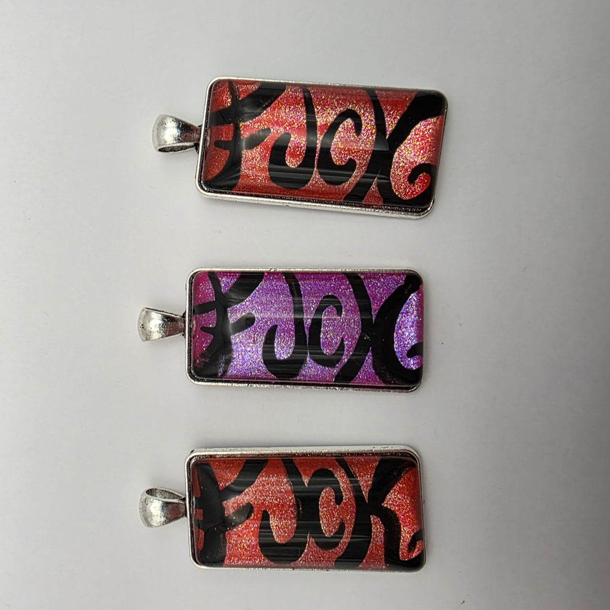 A pendant featuring the word fuck painted in swirling letters against colorful backgrounds, set in a simple silver toned tray. The perfect necklace for when you'd like to scream into the void or only have one fuck left to give. Great for anytime, really. Pick your favorite color from the bunch!