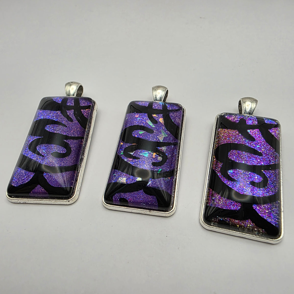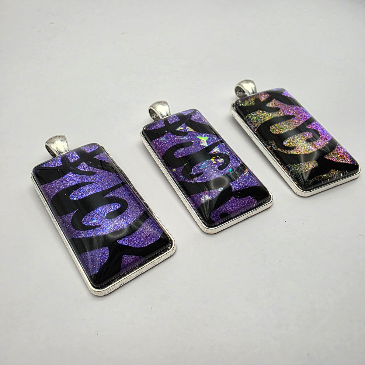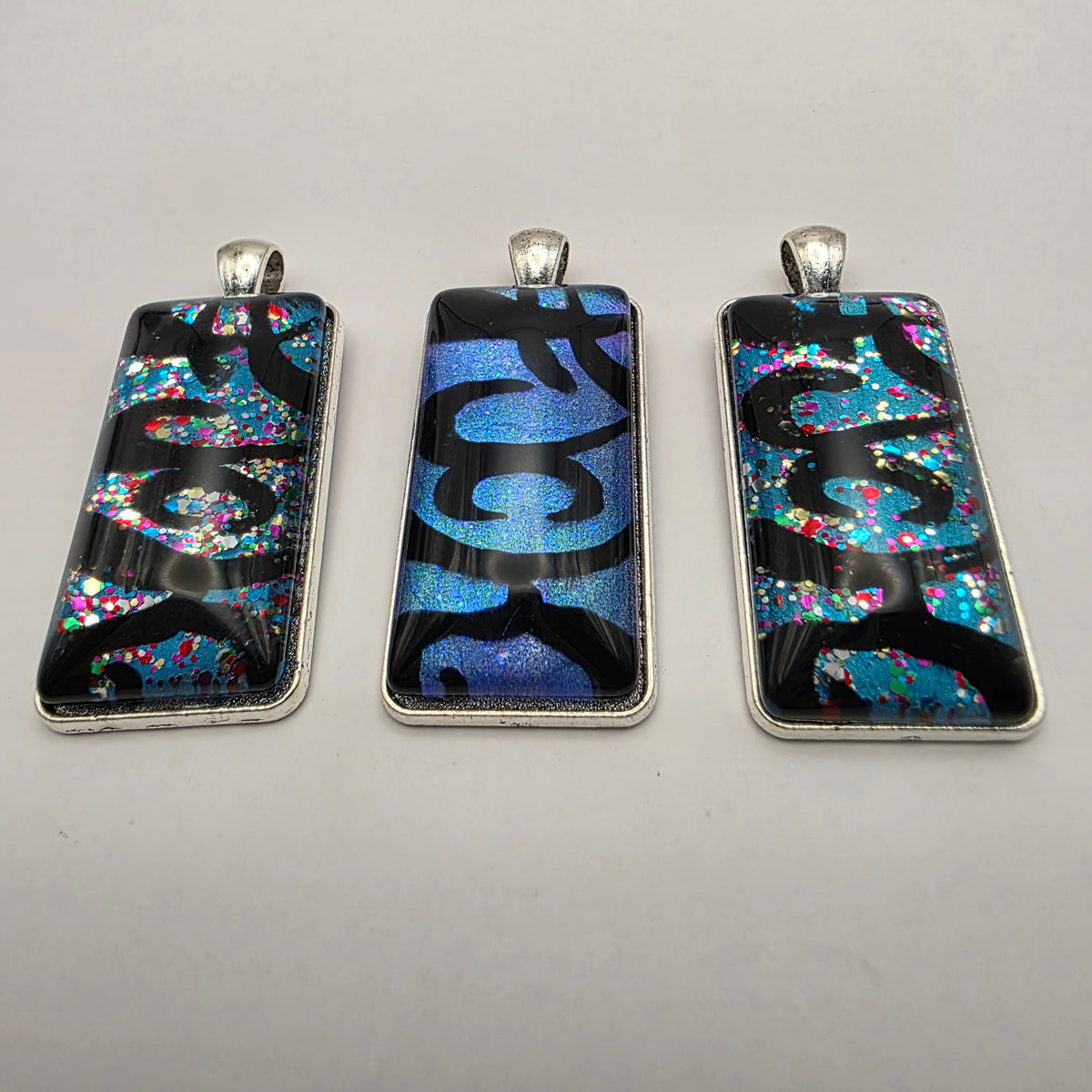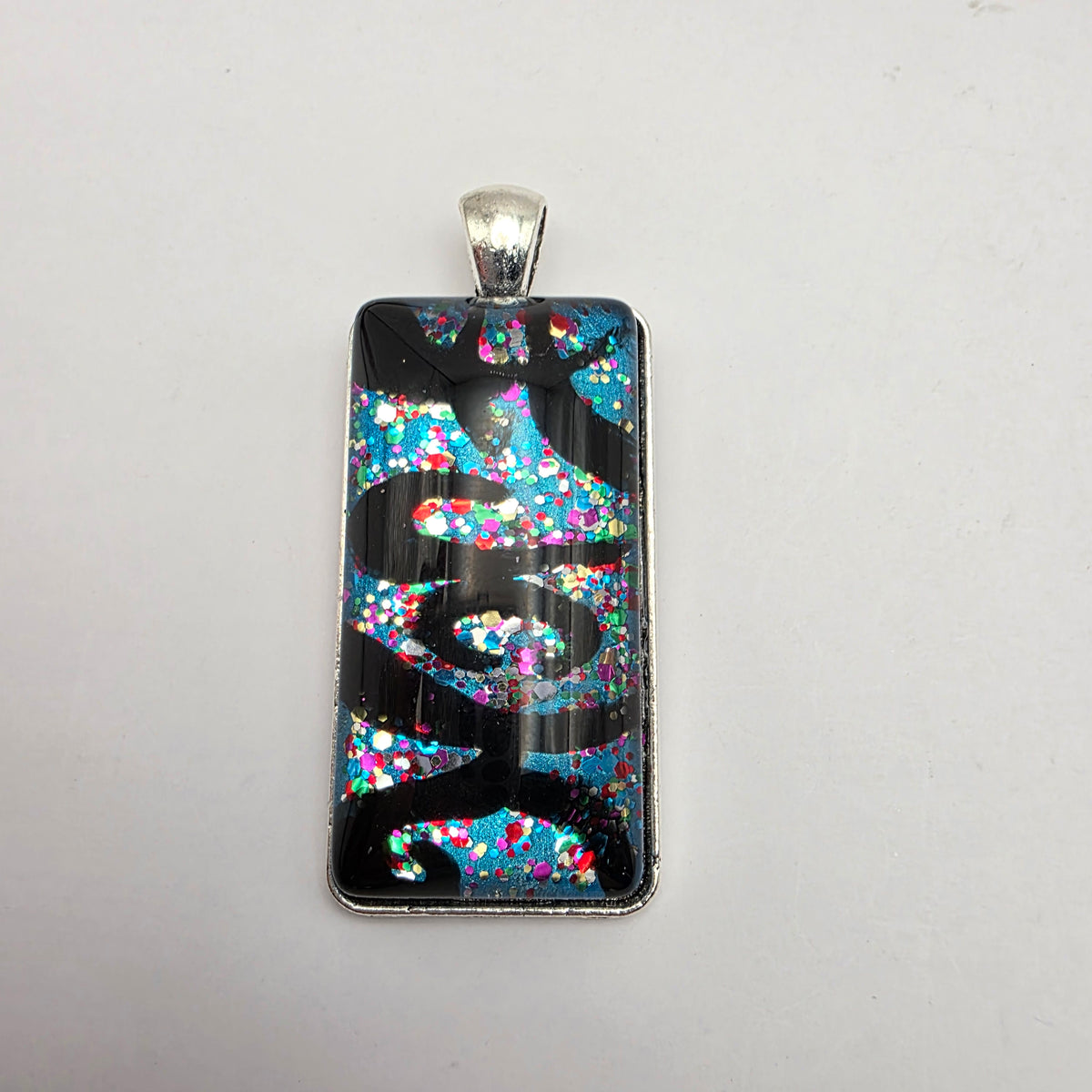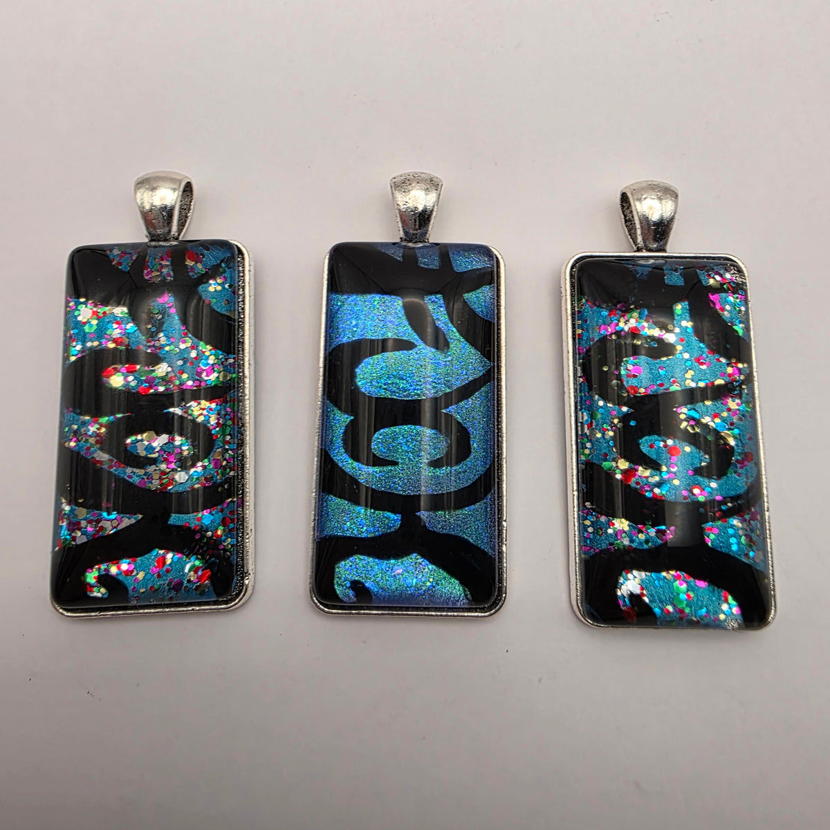 A pendant featuring the word fuck painted in swirling letters against colorful backgrounds, set in a simple silver toned tray. The perfect necklace for when you'd like to scream into the void or only have one fuck left to give. Great for anytime, really. Pick your favorite color from the bunch!