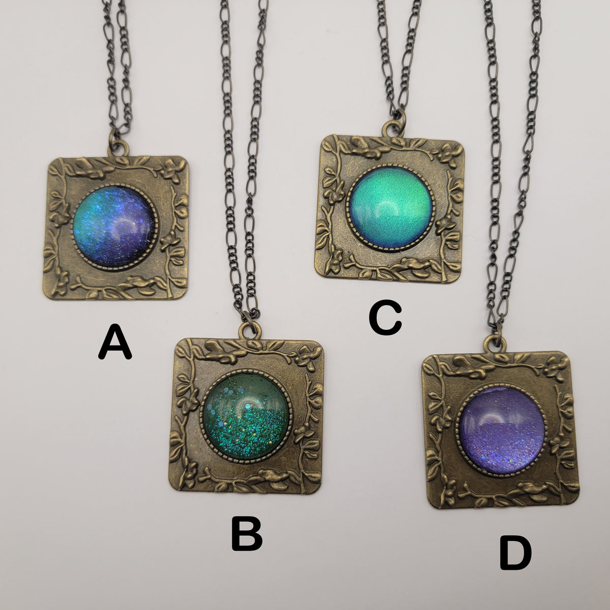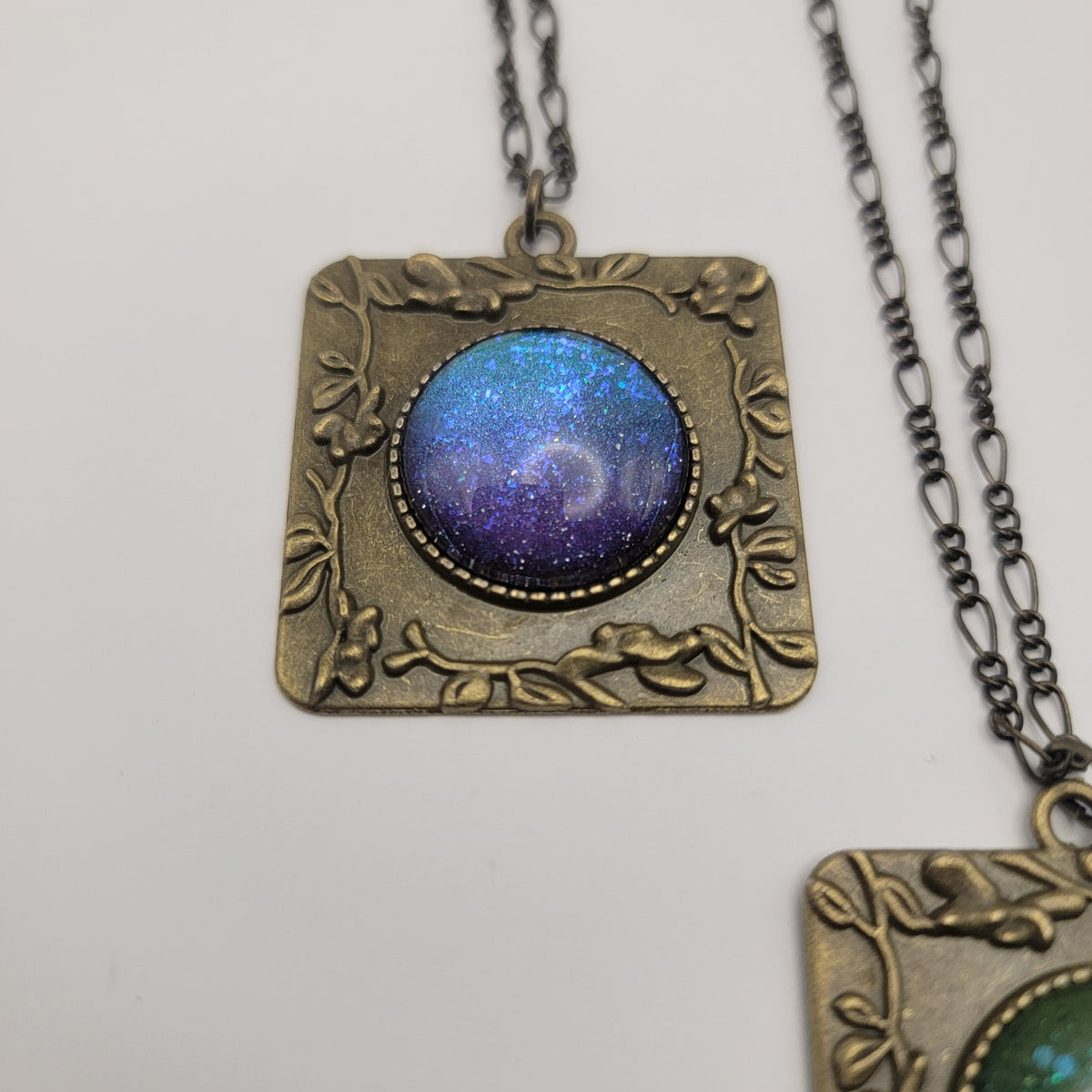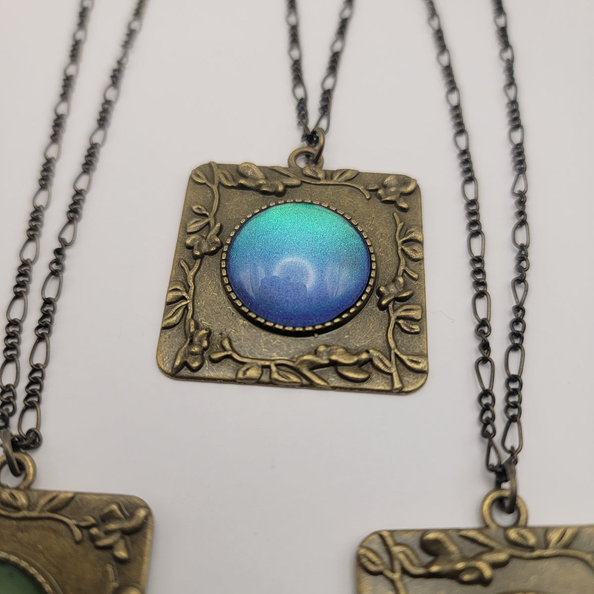 Hand painted cabochons set in lovely trays decorated with vines. Comes on a matching 24 inch chain. Pendant measures about 1.4 inches wide.