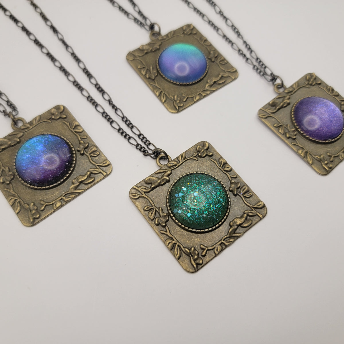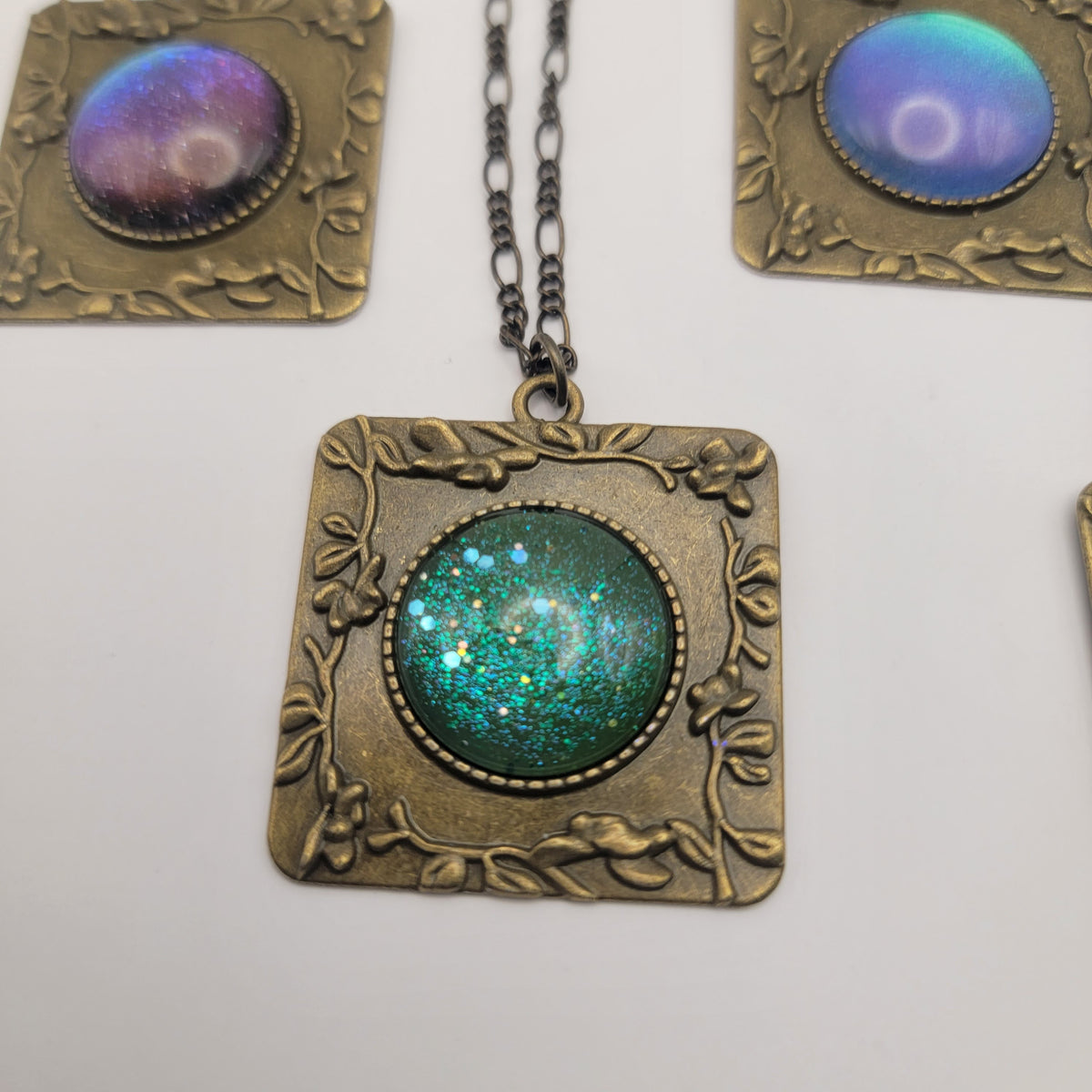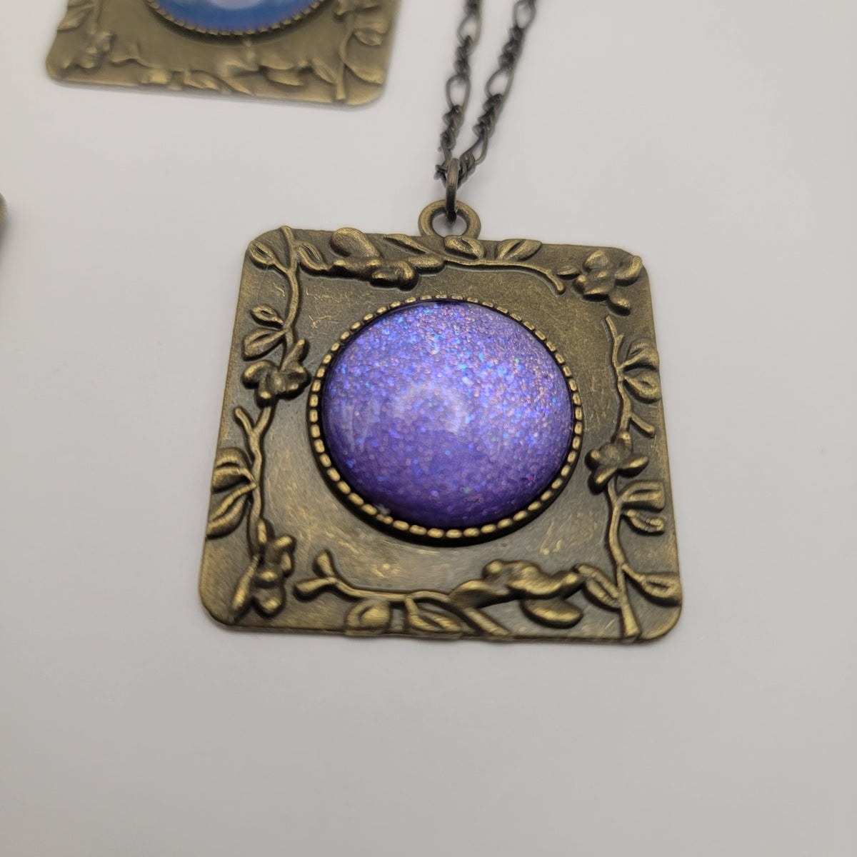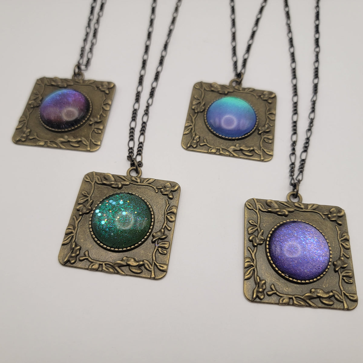 Hand painted cabochons set in lovely trays decorated with vines. Comes on a matching 24 inch chain. Pendant measures about 1.4 inches wide.