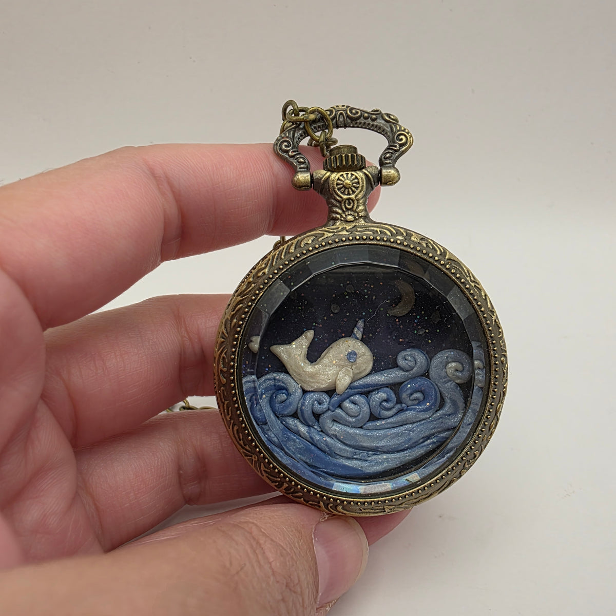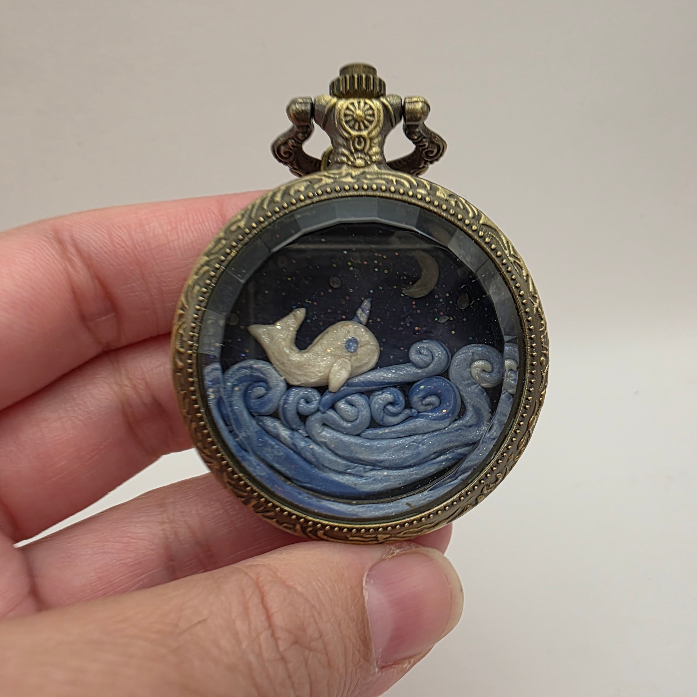 A pearl white narwhal with a blue eye and blue and white horn sitting atop swirling blue waves against a glittery night sky with a crescent moon. One of a kind miniature world, handmade with polymer clay.
