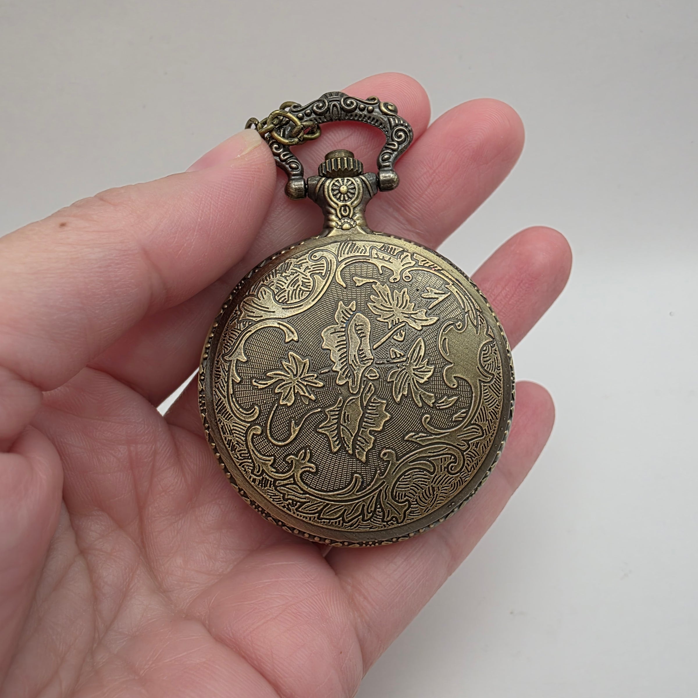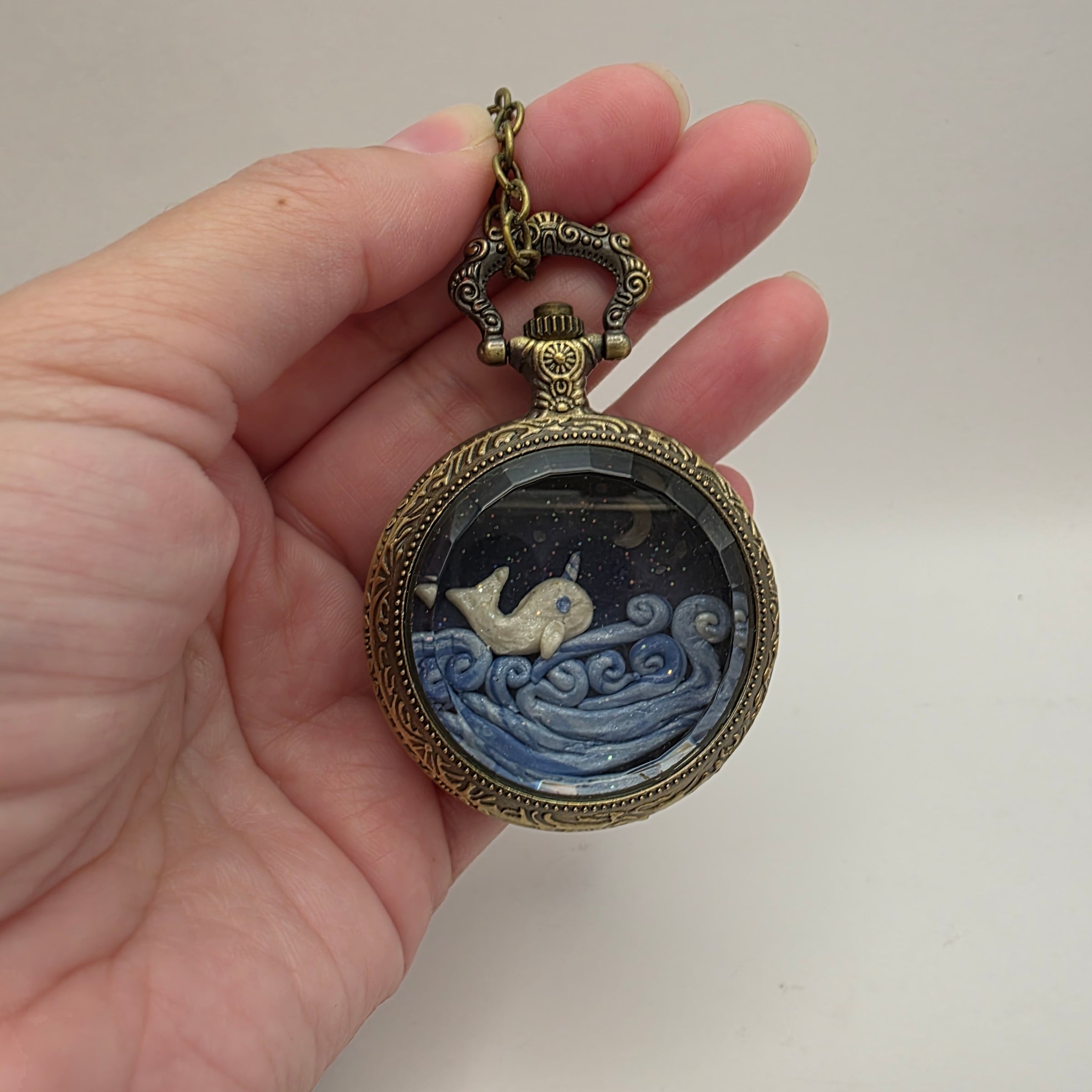 This miniature world is housed in a pocket-watch styled locket with a glass window that opens with the push of a button. The pocket watch case measures 1.5 x 2.6 inches.