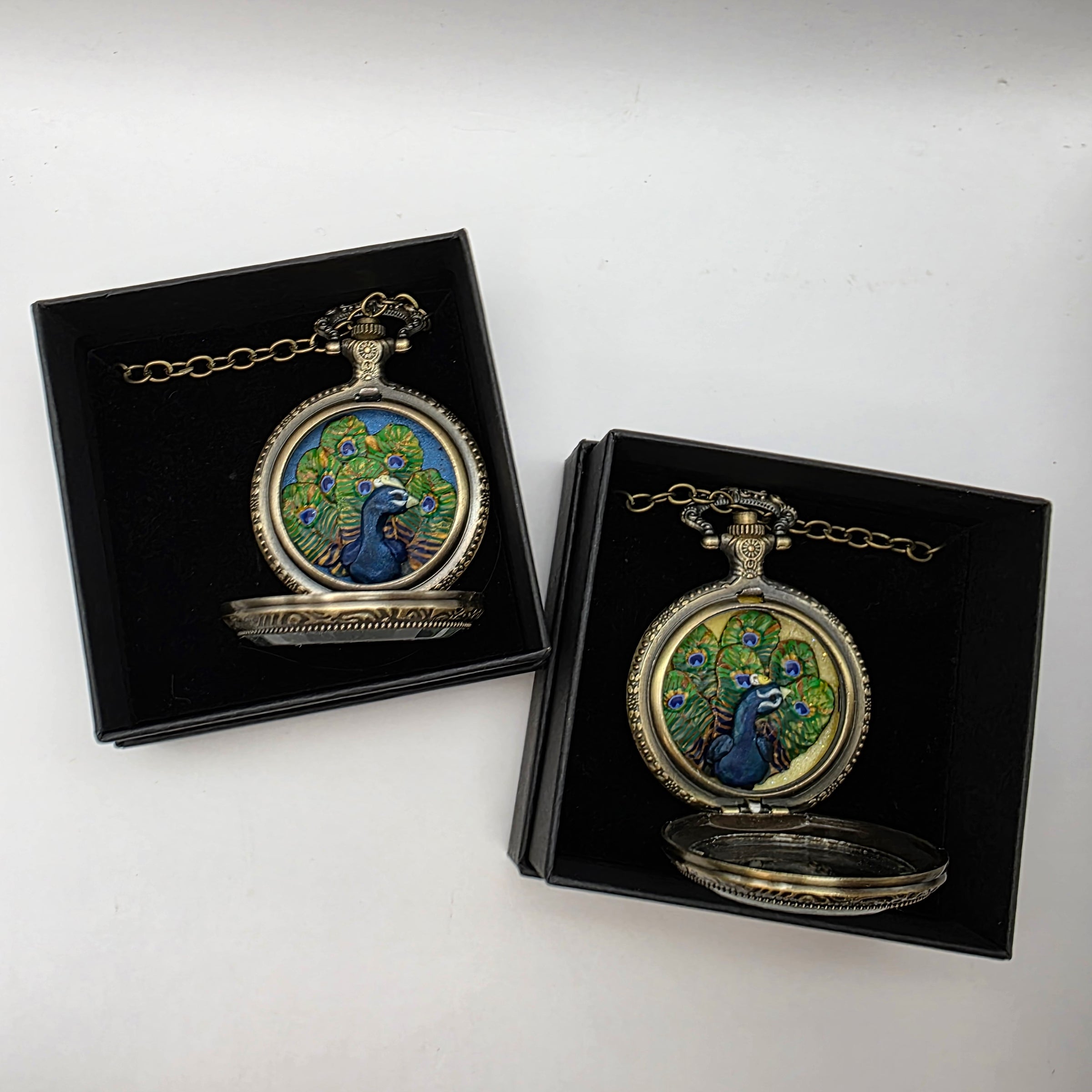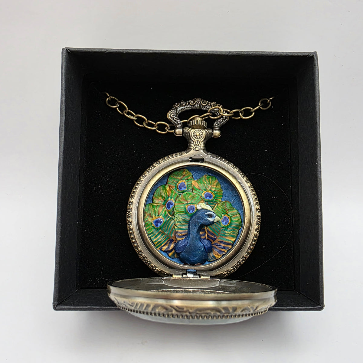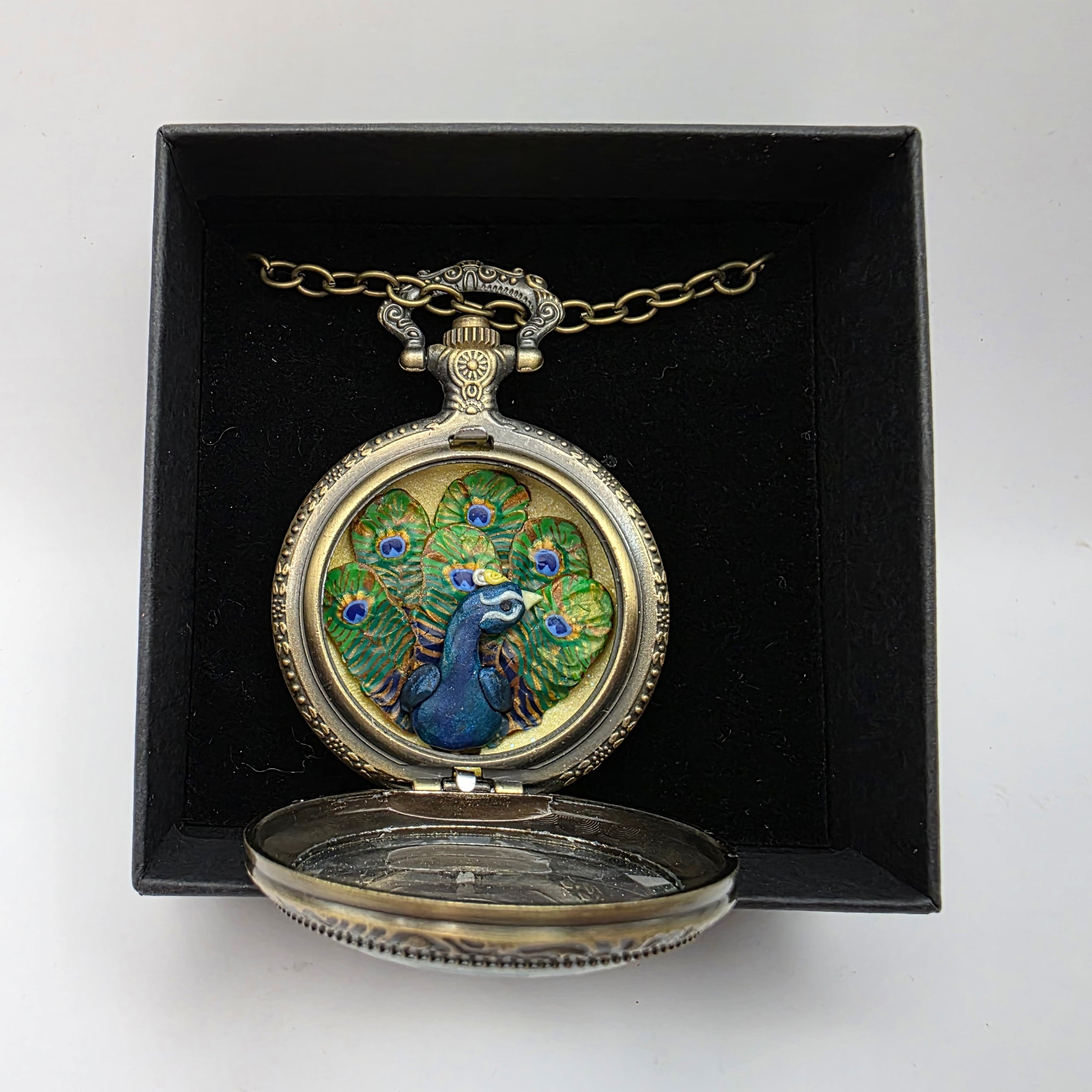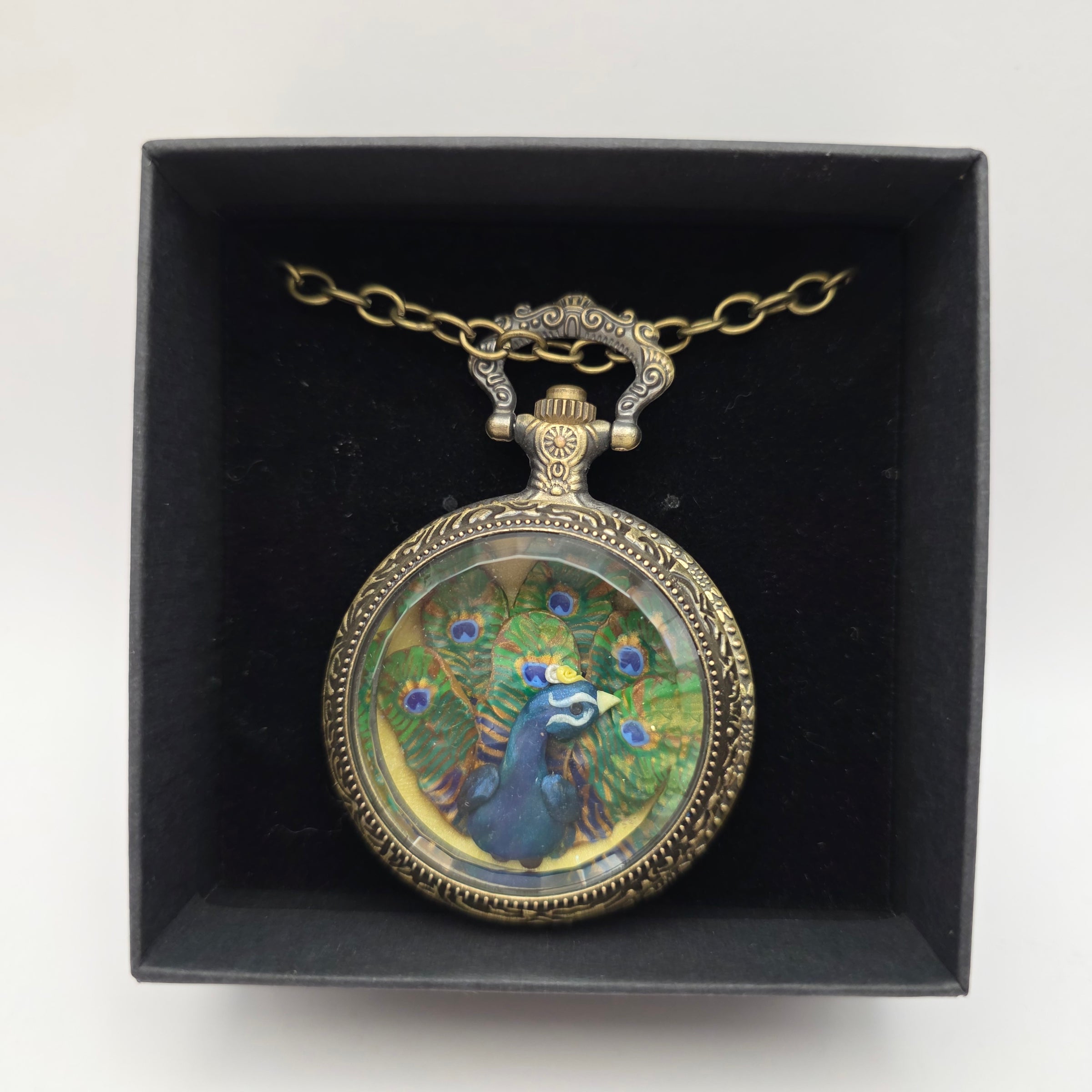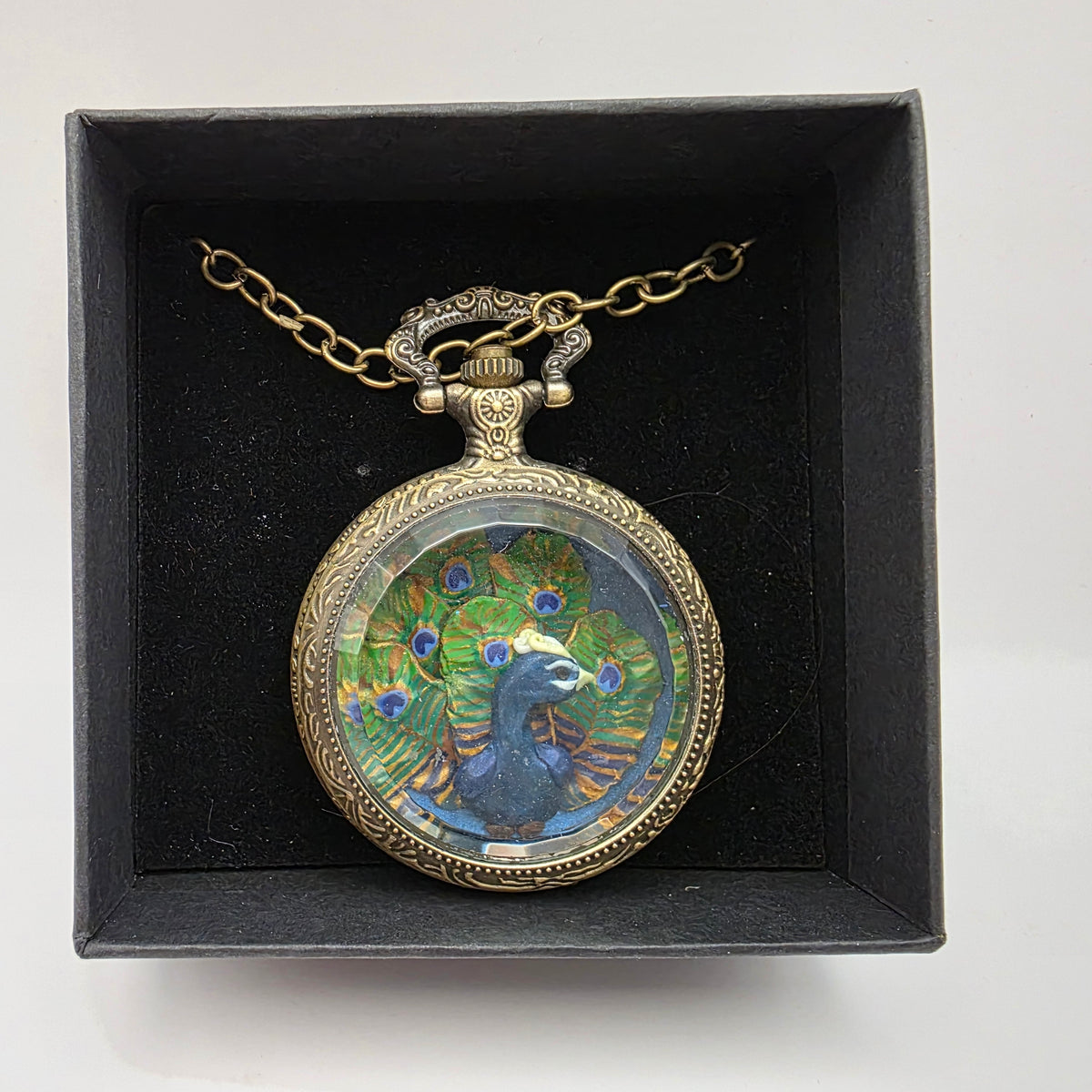 This miniature world is housed in a pocket-watch styled locket with a glass window that opens with the push of a button. The pocket watch case measures 1.5 x 2.6 inches. Comes on a matching 30 inch chain.