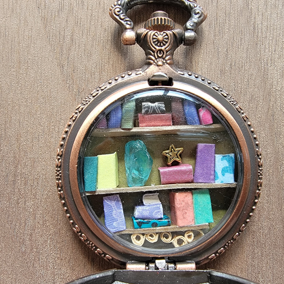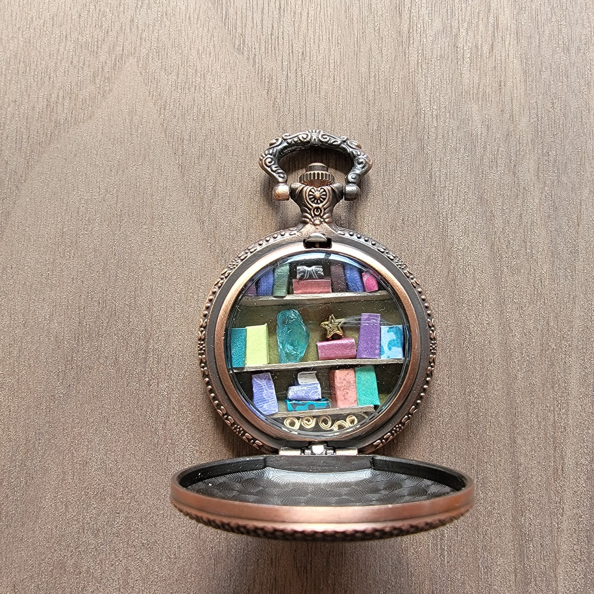 A beautiful pocket watch library in a copper colored case, featuring books, scrolls, a star, and an apatite stone.