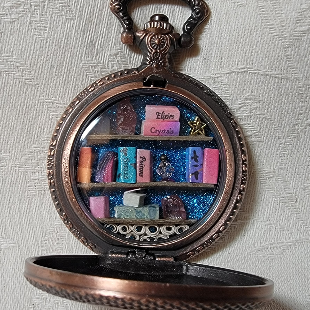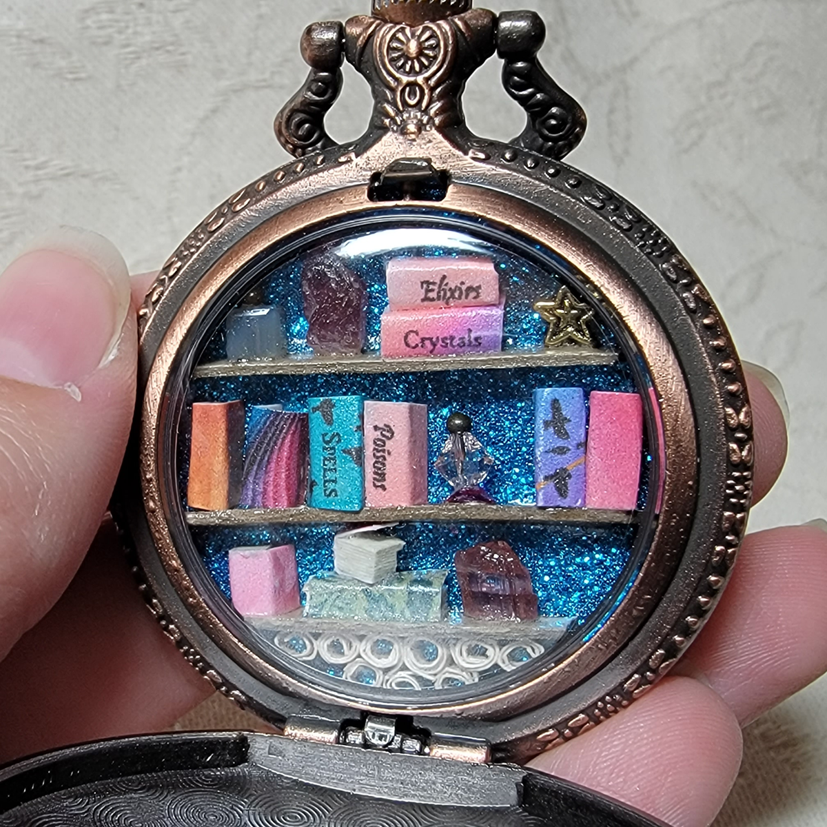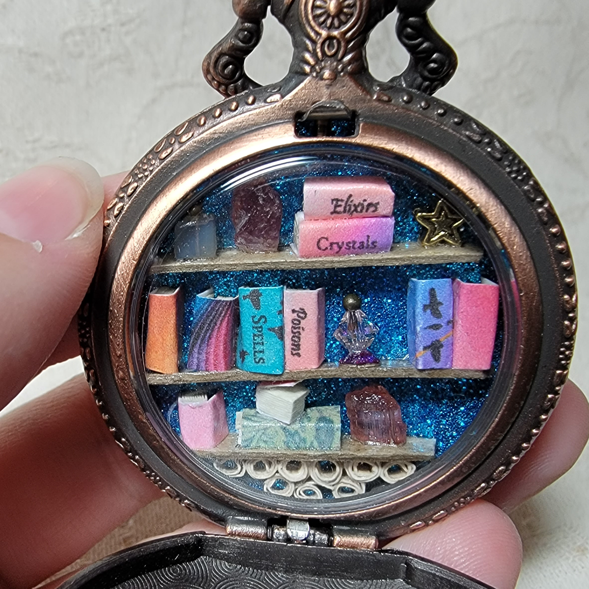 A miniature library hidden away inside of a beautiful copper toned pocket watch case. This library has potion bottles, a star, two pieces of spinel, and a whole shelf of scrolls in addition to many tiny books.  Everything is set against a sparkling blue background.