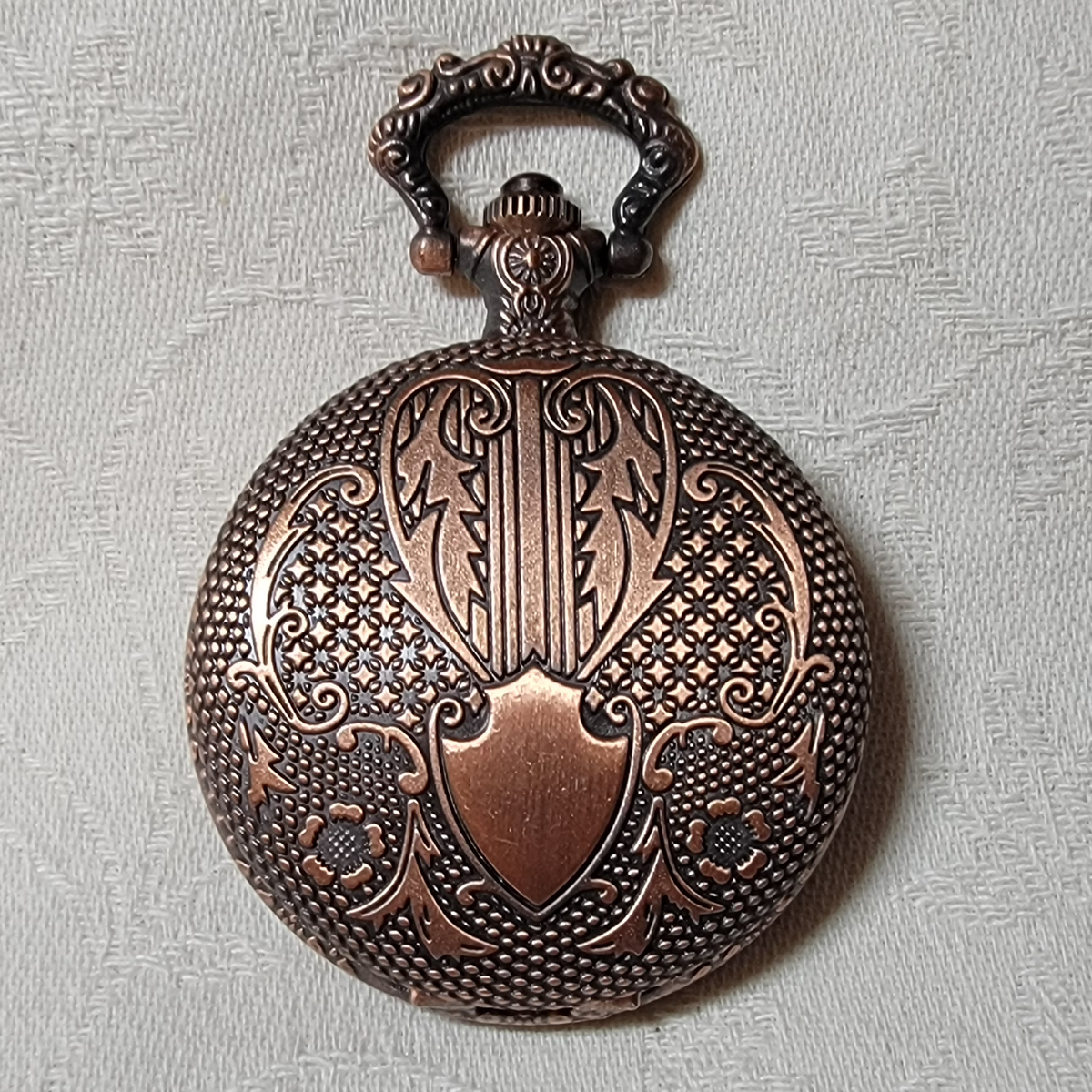 All elements are glued in place and sealed with acrylic varnish. Pocket watch cases have a diameter of 45mm (a bit under 2" see final photo of antique gold tone pocket watch case for reference).  Comes on matching chain.