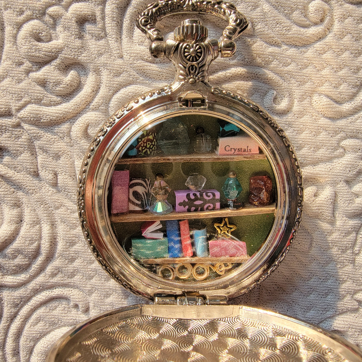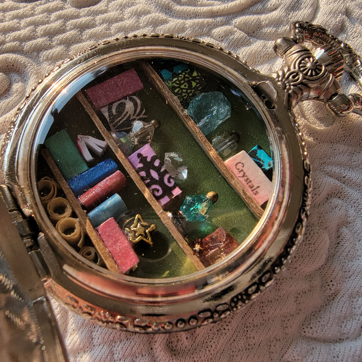 All elements are glued in place and sealed with acrylic varnish. Pocket watch cases have a diameter of 45mm (a bit under 2" see final photo of antique gold tone pocket watch case for reference). Comes on matching chain.
