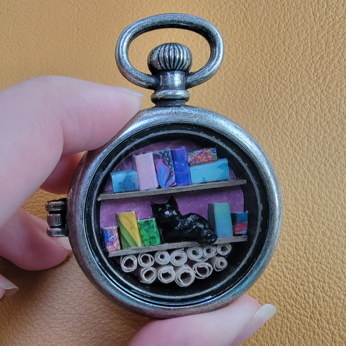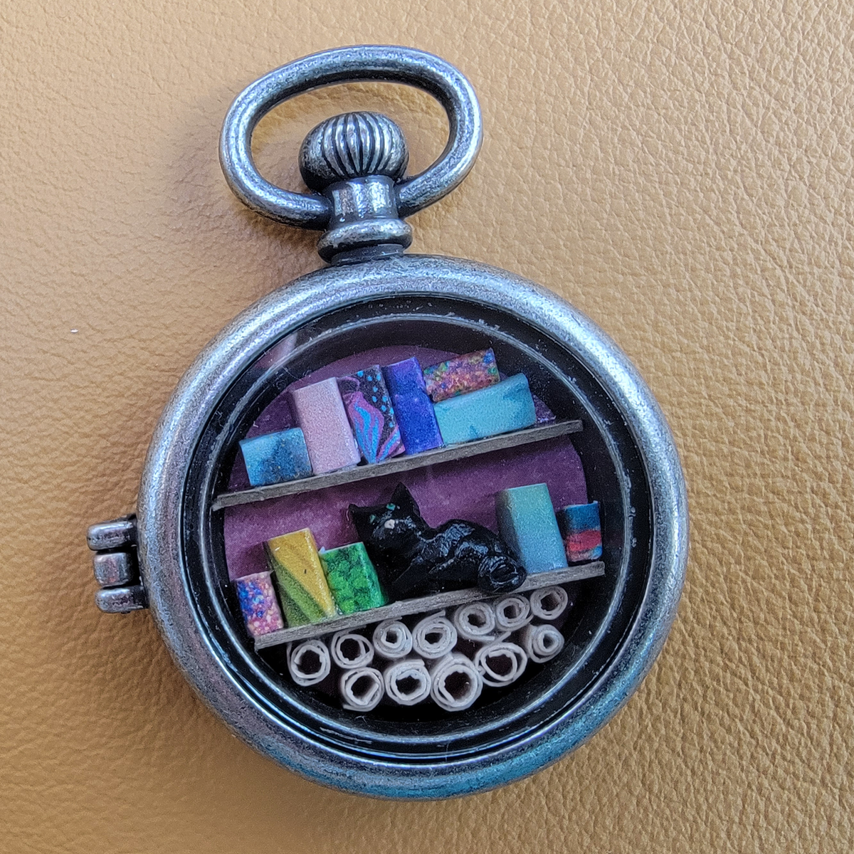 All elements are glued in place and sealed with acrylic varnish. Case is about 2 inches wide and 2.5 inches tall. Comes on matching chain.