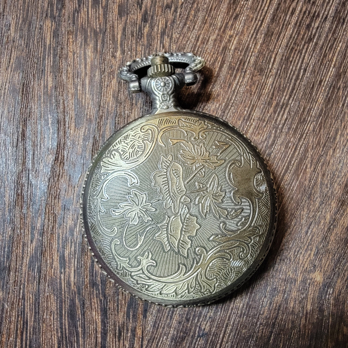 This miniature world is housed in a pocket-watch styled locket with a glass window that opens with the push of a button. The pocket watch case measures 1.5 x 2.6 inches.