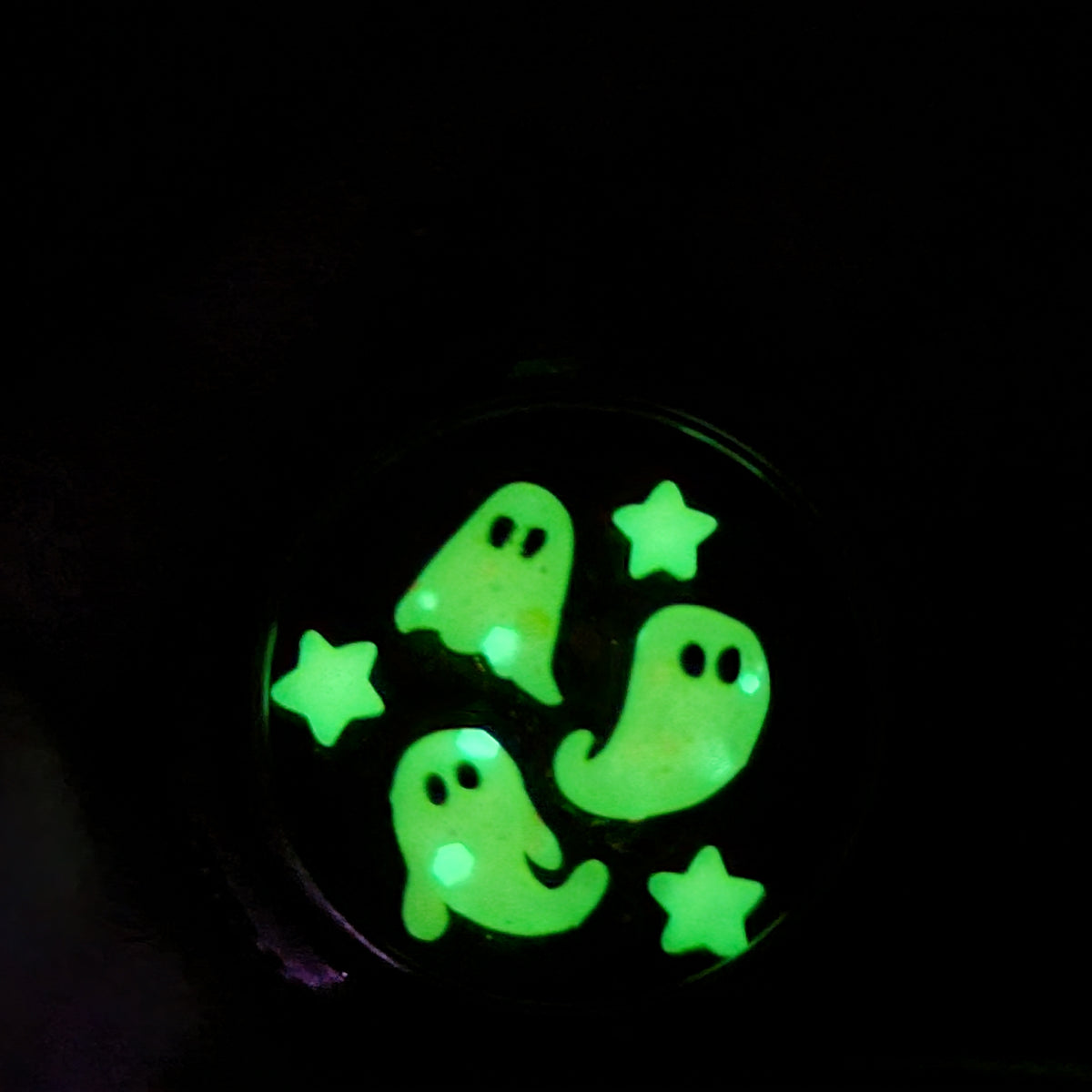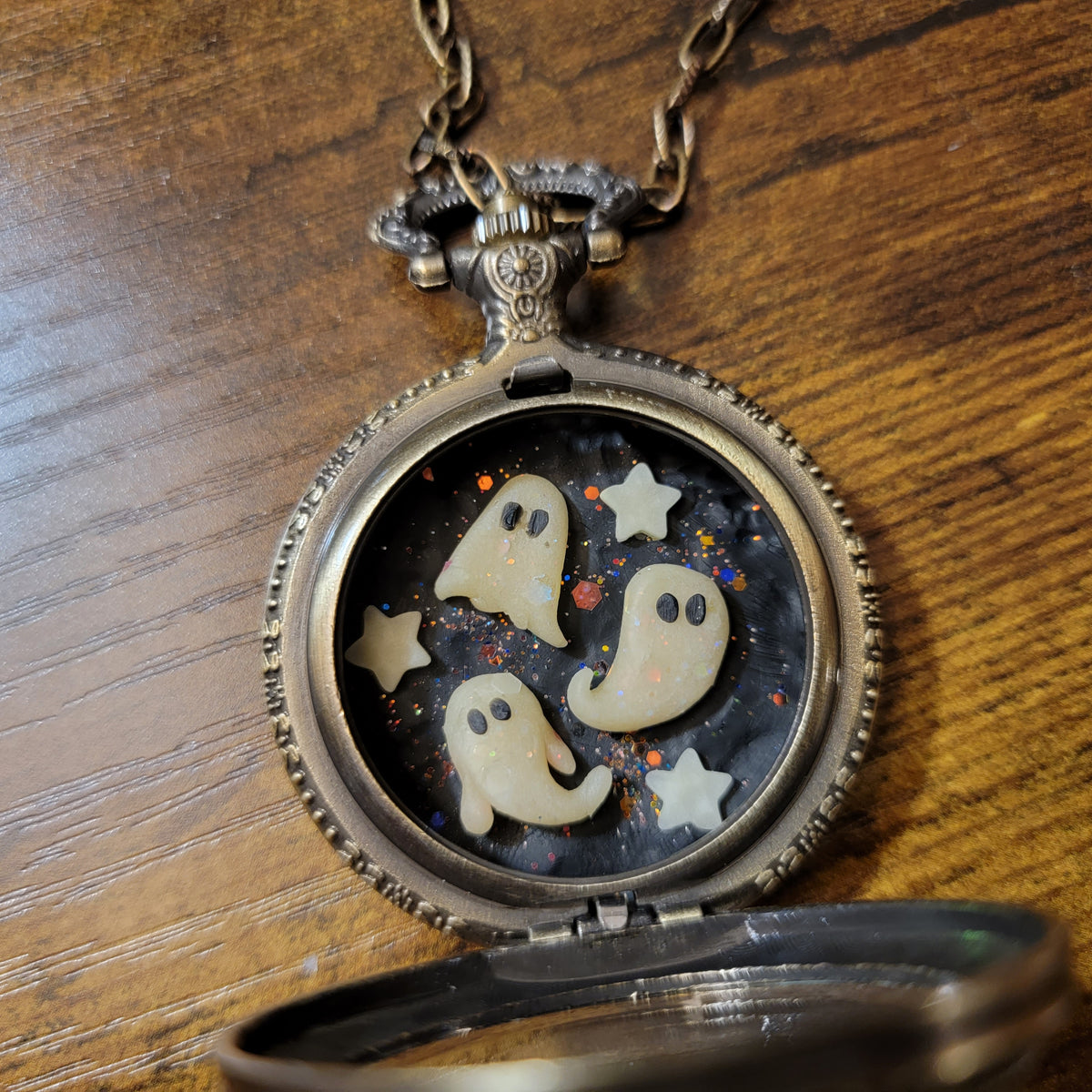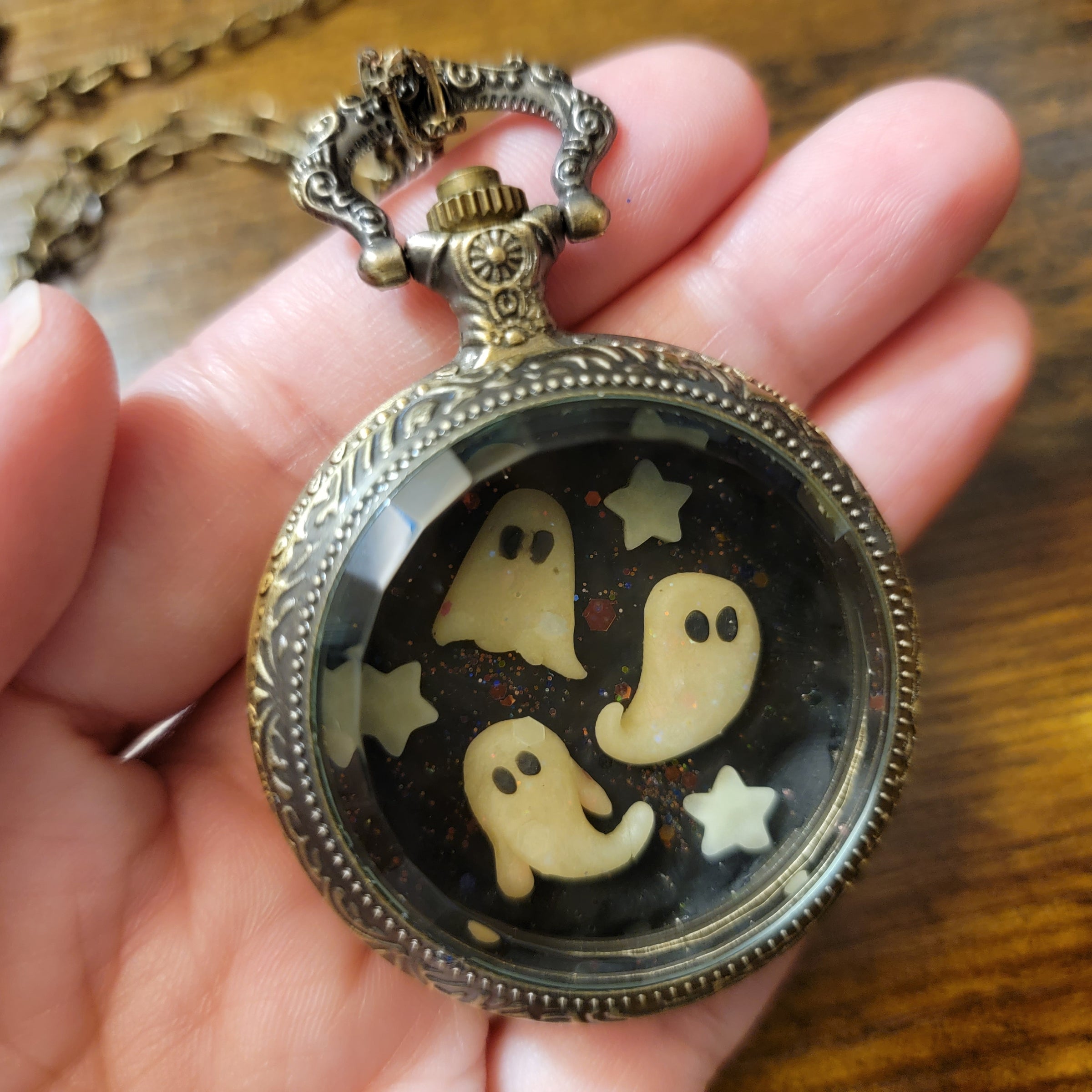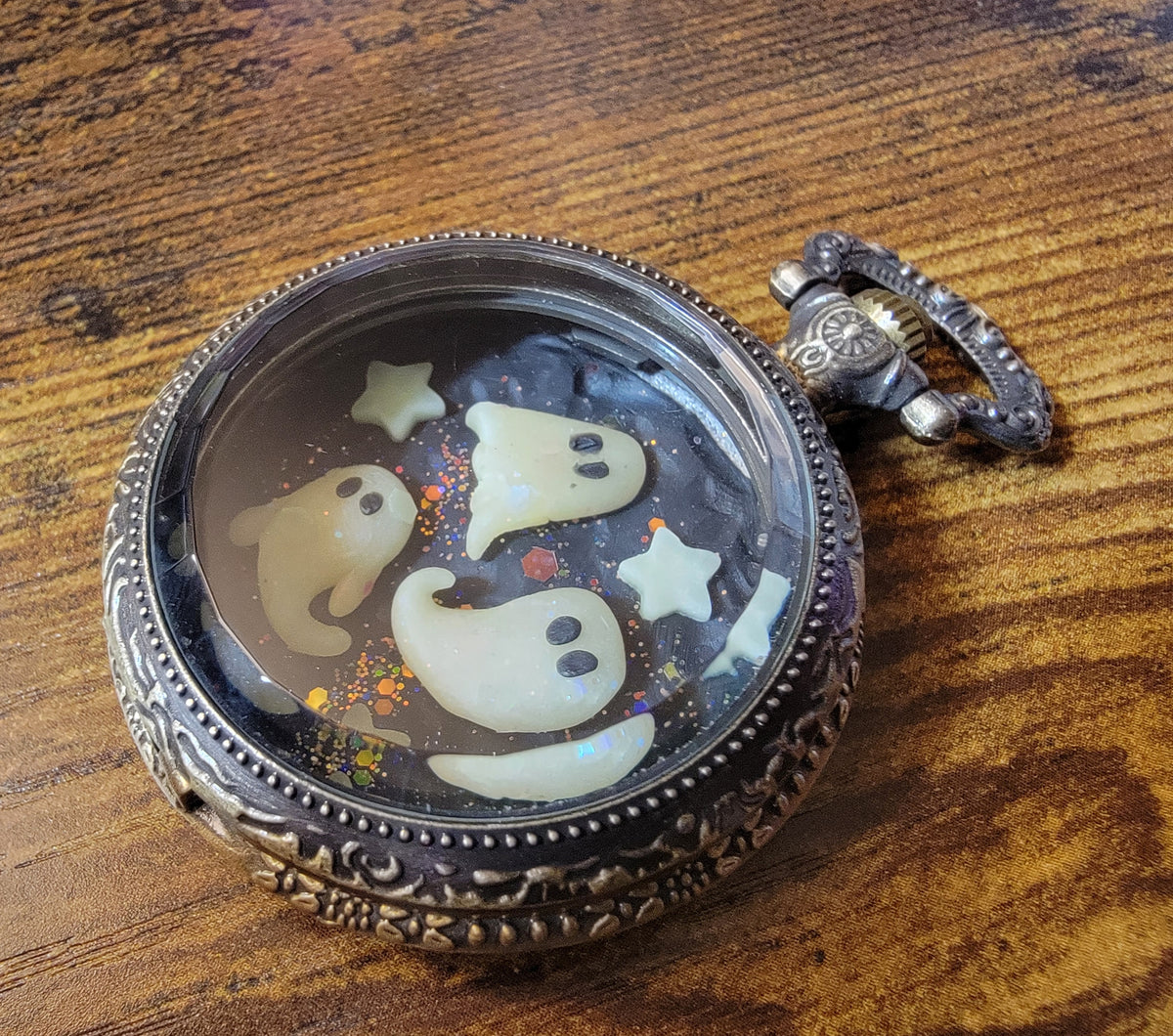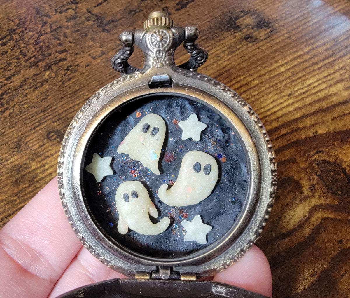 Three glowing ghosts in a pocket watch with glowing stars and a glitter background. One of a kind miniature world, handmade with polymer clay.
