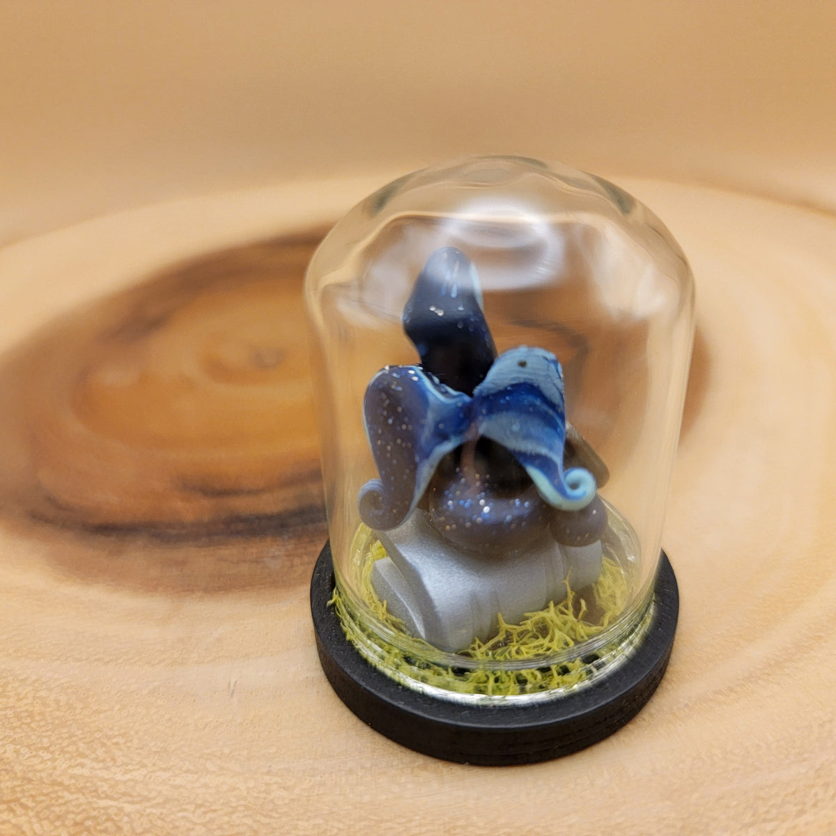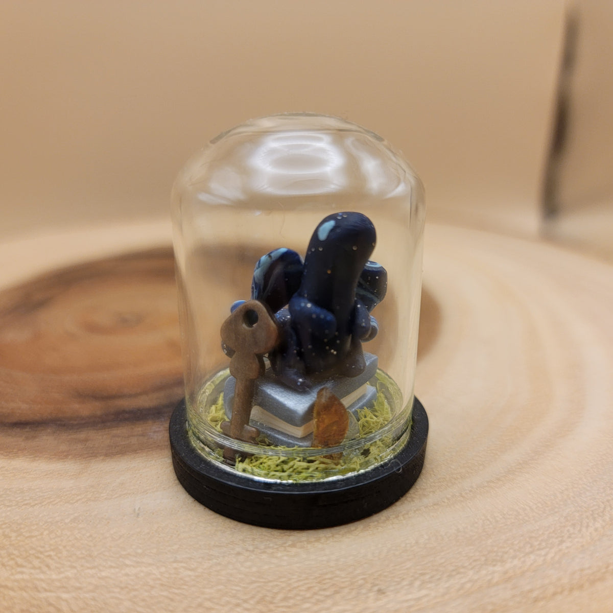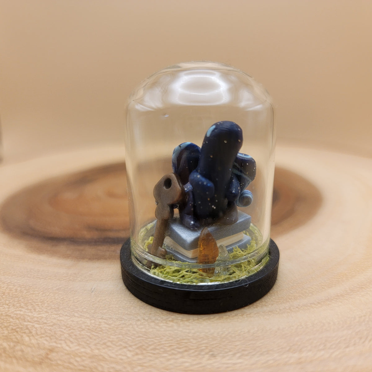A miniature dome with a tiny book with a sparkle blue midnight dragon sitting on top of it. There is also a tiny key leaning against the book, and a tiny stone. There is moss around the base of the dome surrounding the book and dragon. The book and dragon were made by hand out of polymer clay.
