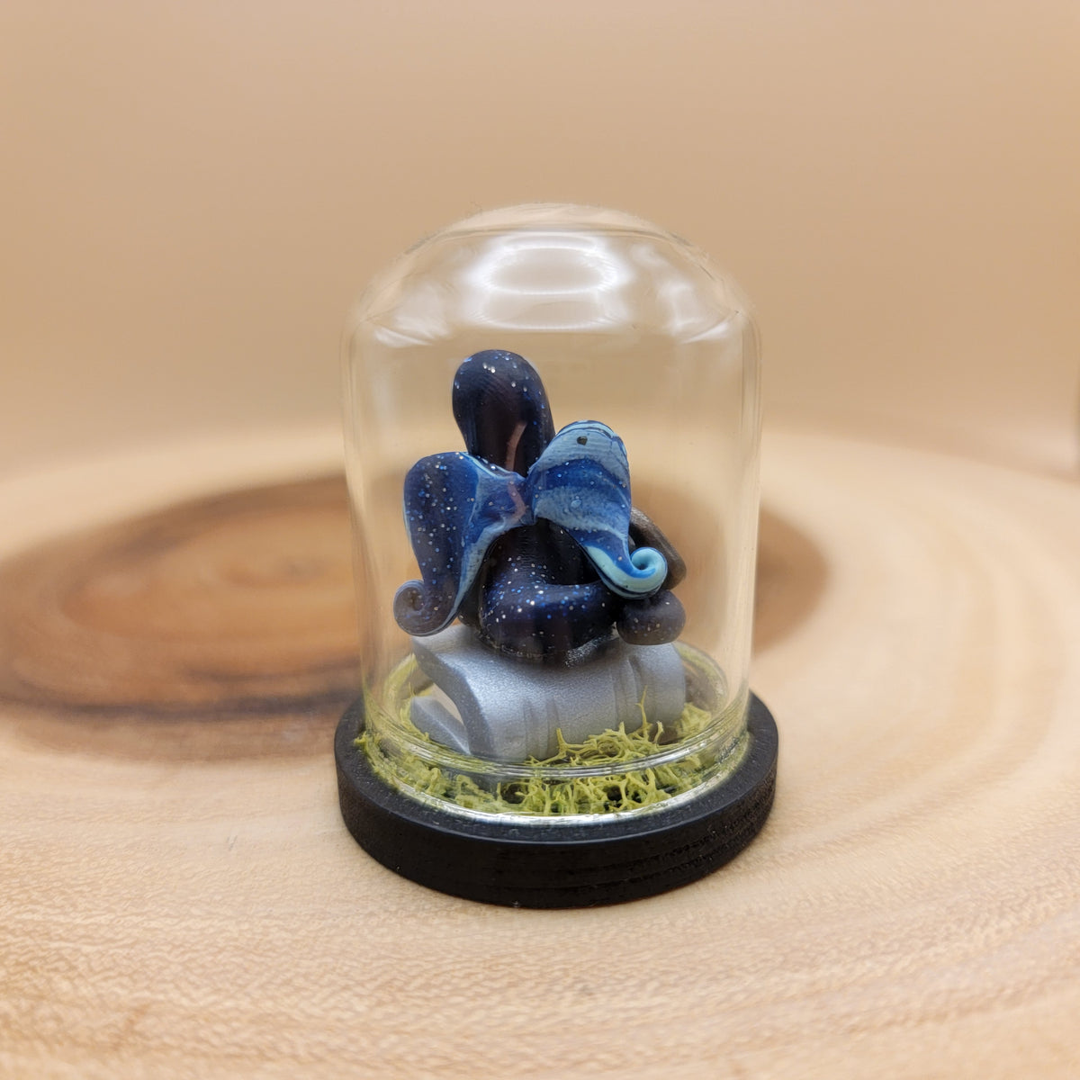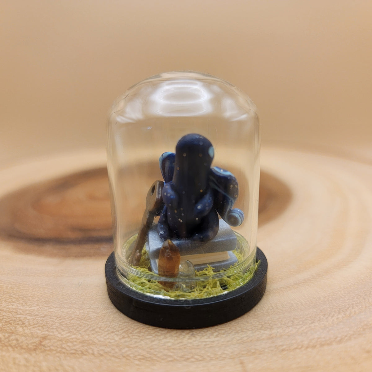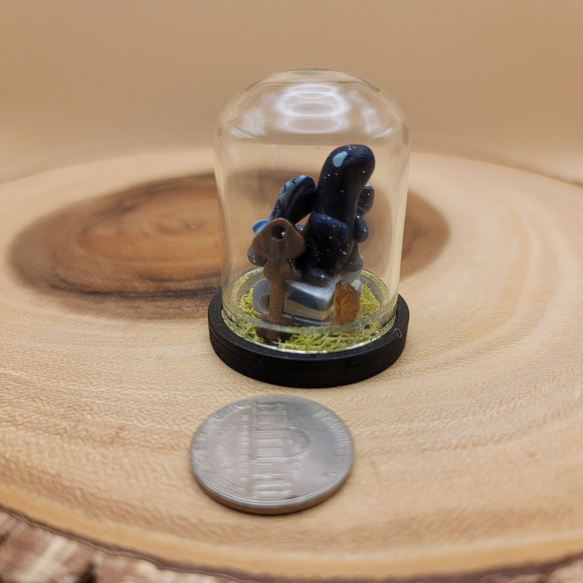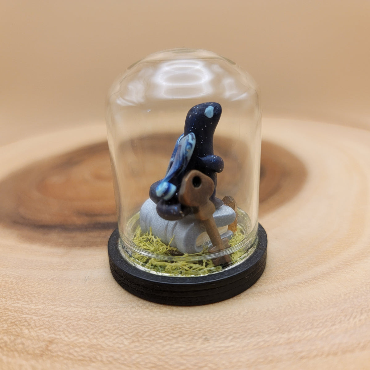 A miniature dome with a tiny book with a sparkle blue midnight dragon sitting on top of it. There is also a tiny key leaning against the book, and a tiny stone. There is moss around the base of the dome surrounding the book and dragon. The book and dragon were made by hand out of polymer clay.