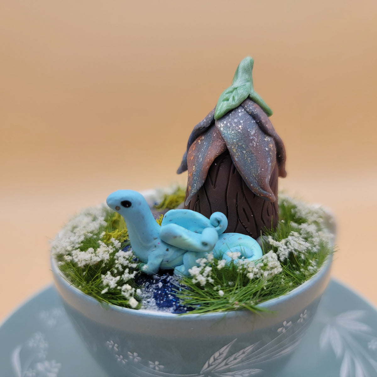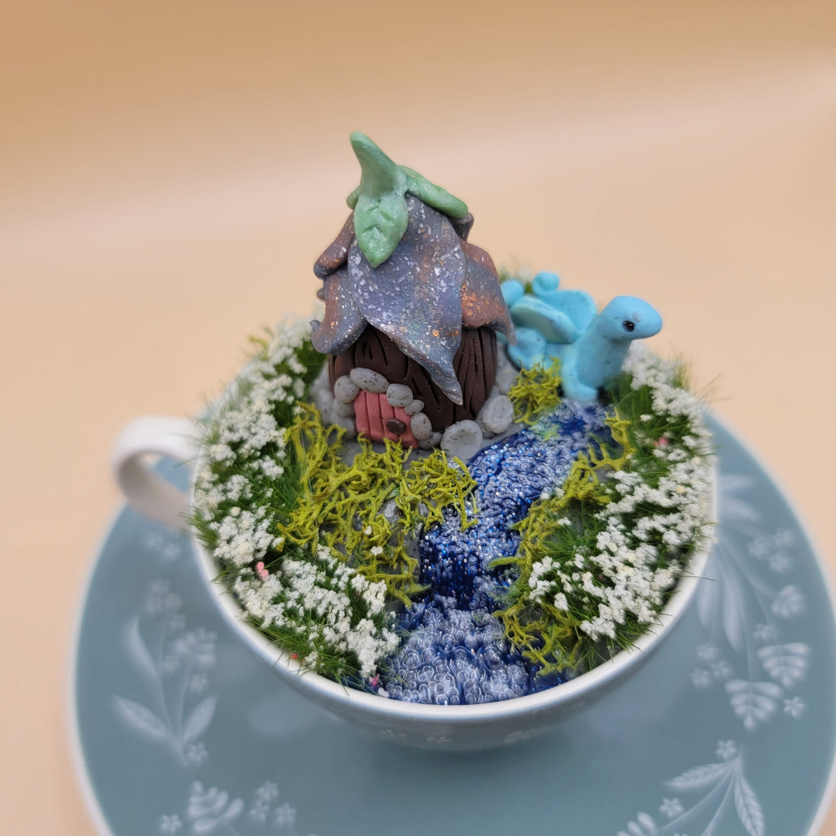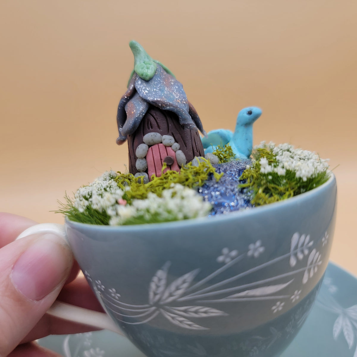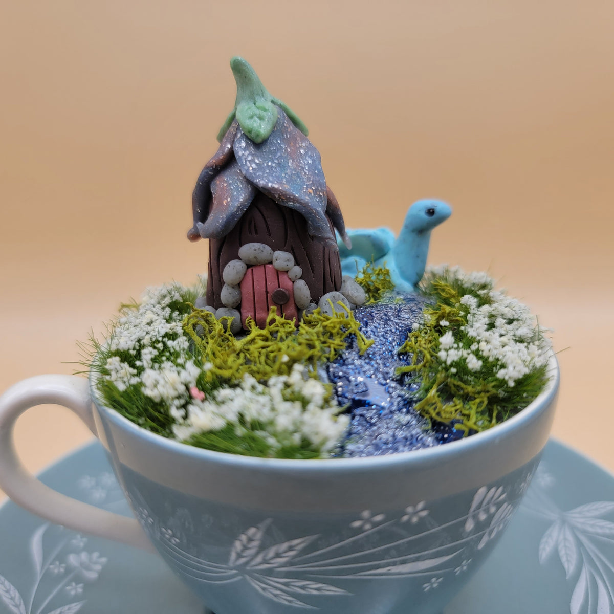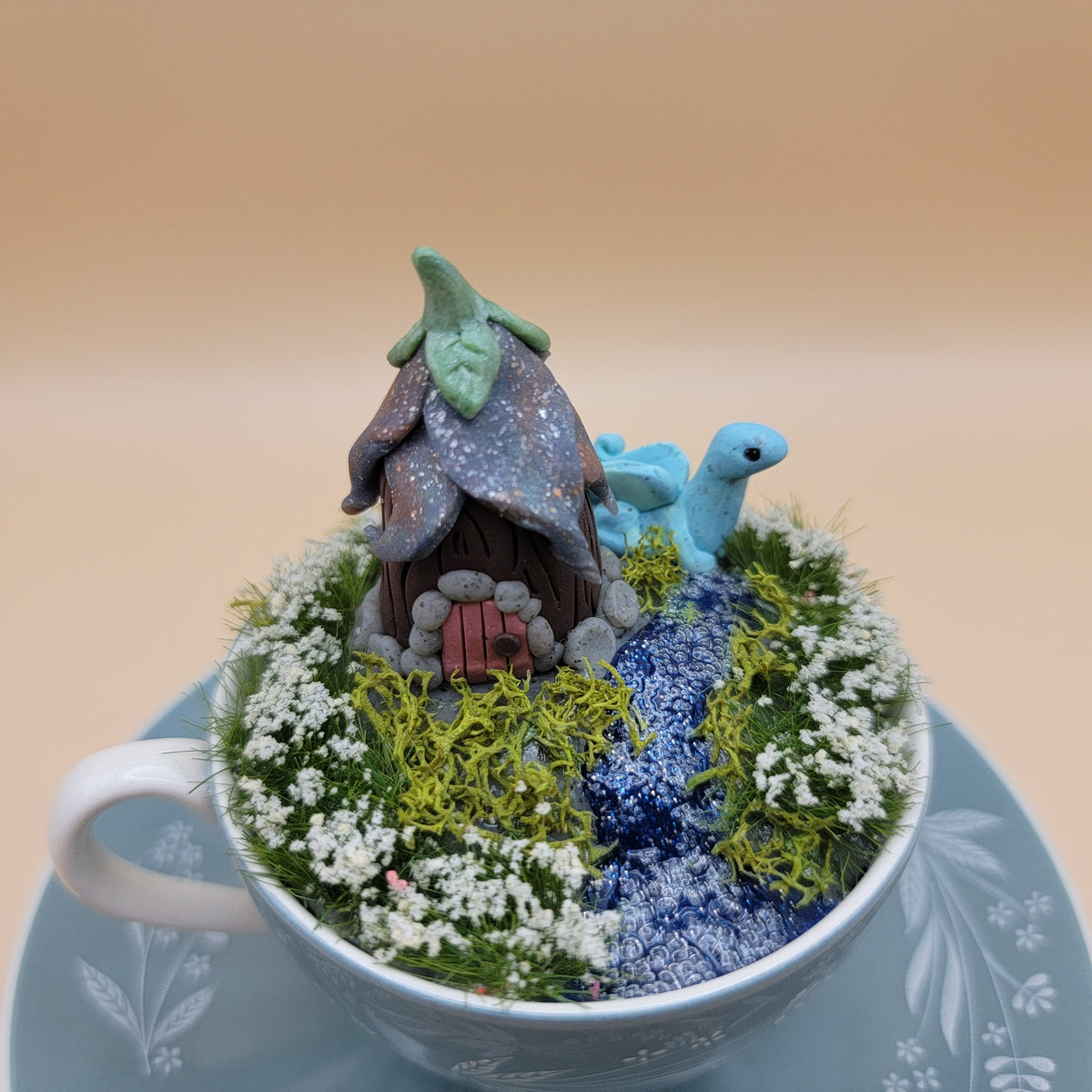 A demitasse teacup turned into a miniature world.  This little fairy house is being guarded by a turquoise dragon sitting in a sparkling stream.  Foxes and fairy house were made by hand out of polymer clay.