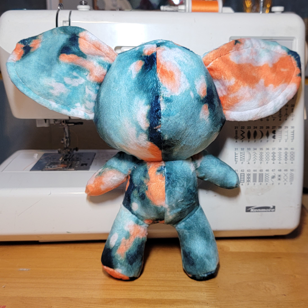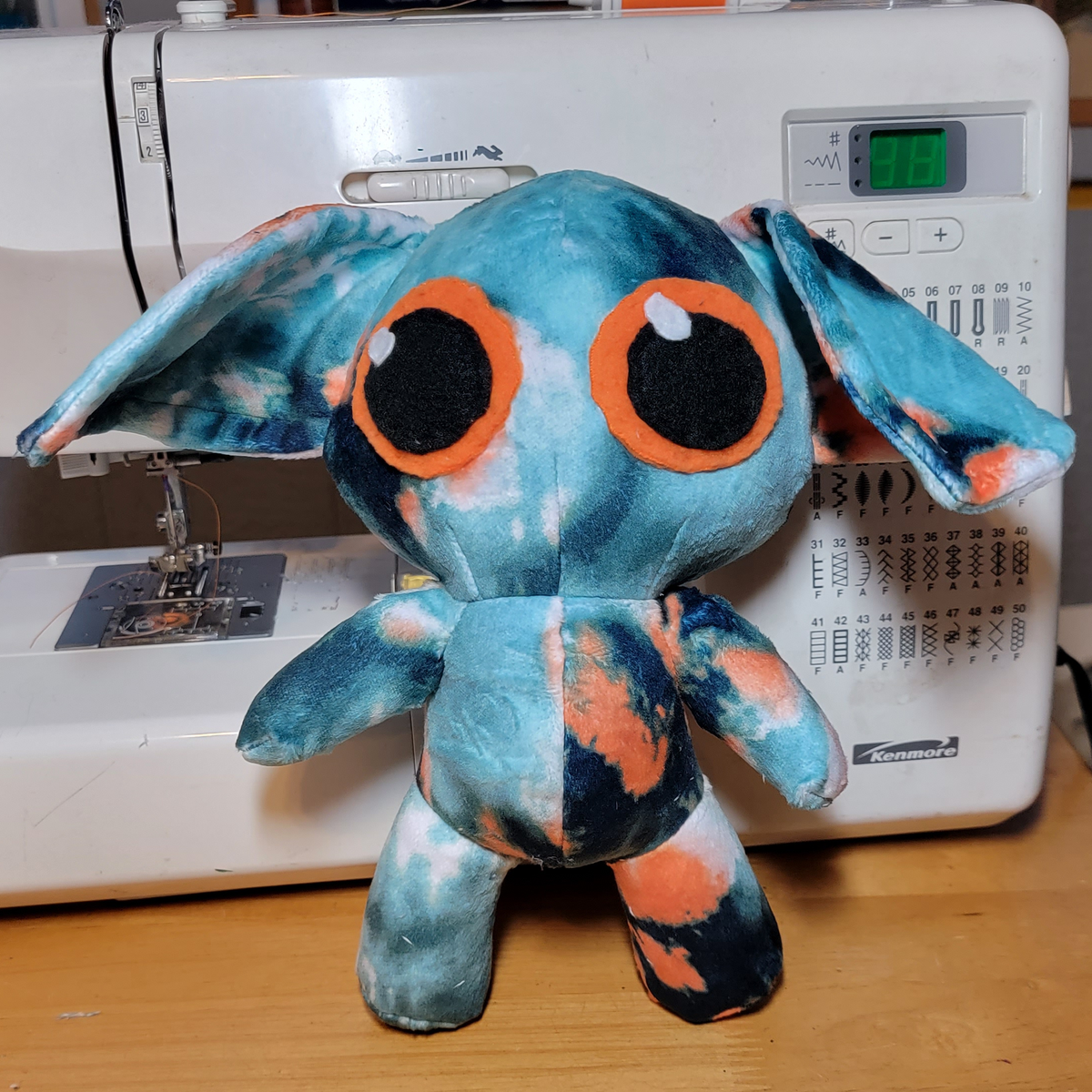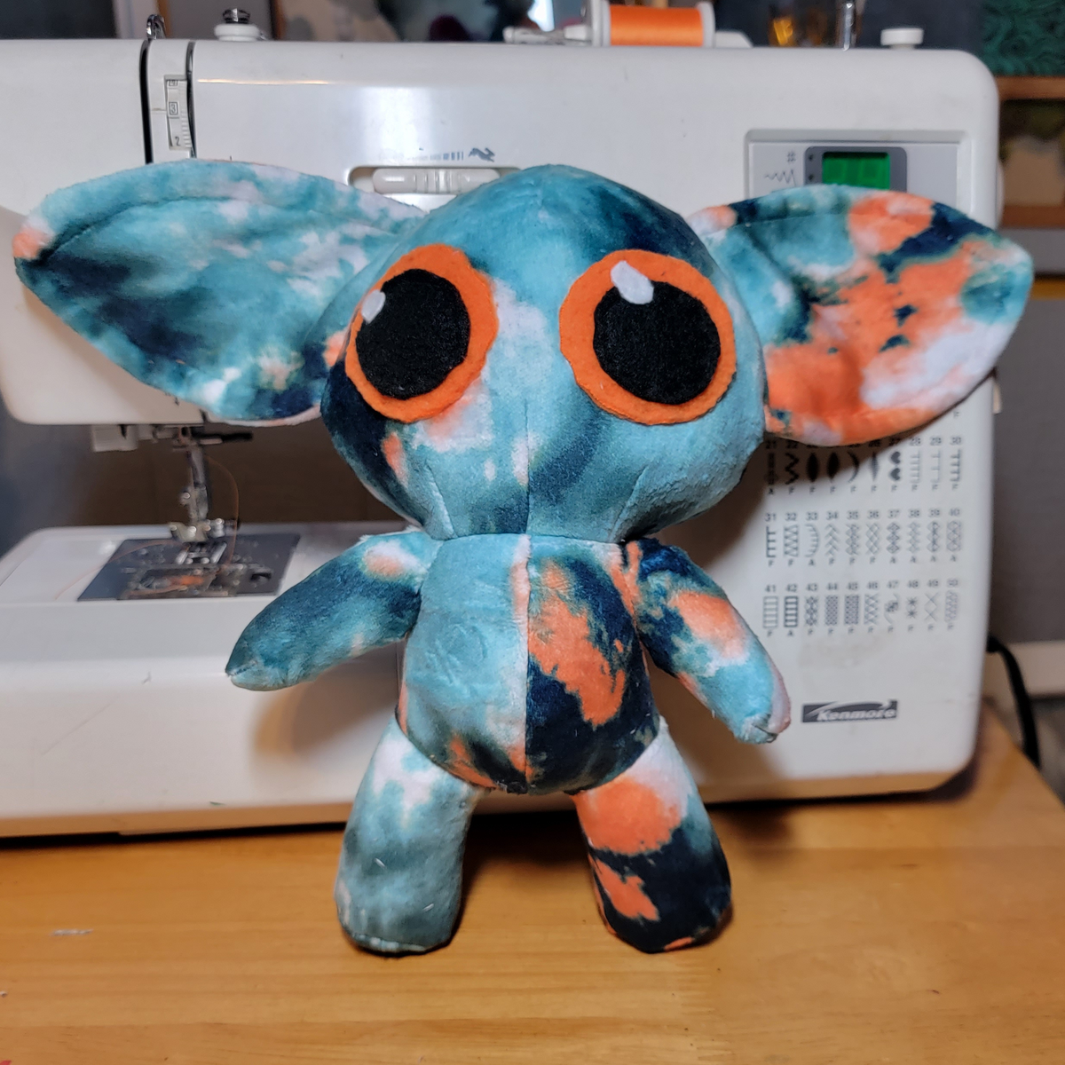 A soft, cuddly tie dye gremlin with bright orange eyes. Measures about 10 inches tall with an ear-span of about 14 inches.