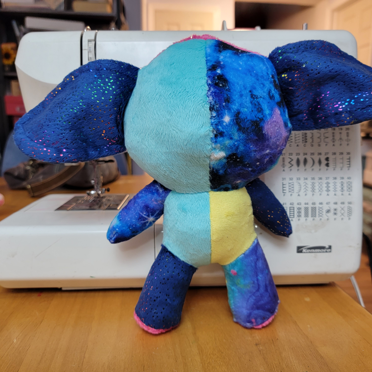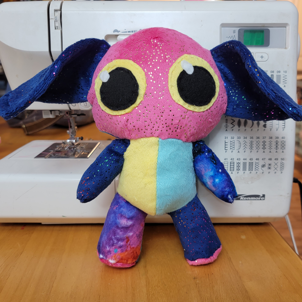A gremlin made of different minky fabrics, including galaxy, paint splatter, and two kinds of sparkle! It has a bright pink sparkle face with yellow eyes. Measures about 10 inches tall with an ear-span of about 14 inches.