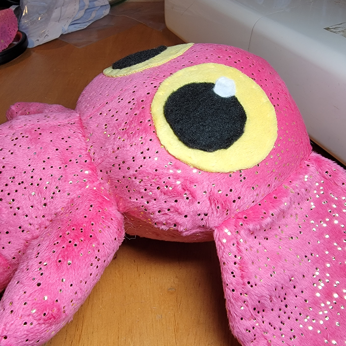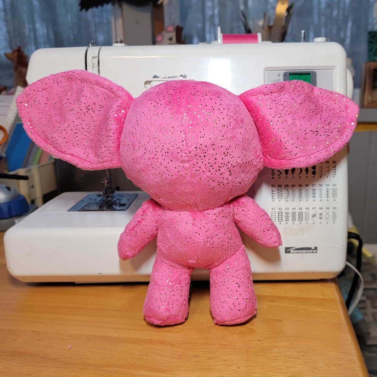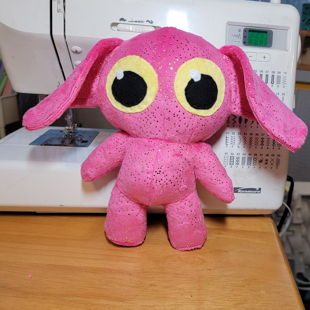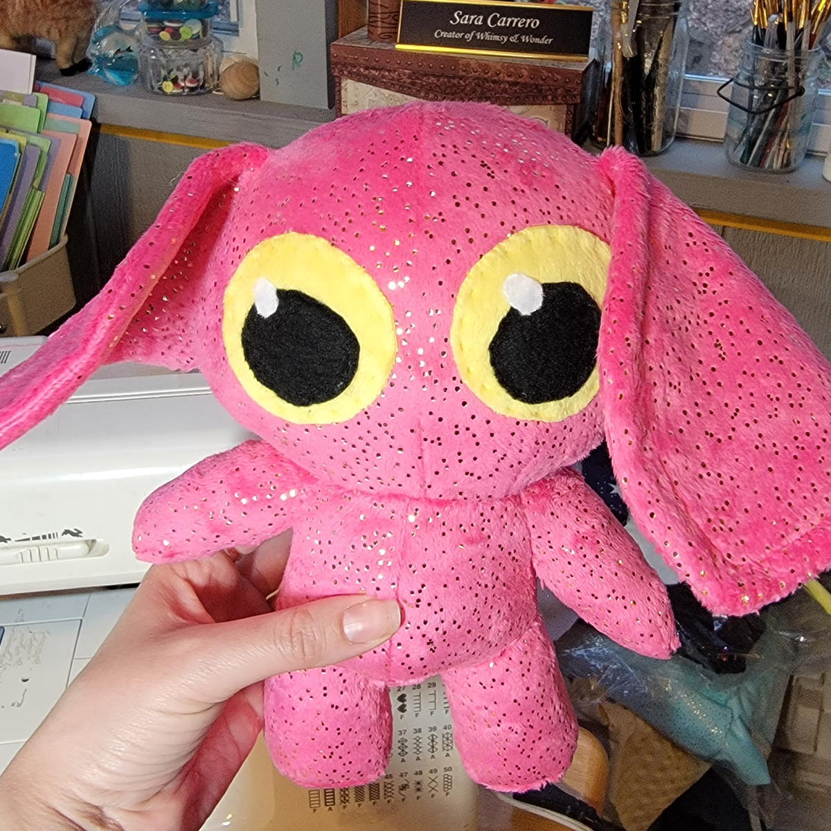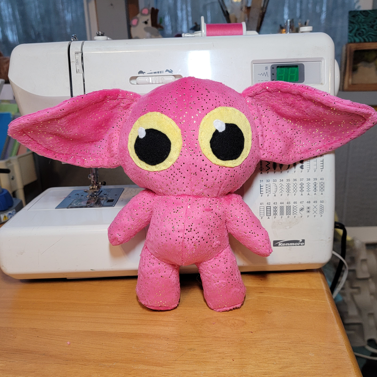 Sparkle gremlin! This gremlin is a bright pink with gold sparkles spread throughout its fur that catch the light, with bright yellow eyes. Measures about 10 inches tall with an ear-span of about 14 inches.