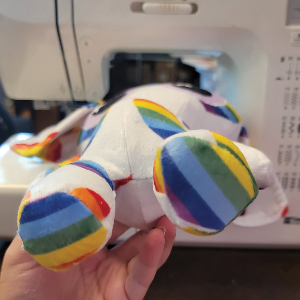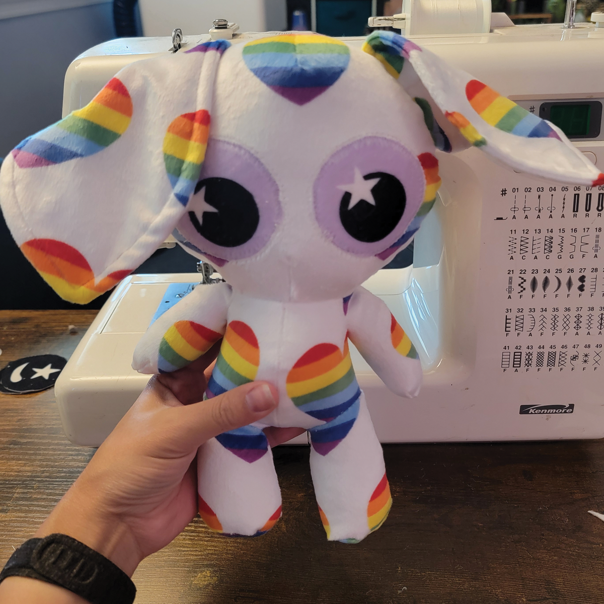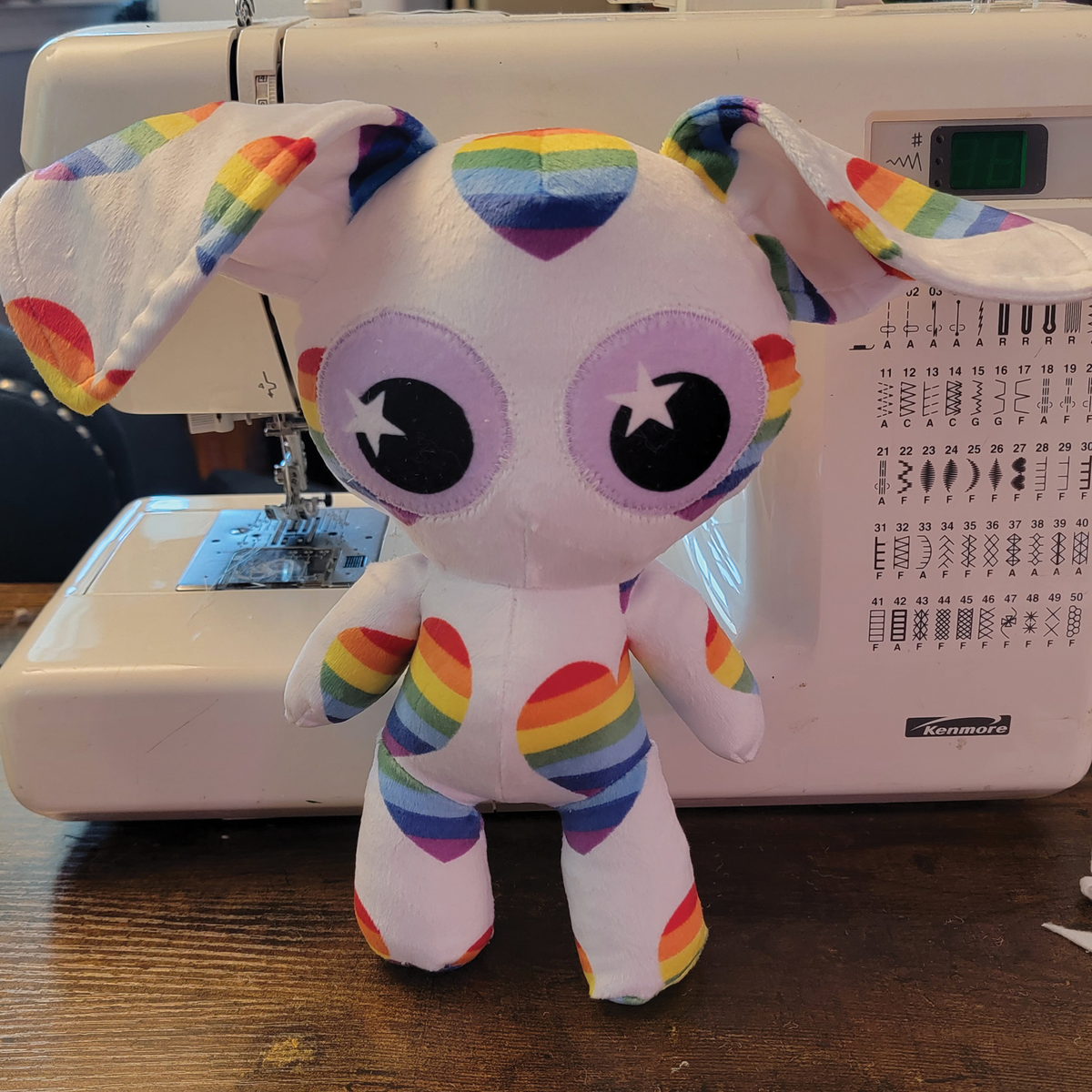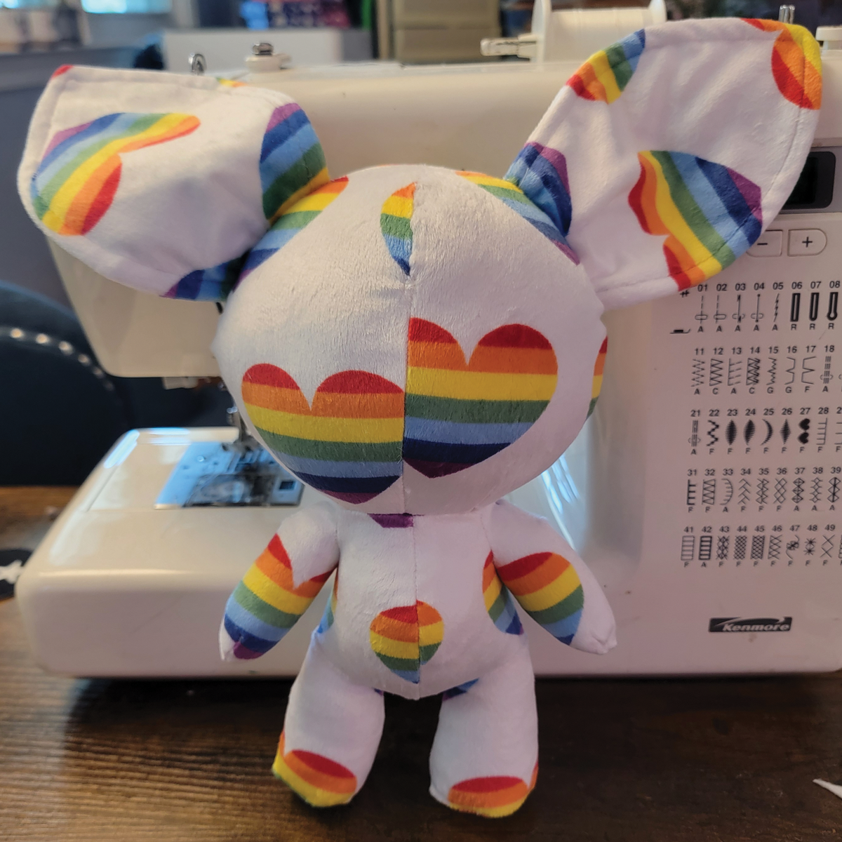 A Pride Month special gremlin! Made with white fabric with rainbow hearts on it, this gremlin is full of love! Has starry lavender eyes and rainbow feet. Measures about 10 inches tall with an ear-span of about 14 inches.