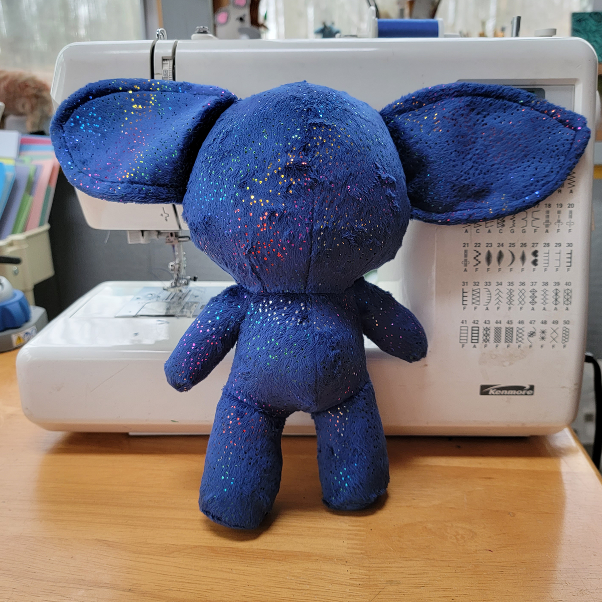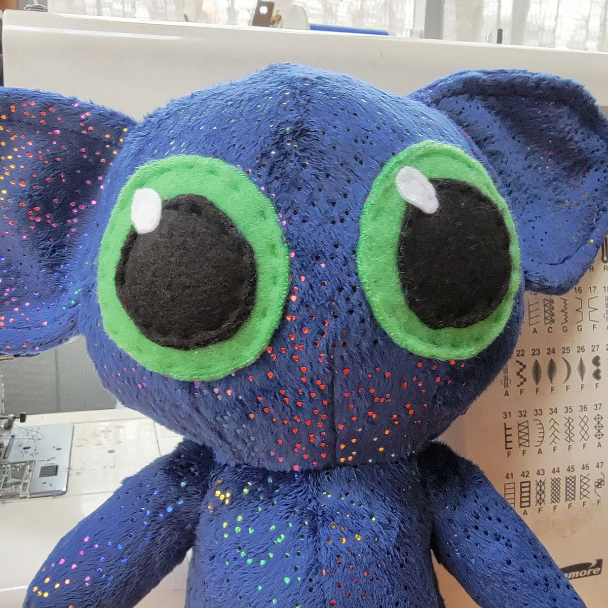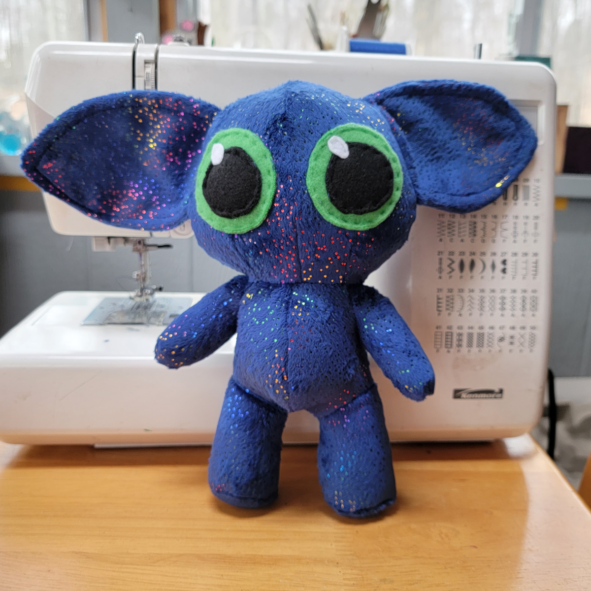 Sparkle gremlin! This gremlin is a deep blue with rainbow sparkles spread throughout its fur that catch the light, with bright green eyes. Measures about 10 inches tall with an ear-span of about 14 inches.