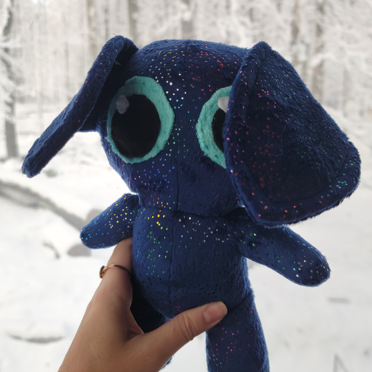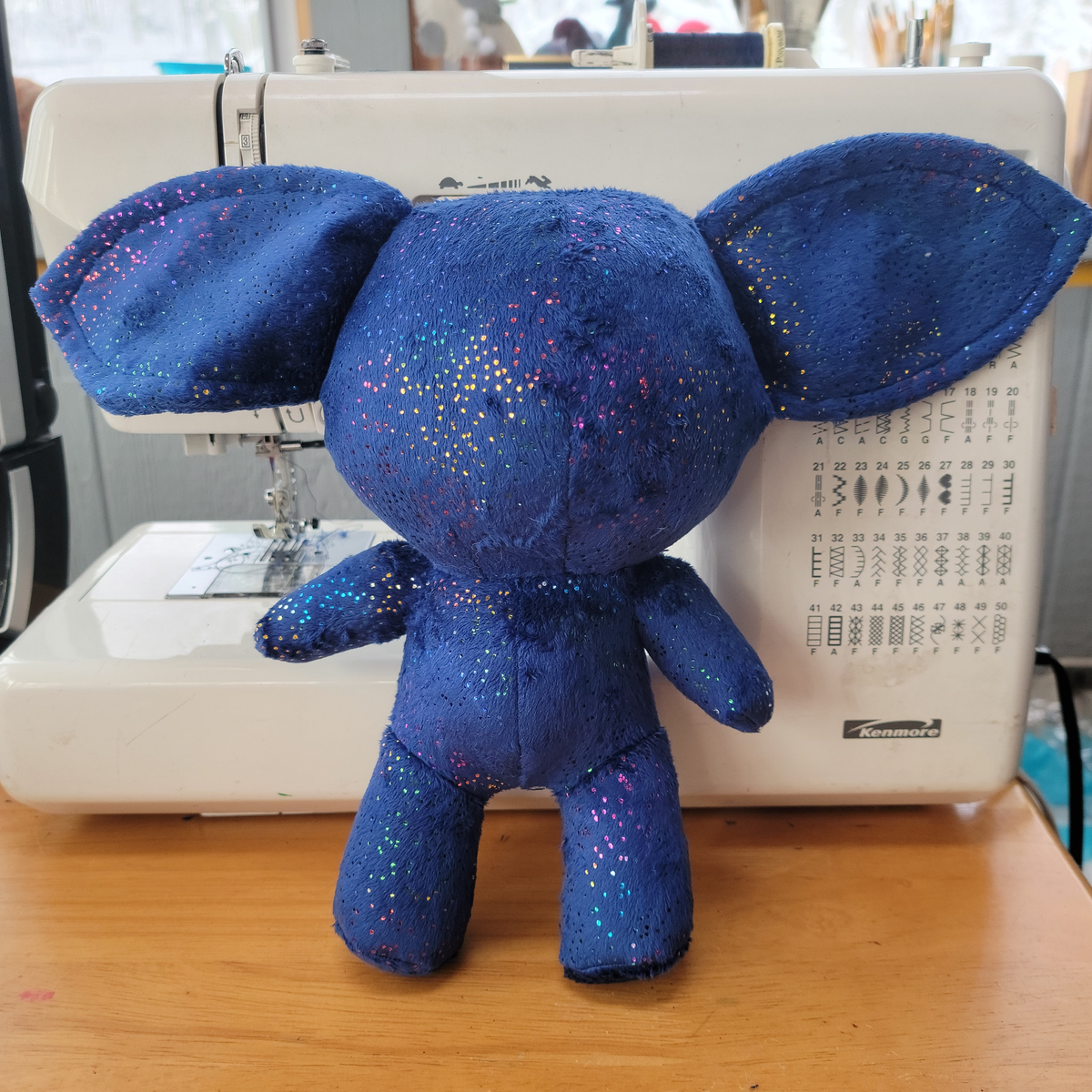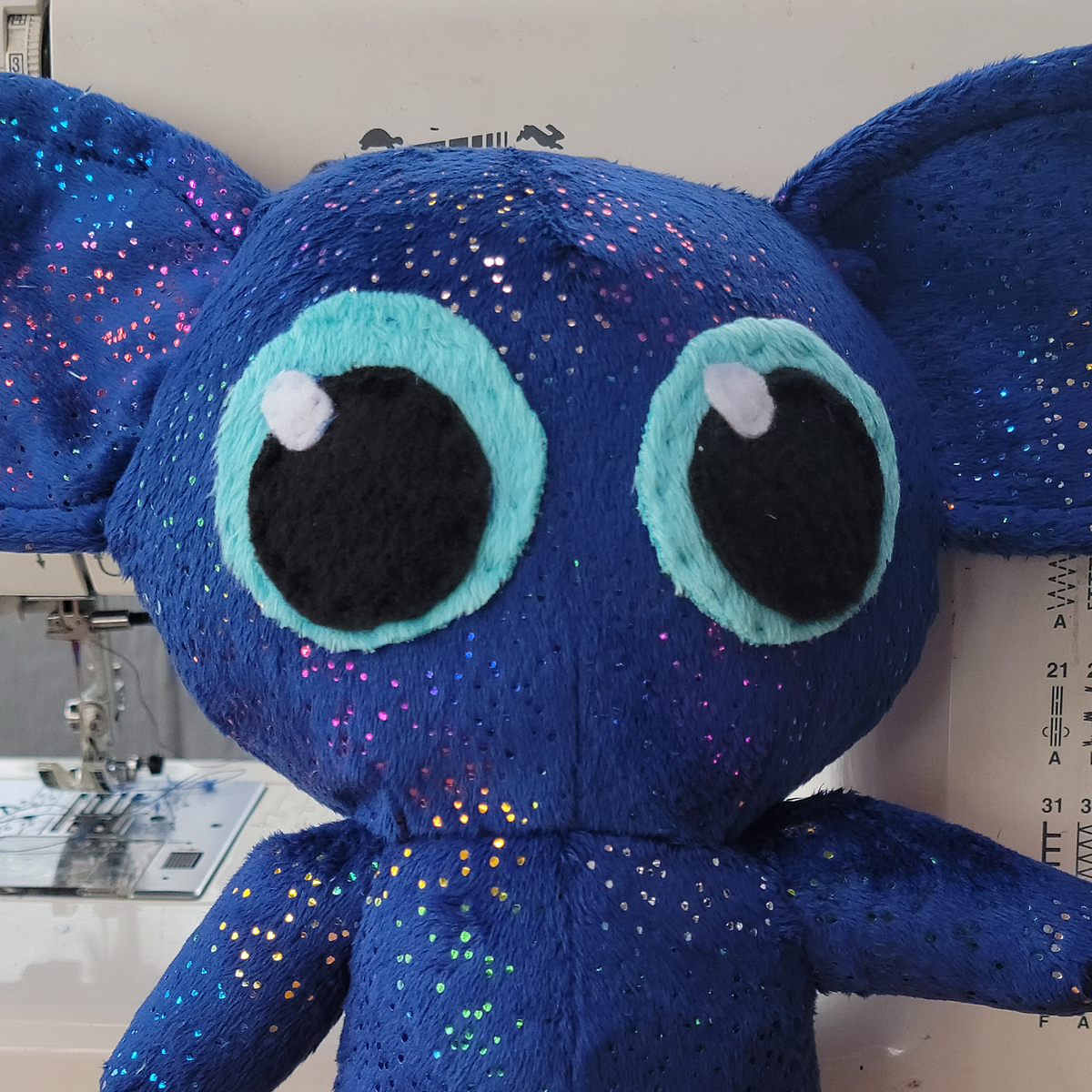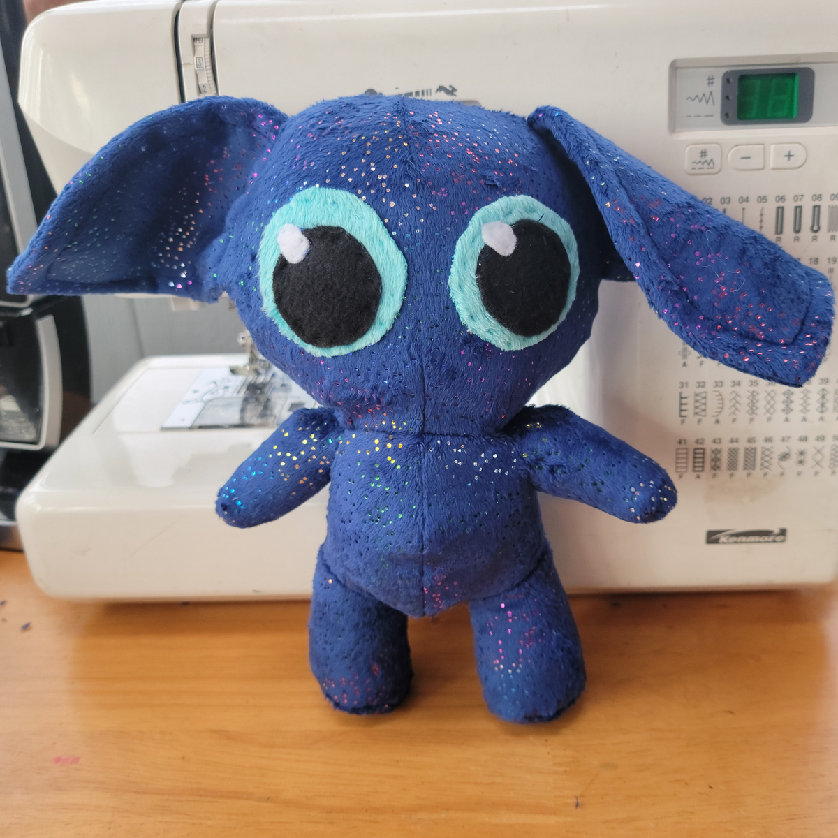 Sparkle gremlin! This gremlin is a deep blue with rainbow sparkles spread throughout its fur that catch the light. Measures about 10 inches tall with an ear-span of about 14 inches.