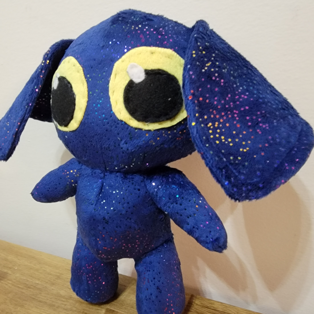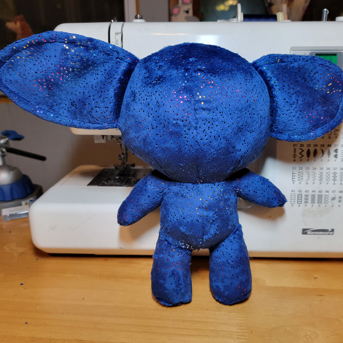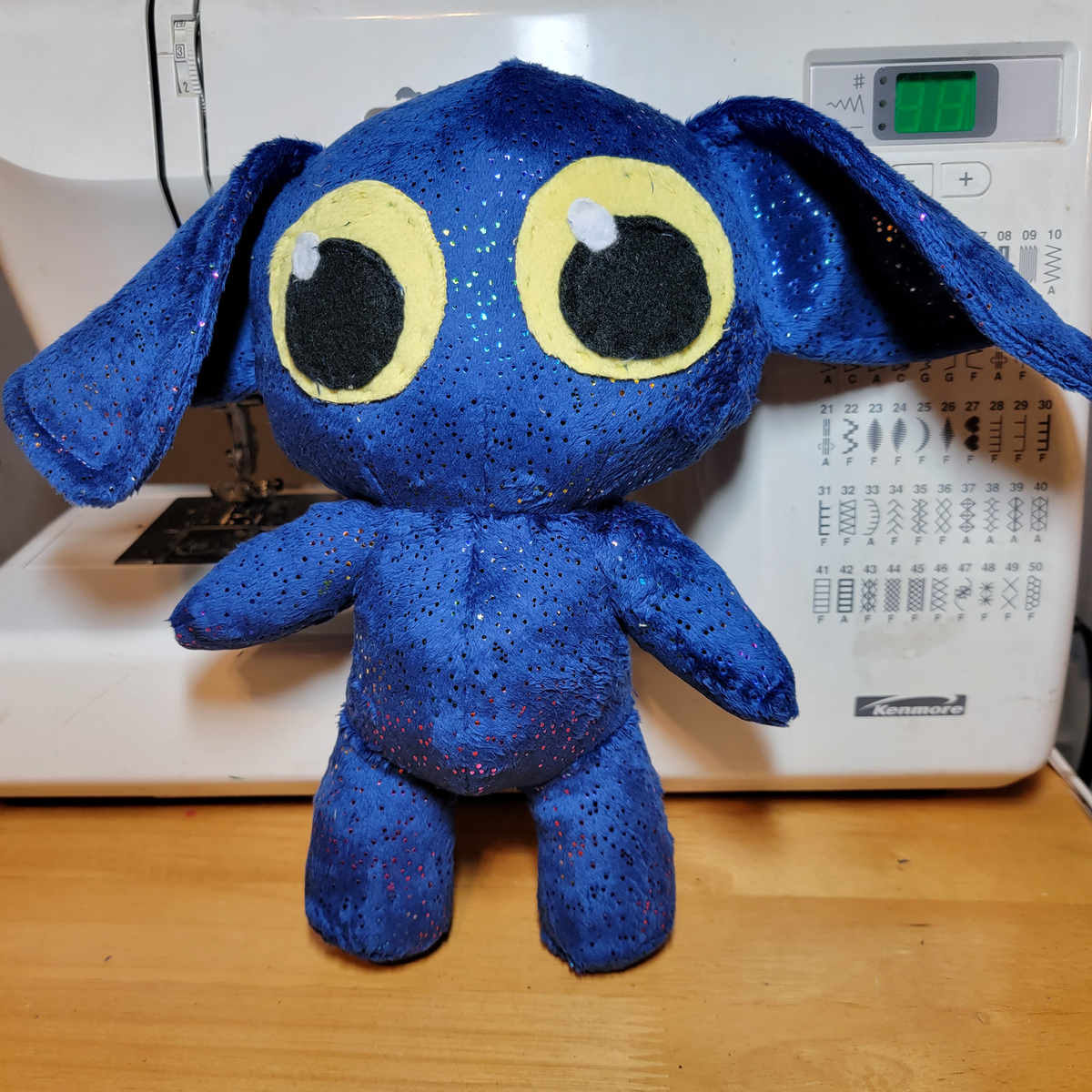 This gremlin SPARKLES! It is a deep blue with rainbow sparkles spread throughout its fur that catch the light. Measures about 10 inches tall with an ear-span of about 14 inches. Watch a video of the sparkle.