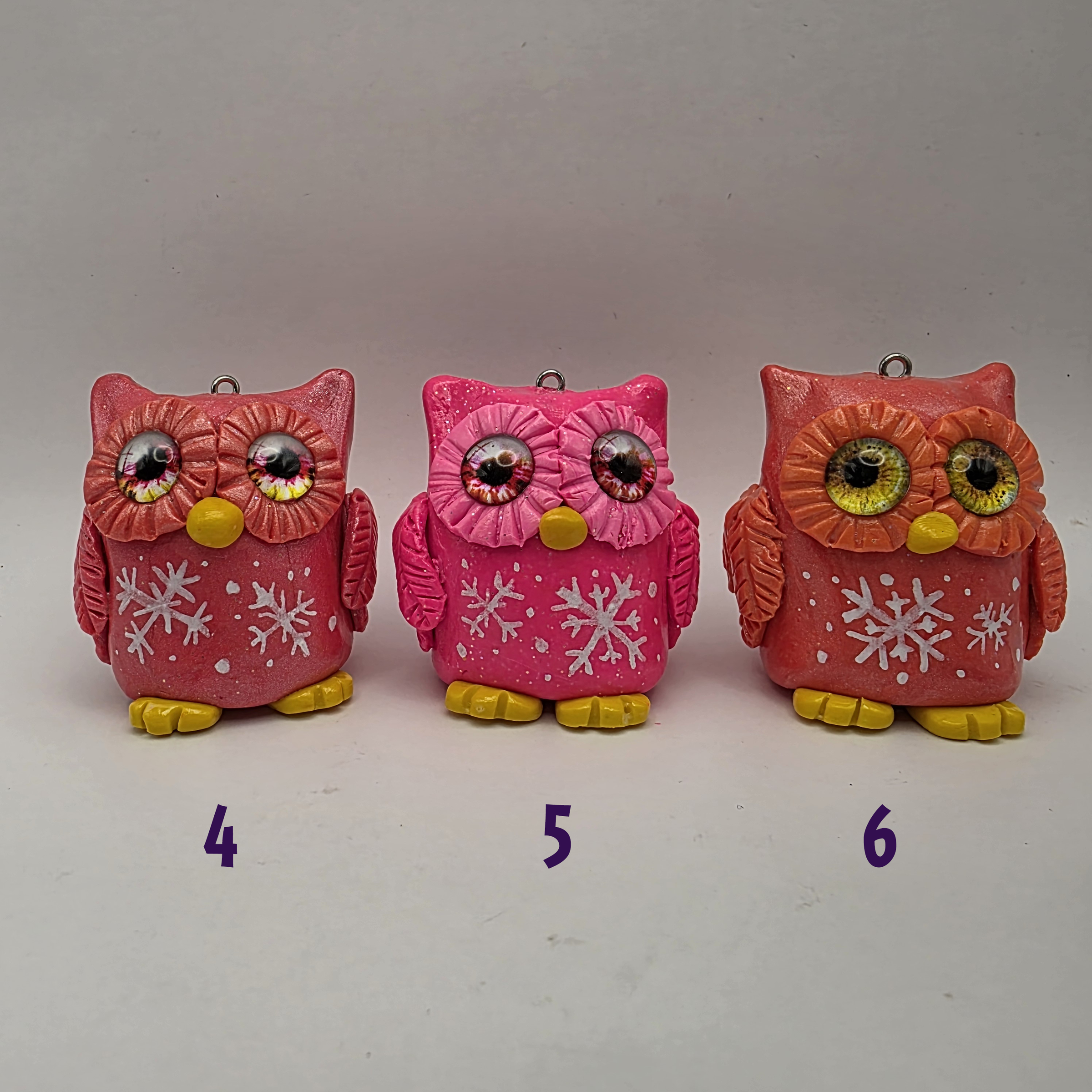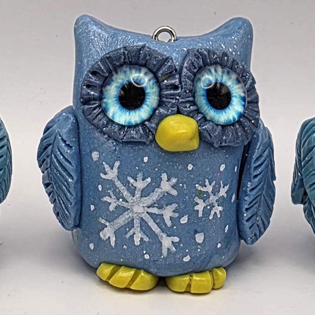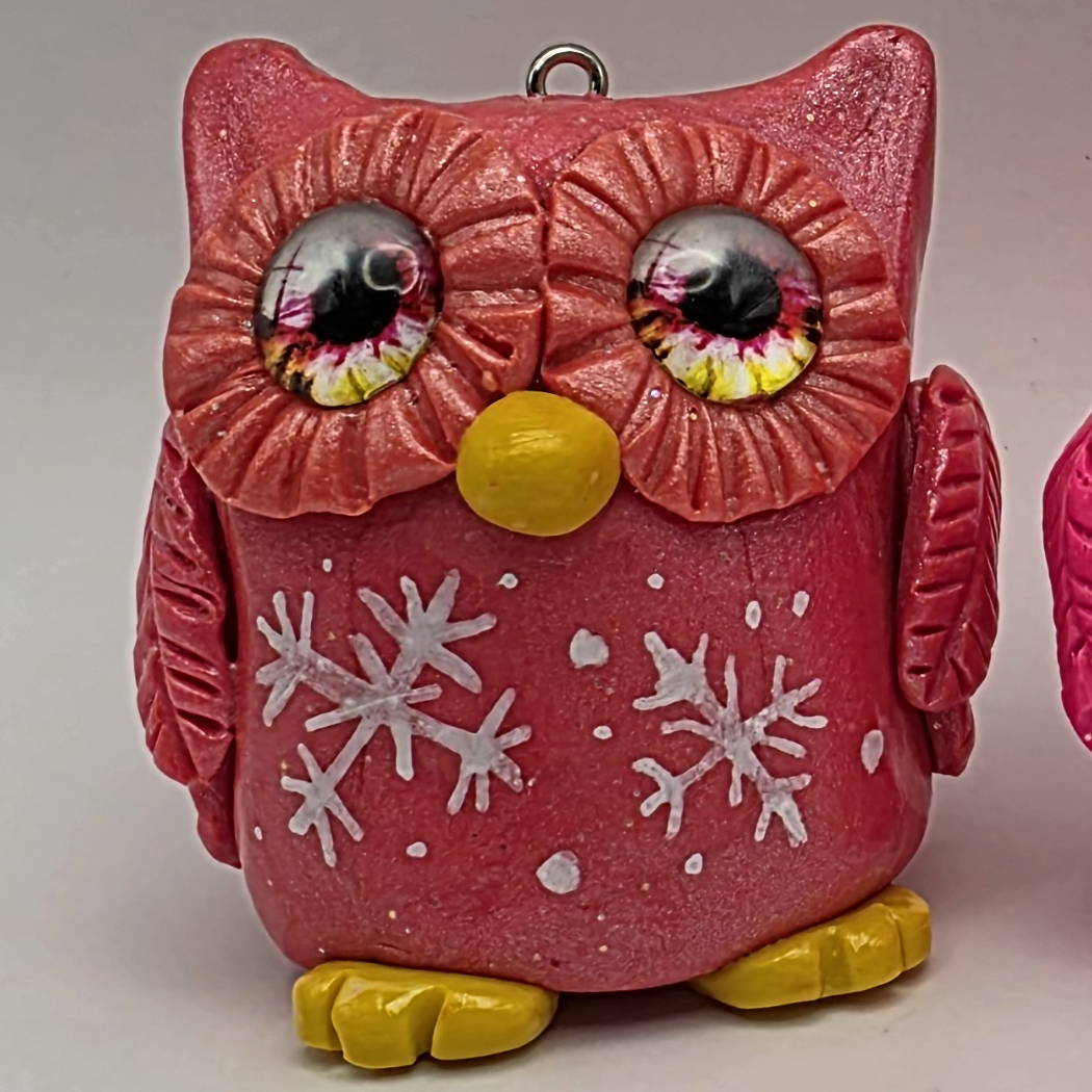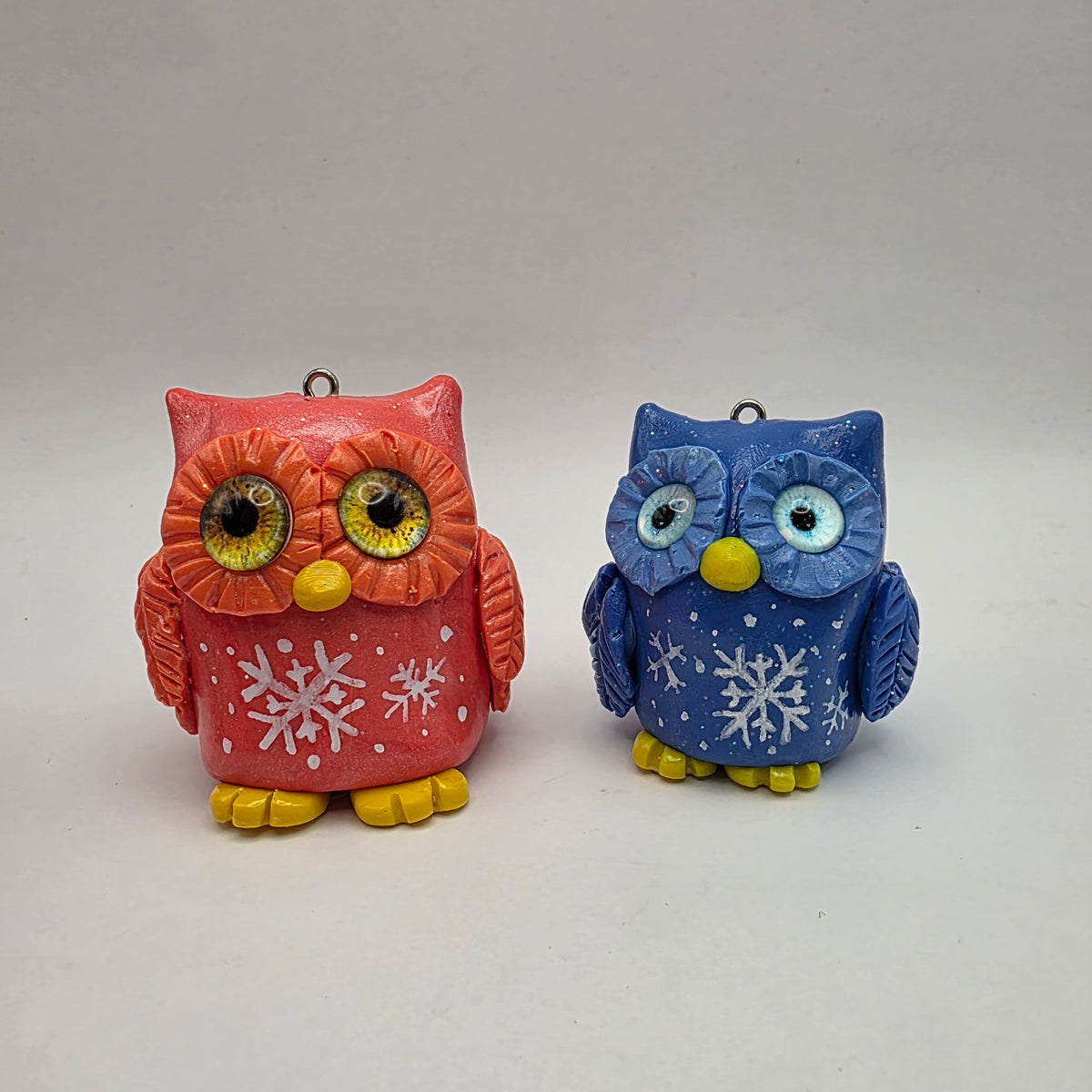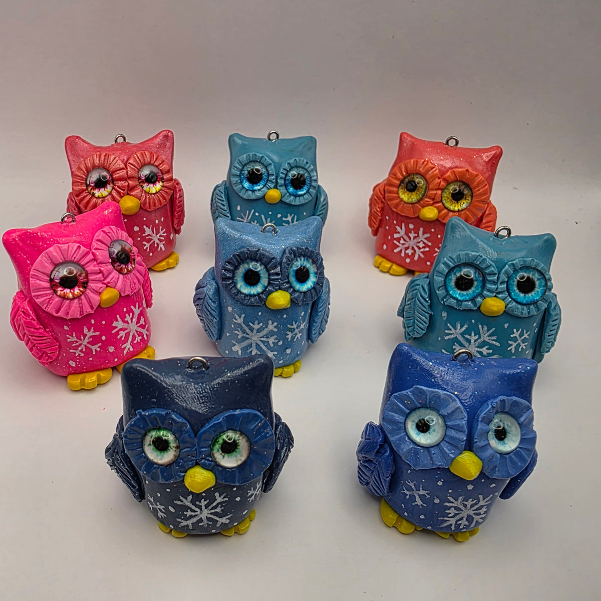 Polymer clay owl ornaments! These silly little owls are colorful creatures with big eyes and snowflakes on their bellies. They are handmade with polymer clay, the snowflakes painted on, and they are sealed with glaze to protect the painting.