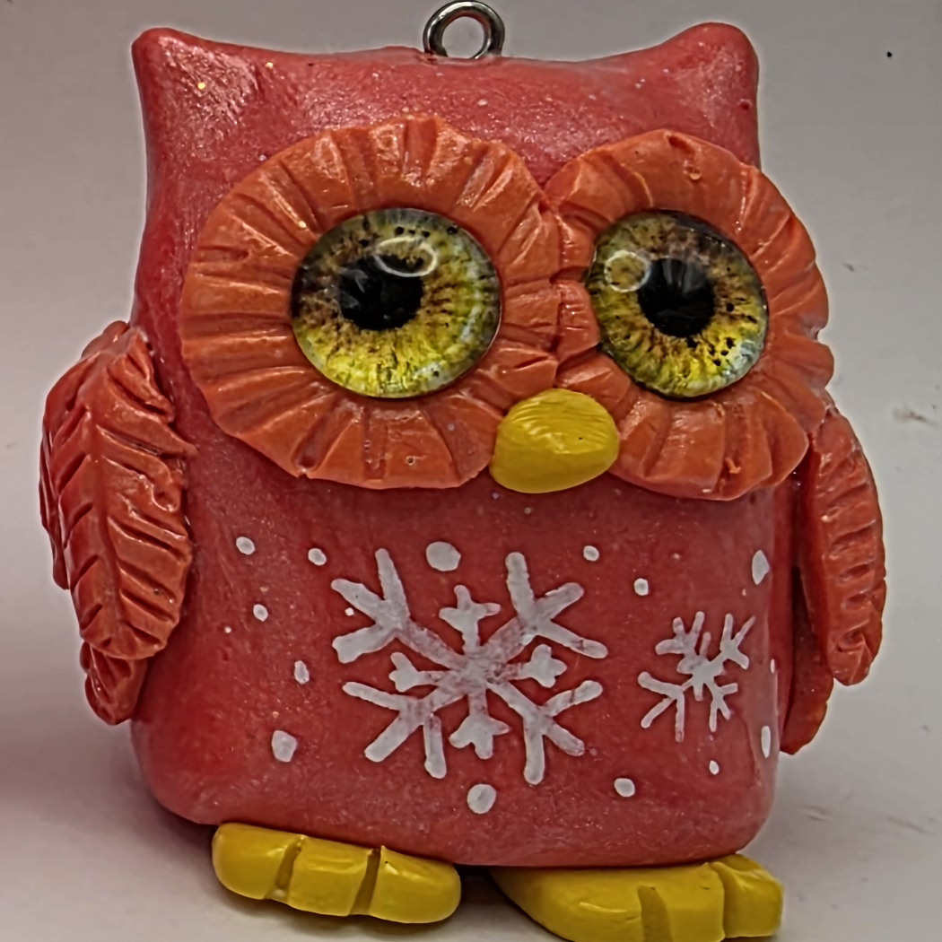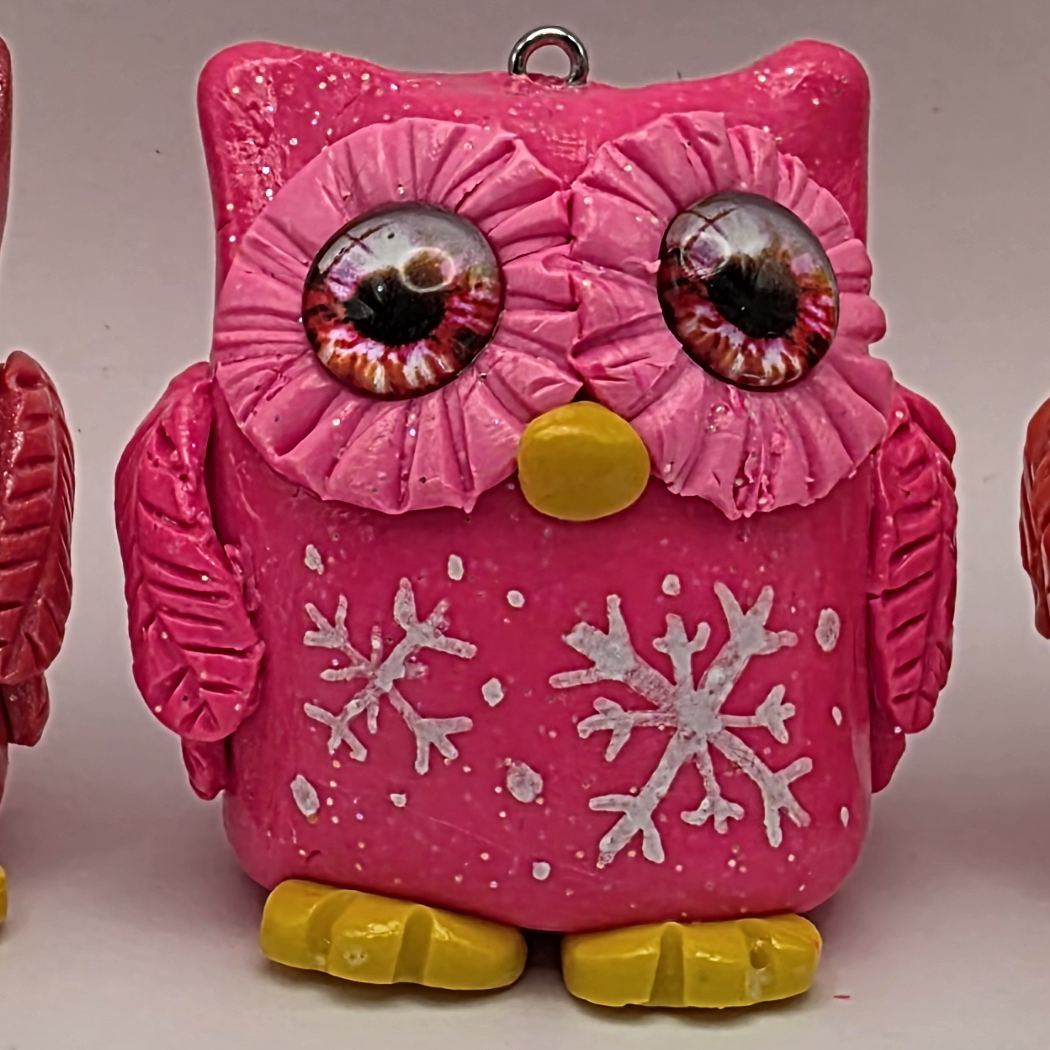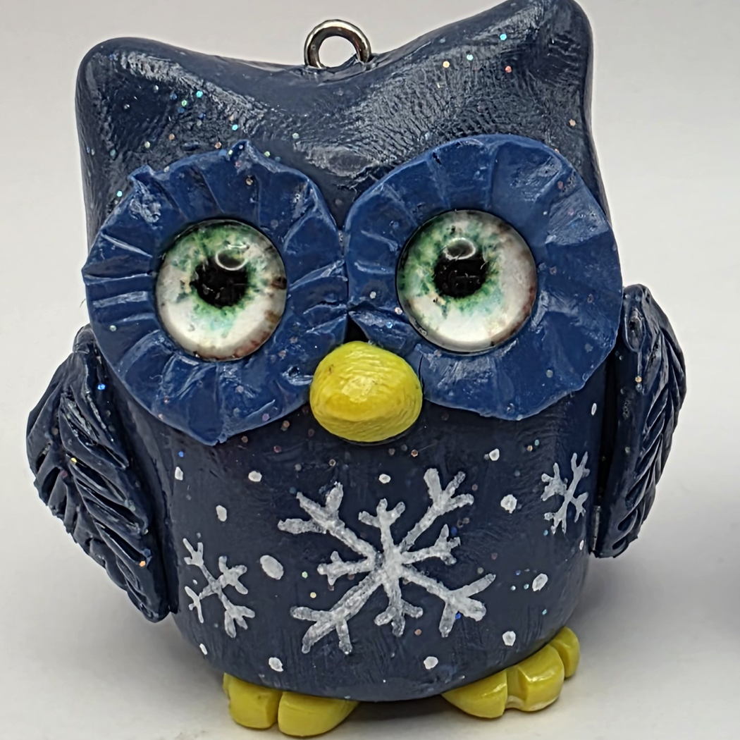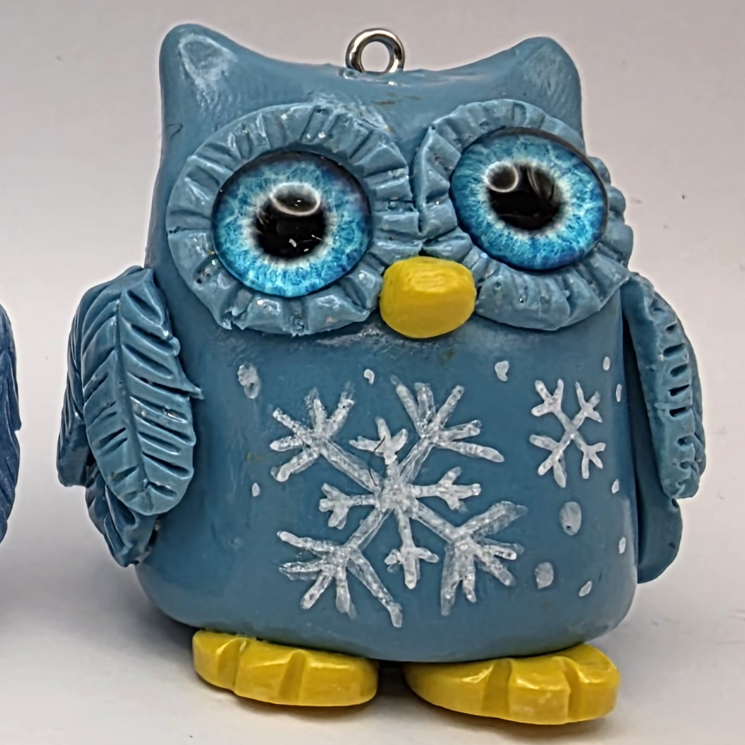 Polymer clay owl ornaments! These silly little owls are colorful creatures with big eyes and snowflakes on their bellies. They are handmade with polymer clay, the snowflakes painted on, and they are sealed with glaze to protect the painting.