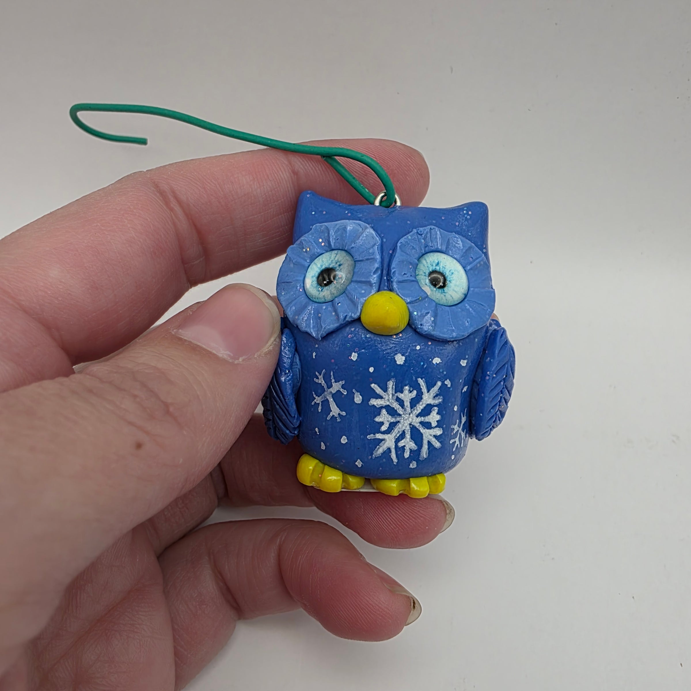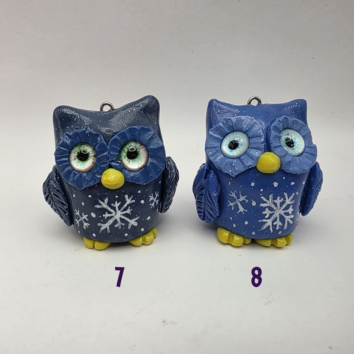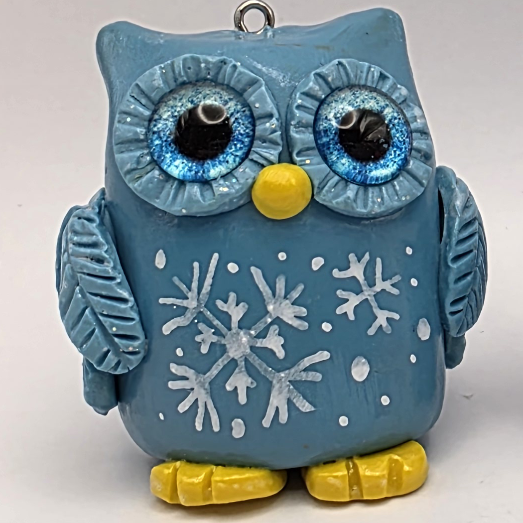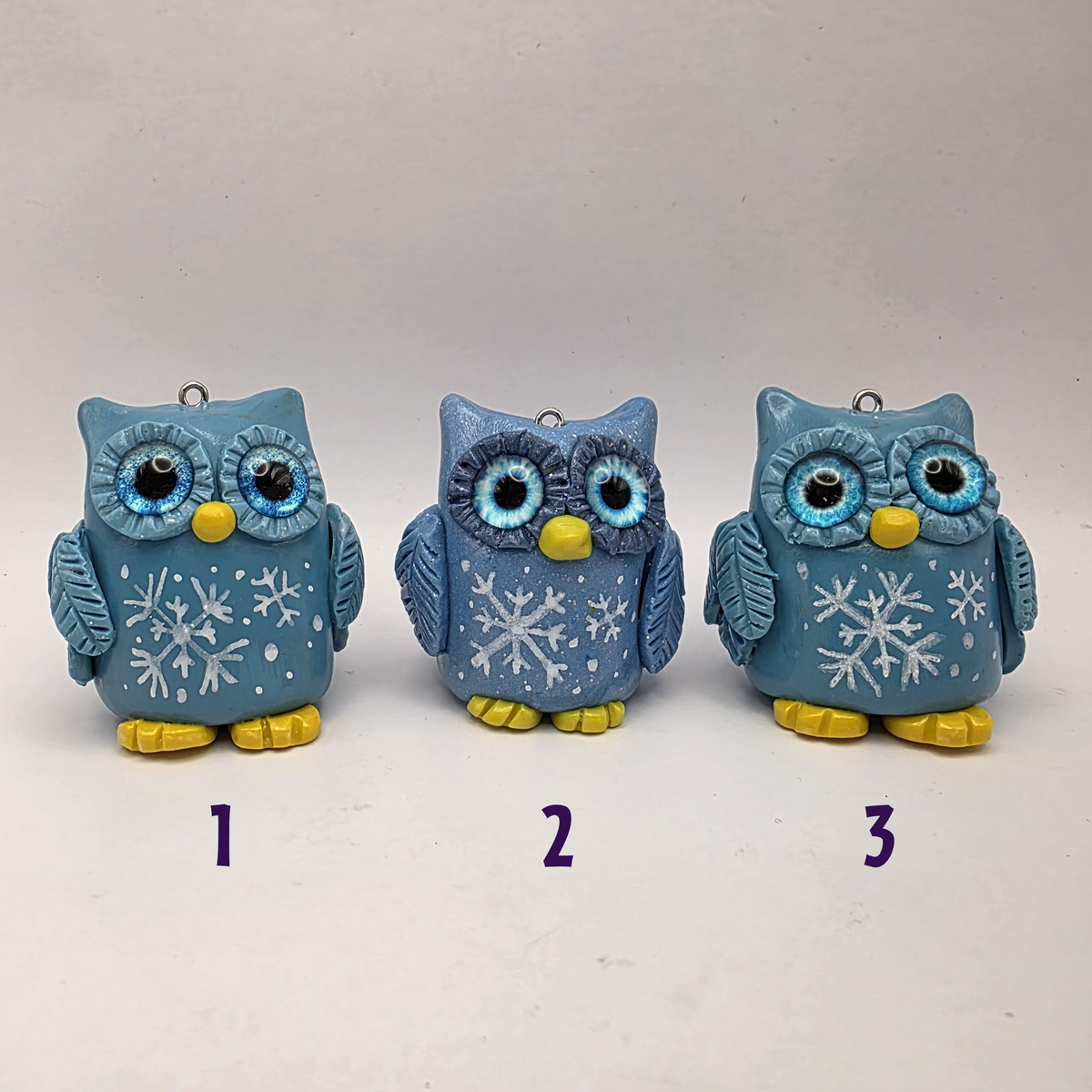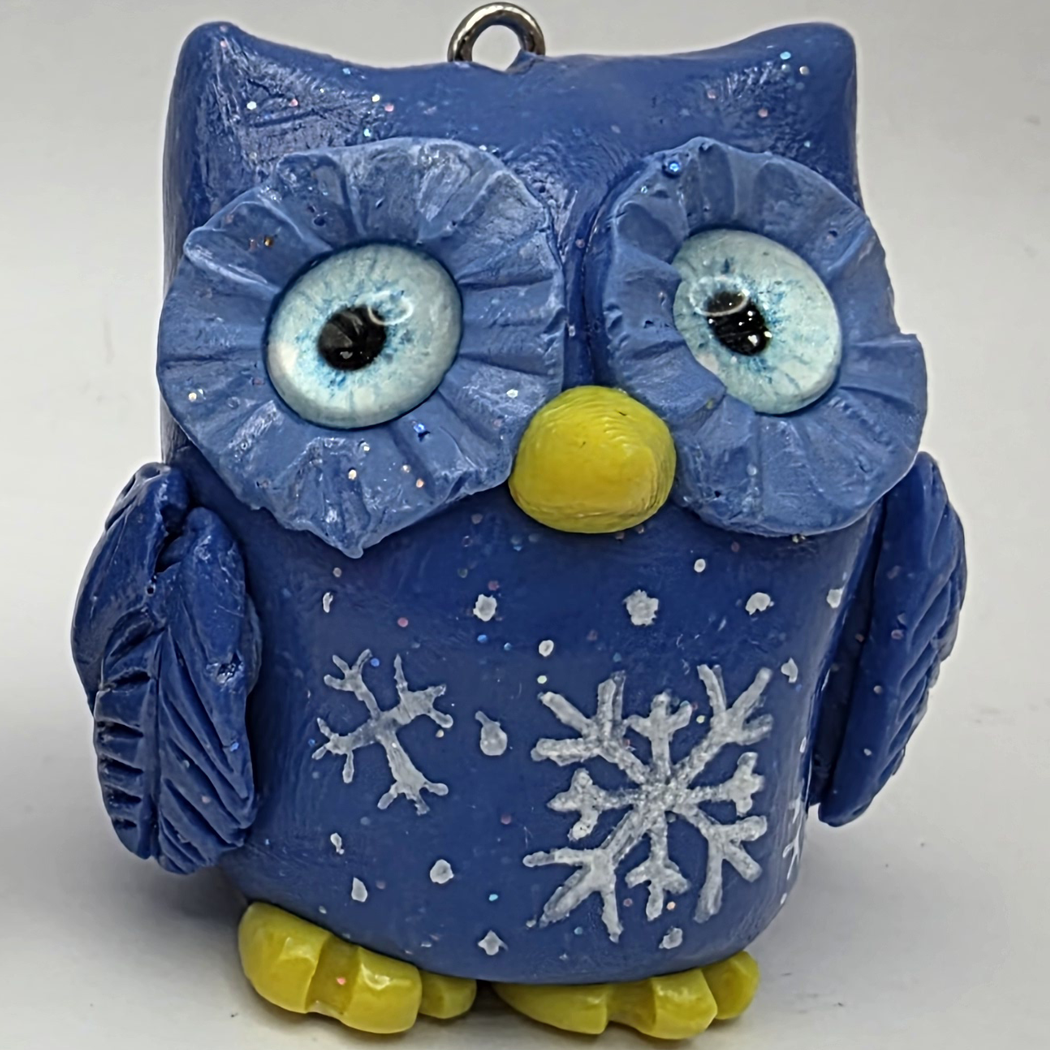 Polymer clay owl ornaments! These silly little owls are colorful creatures with big eyes and snowflakes on their bellies. They are handmade with polymer clay, the snowflakes painted on, and they are sealed with glaze to protect the painting.