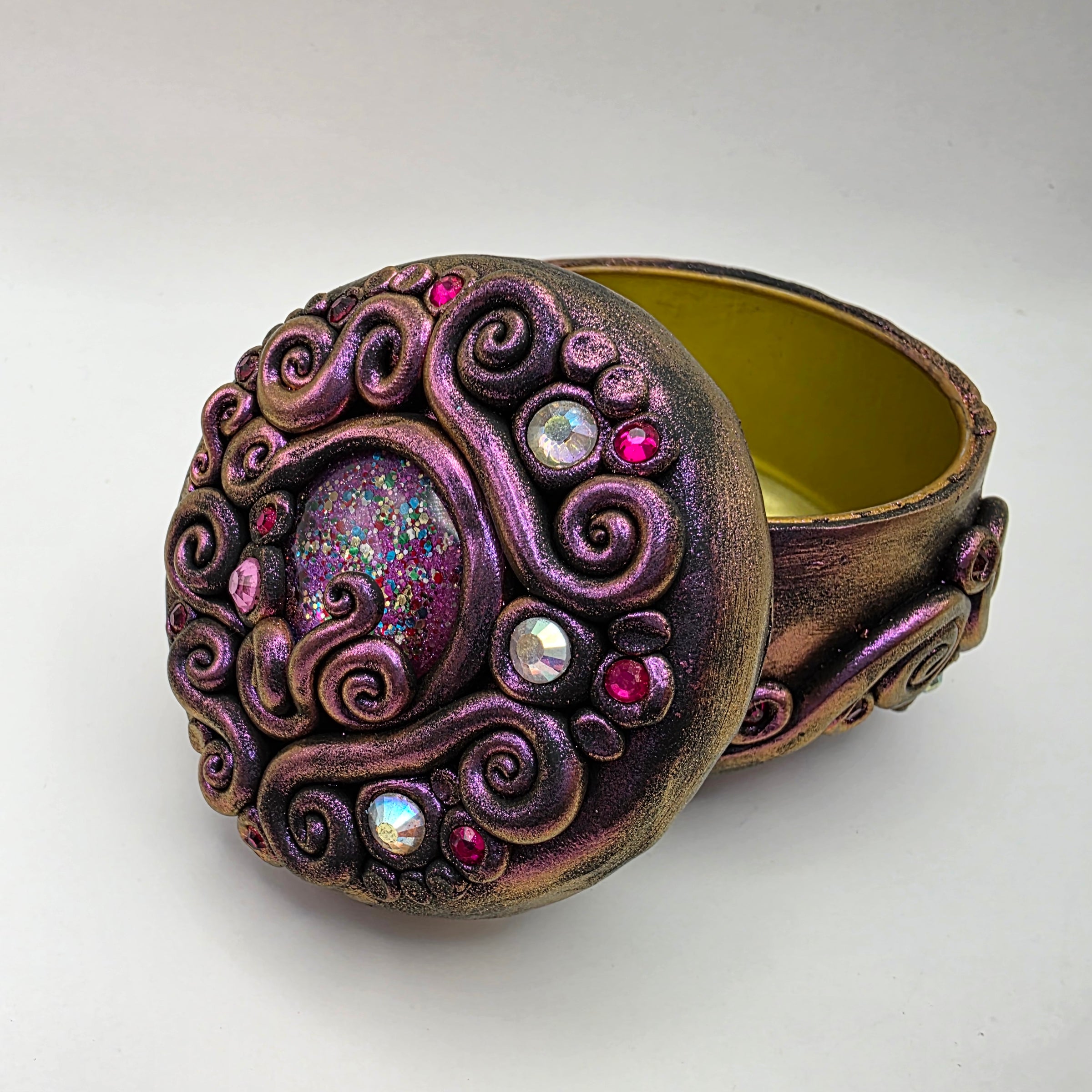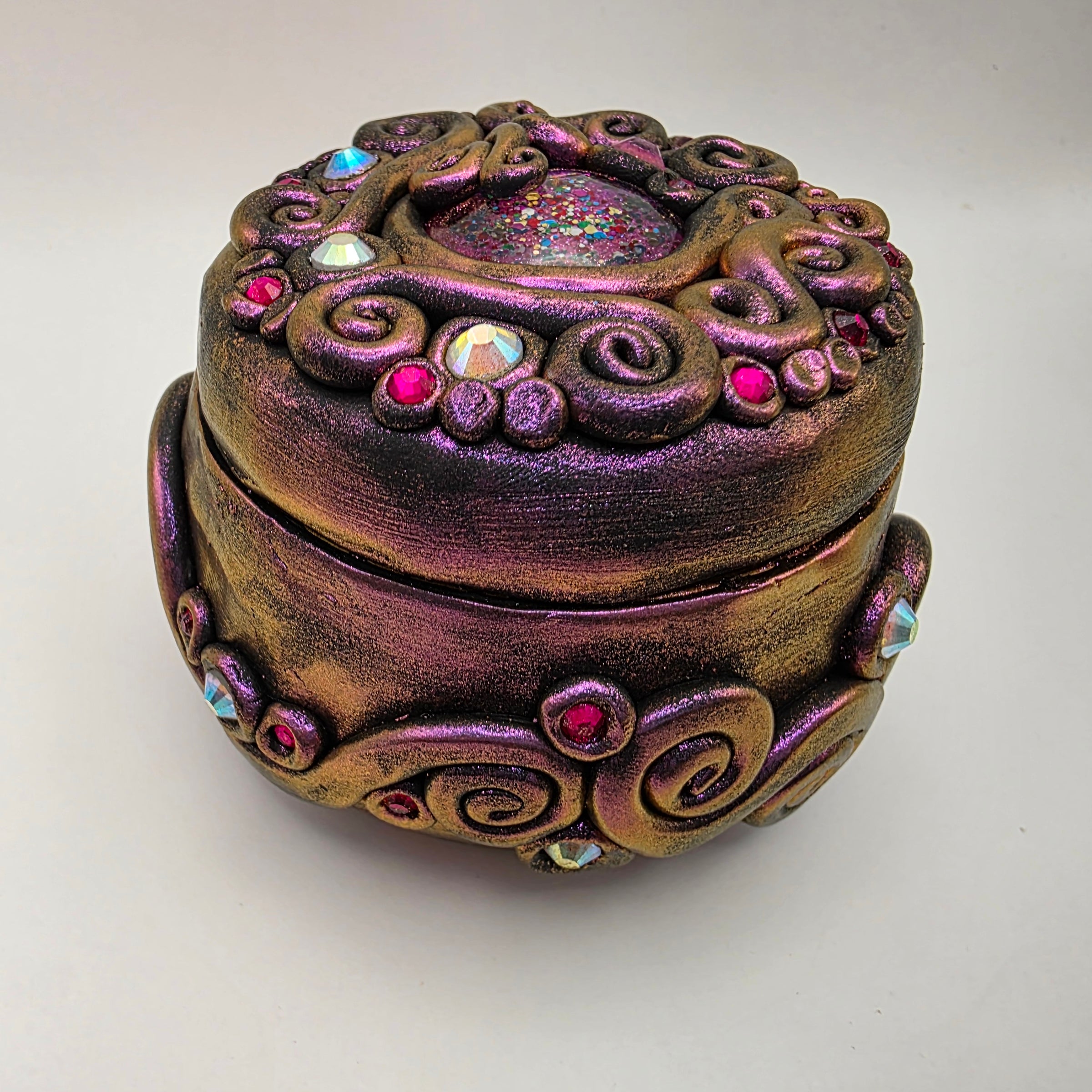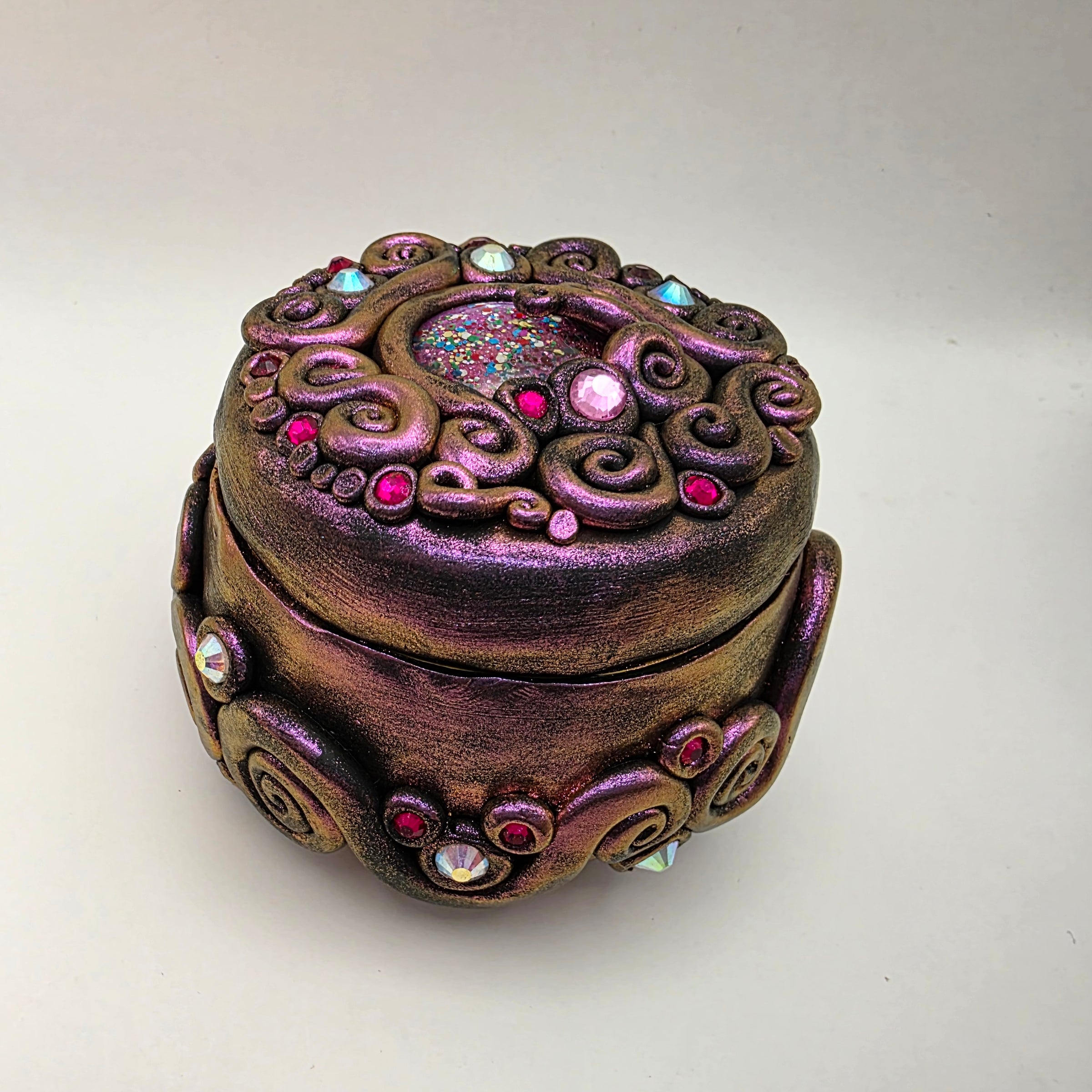 This small polymer clay trinket box features a painted glass cabochon that has chunky multicolored glitter, surrounded by swirls and rhinestones in pink and iridescent white. It is brushed with a shimmering chameleon powder.