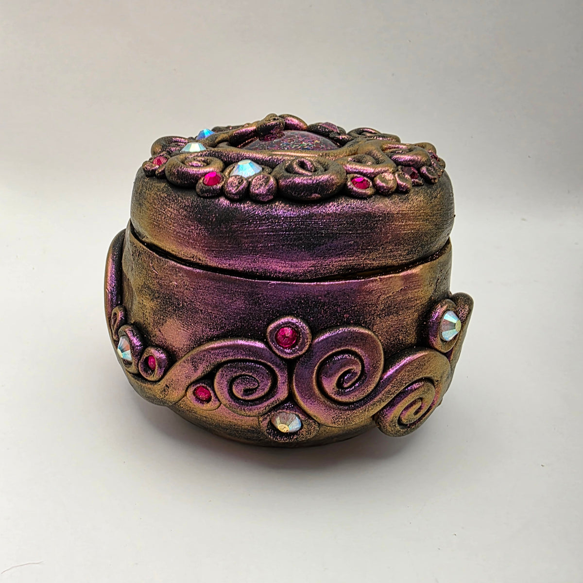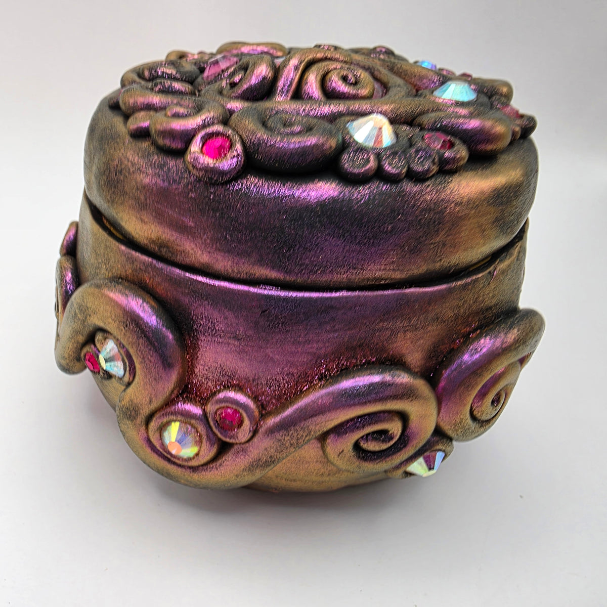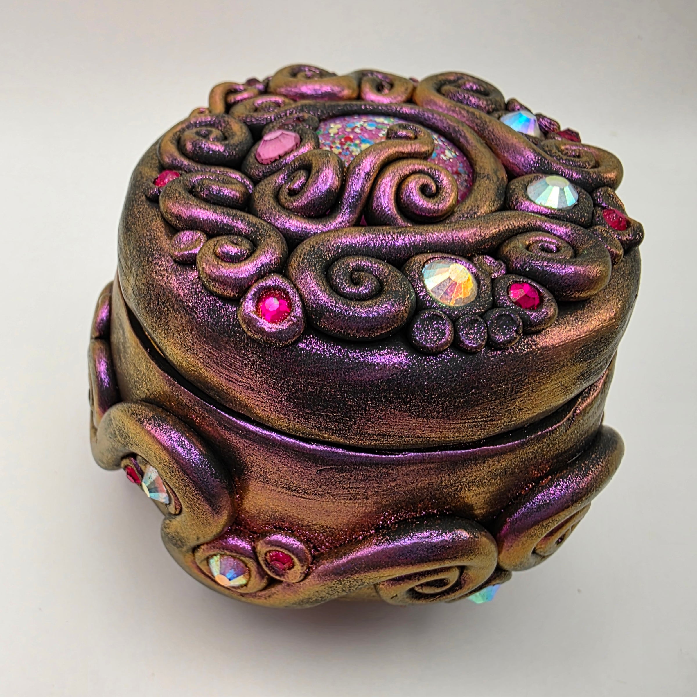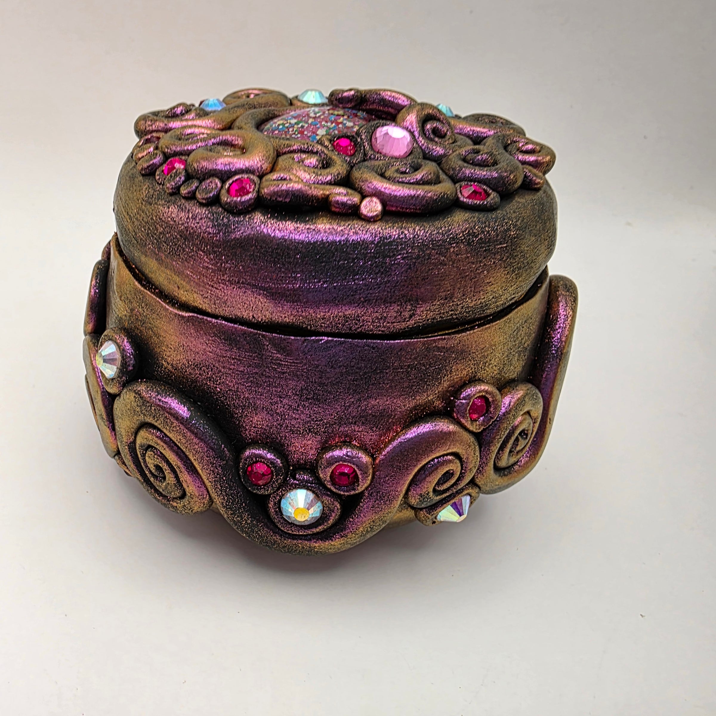This small polymer clay trinket box features a painted glass cabochon that has chunky multicolored glitter, surrounded by swirls and rhinestones in pink and iridescent white. It is brushed with a shimmering chameleon powder.