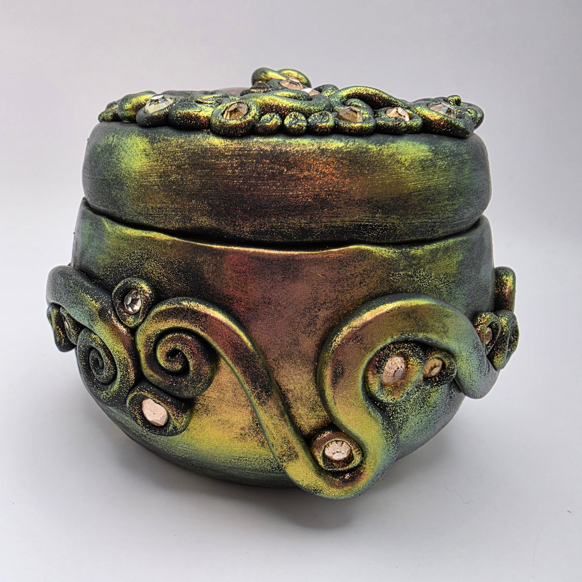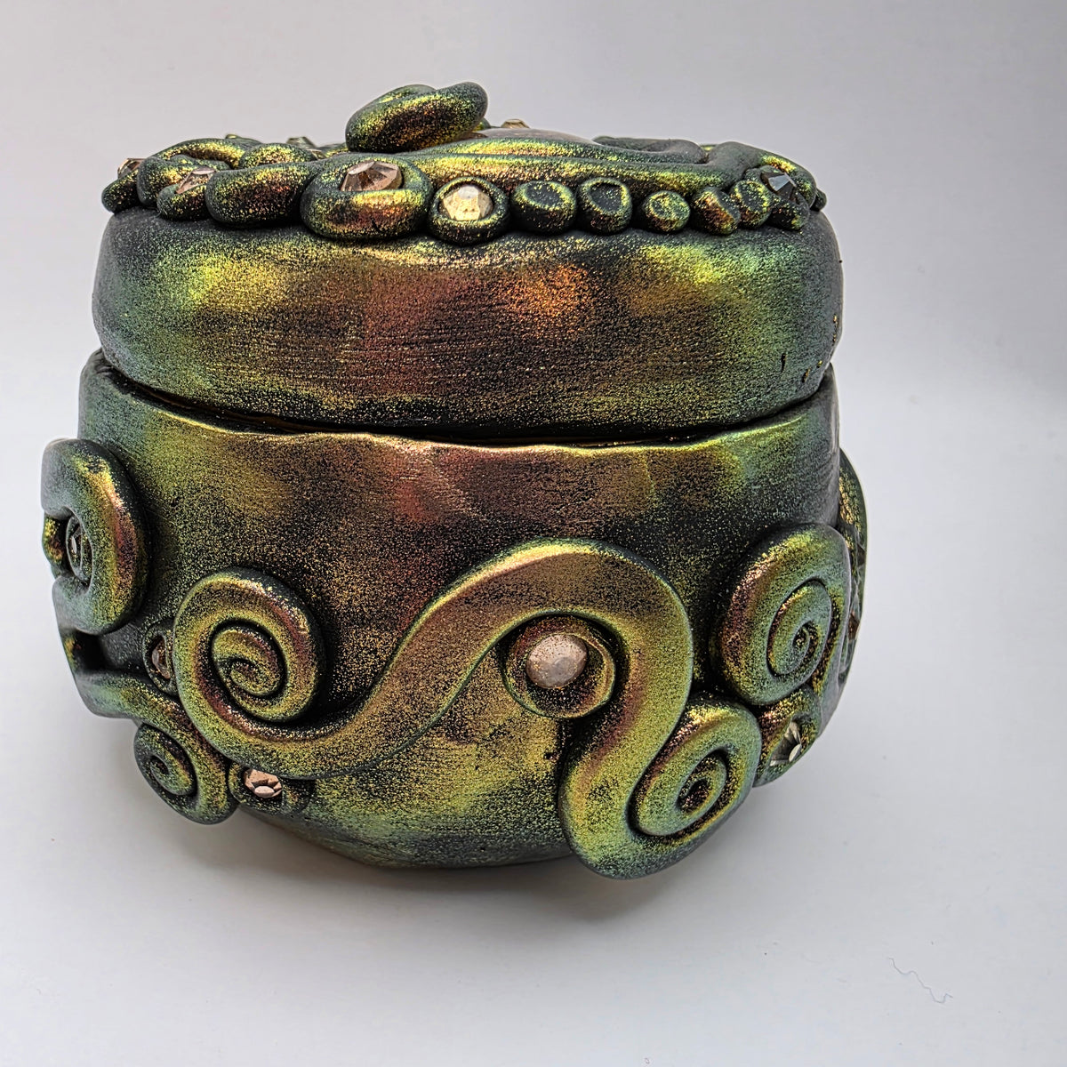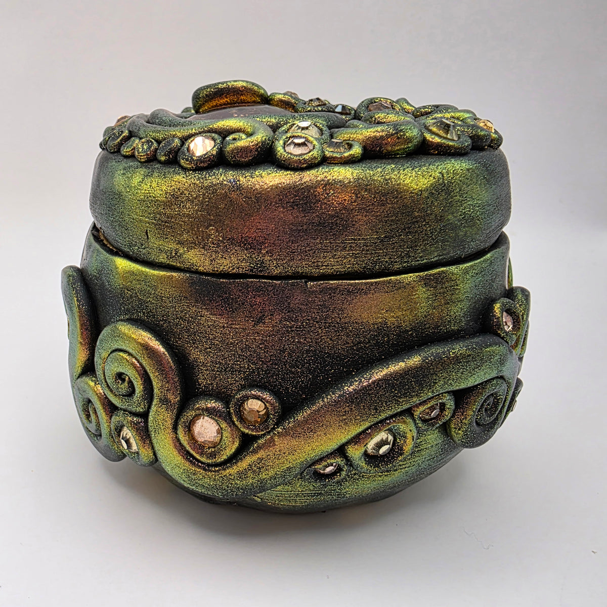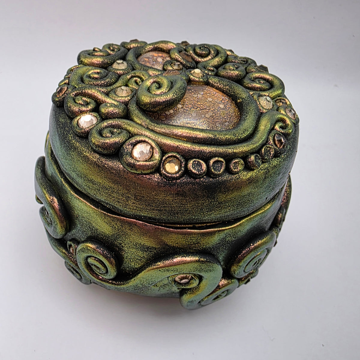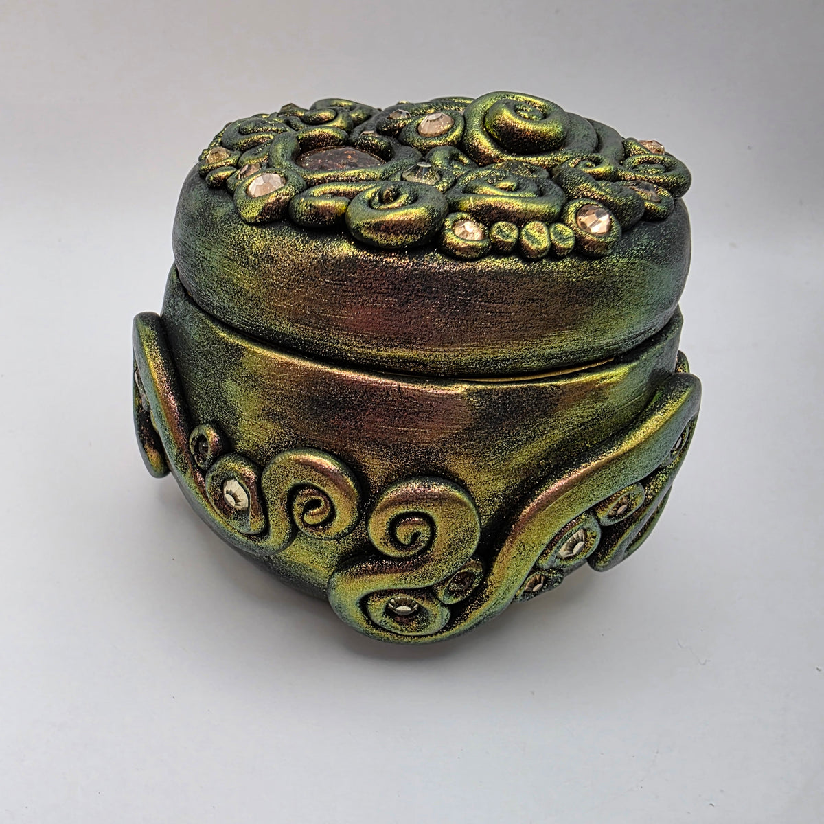 These smaller trinket boxes are built around metal boxes that measure 2.9 inches at the base, 2.3 inches at the top, and are 2 inches tall. Actual size will be a bit larger with the added layers of clay.