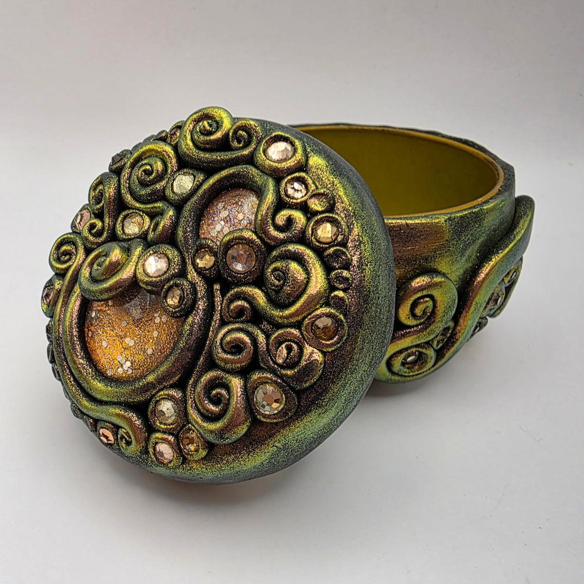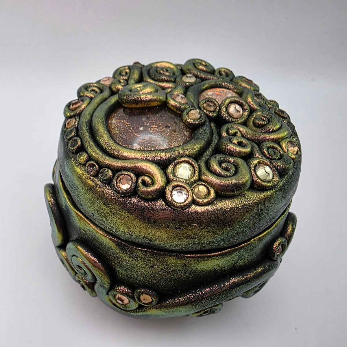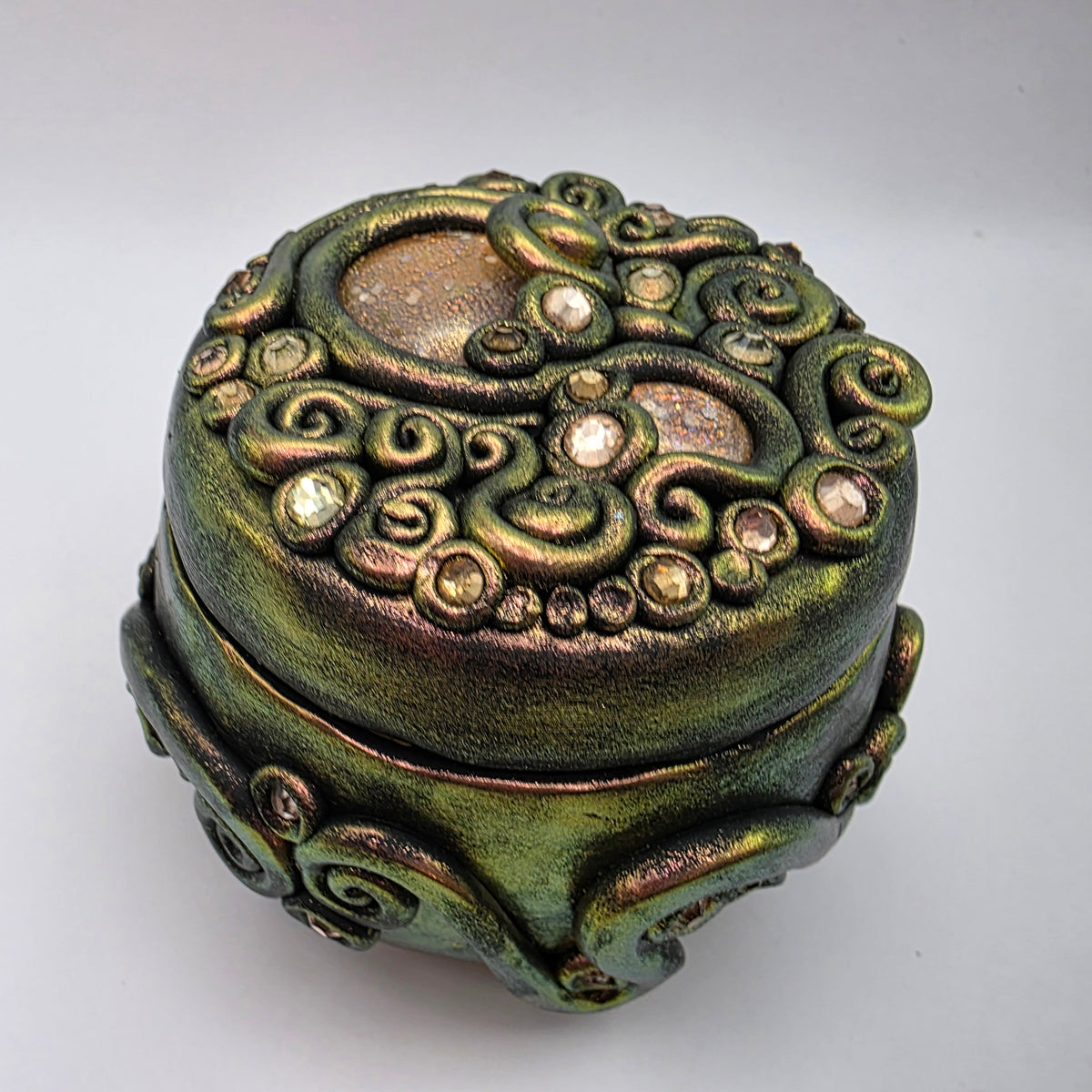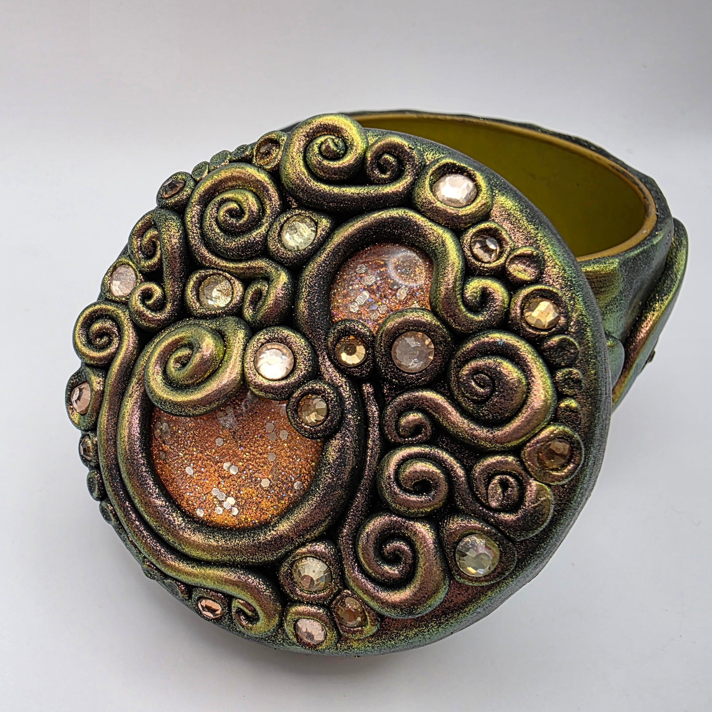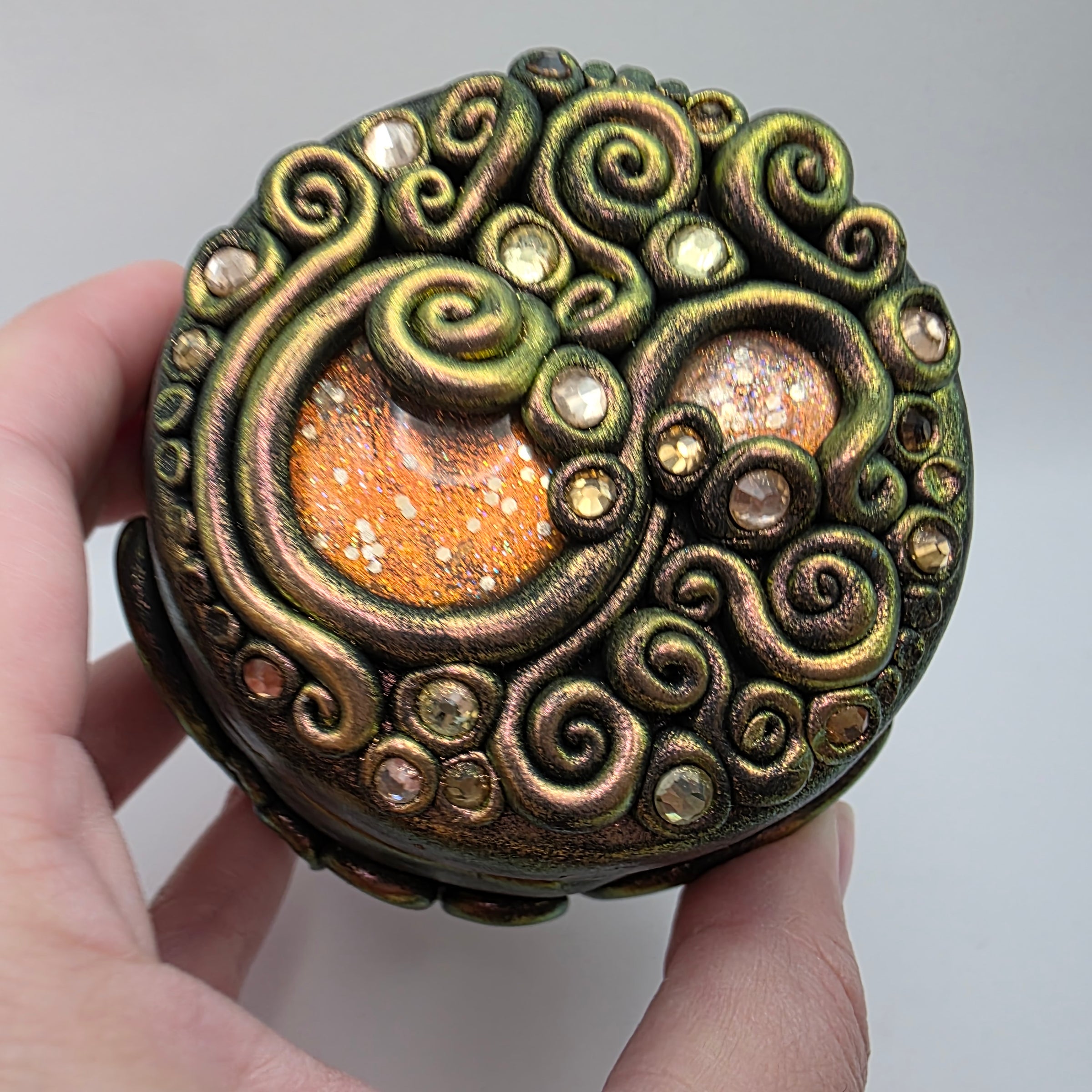 This polymer clay trinket box features two painted glass cabochons with gold glitter against a pale pink background, surrounded by swirls of clay and gold rhinestones. Brushed with a shimmering gold chameleon powder that goes from gold to pink, and gives a dramatic contrast against the black clay. The base of the box has a matching cabochon as well.