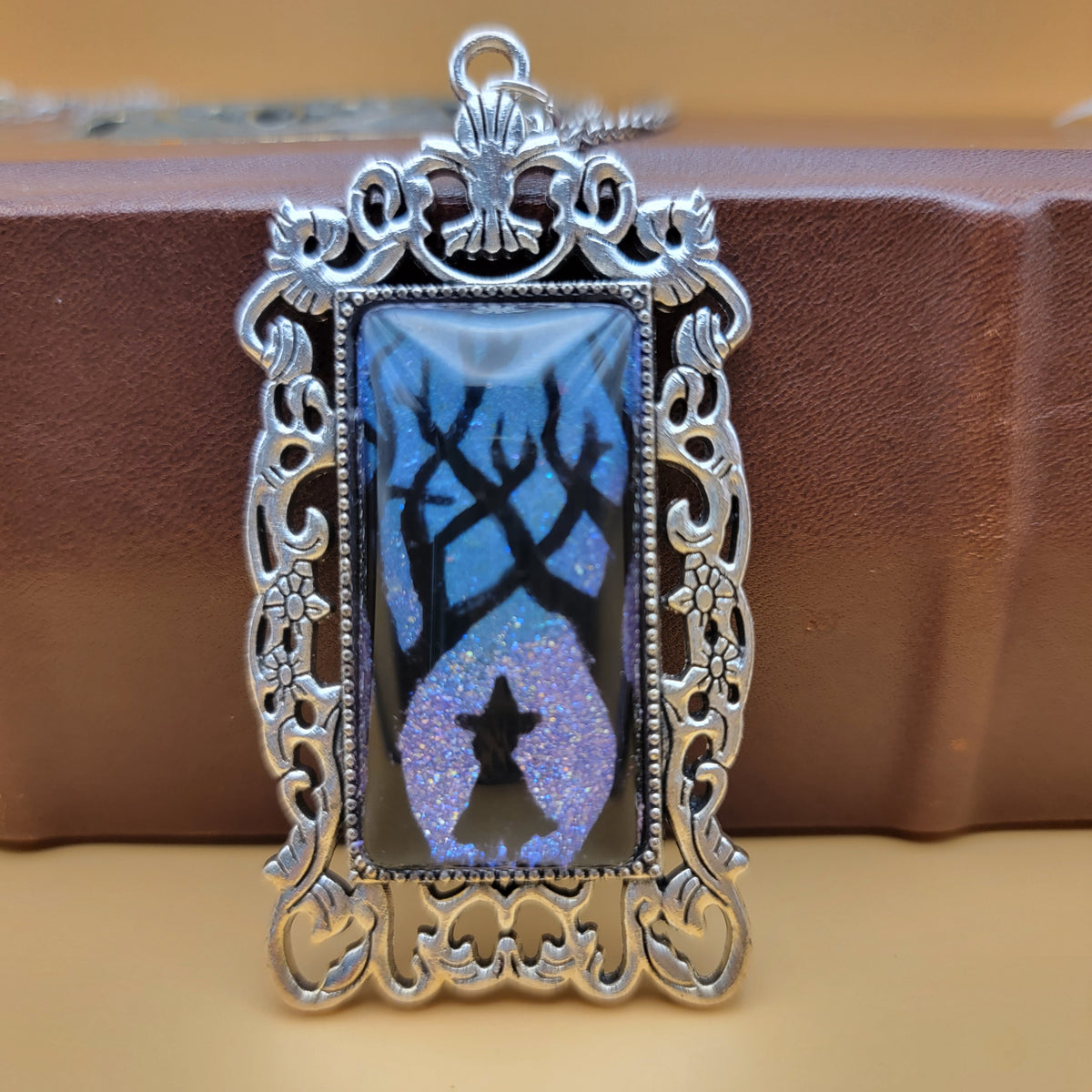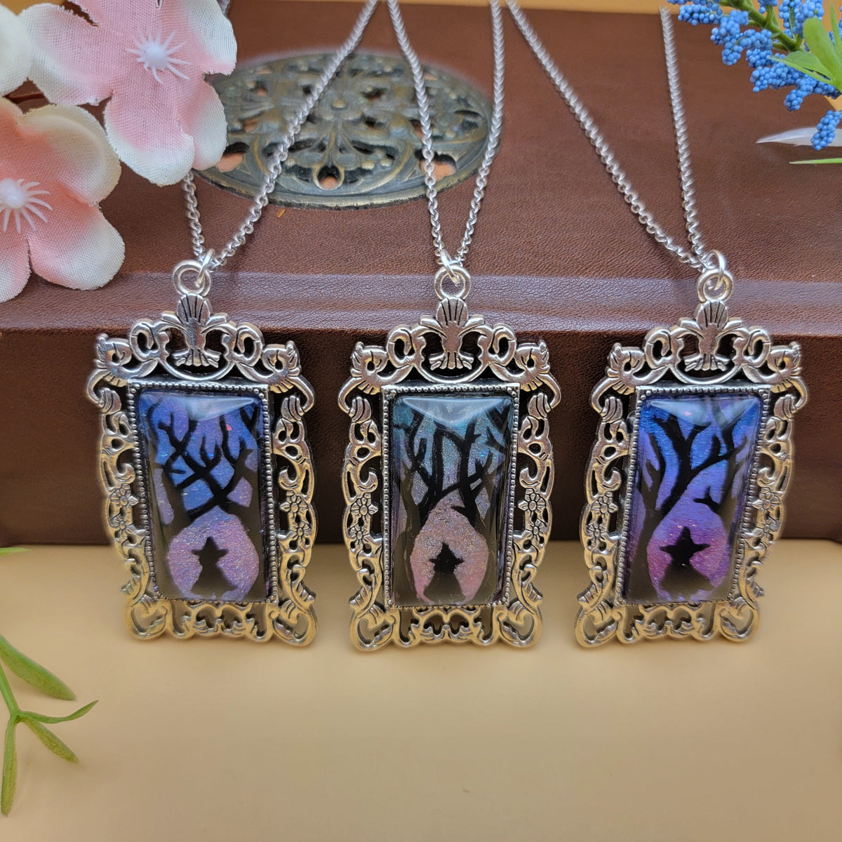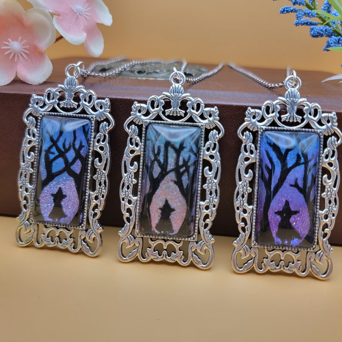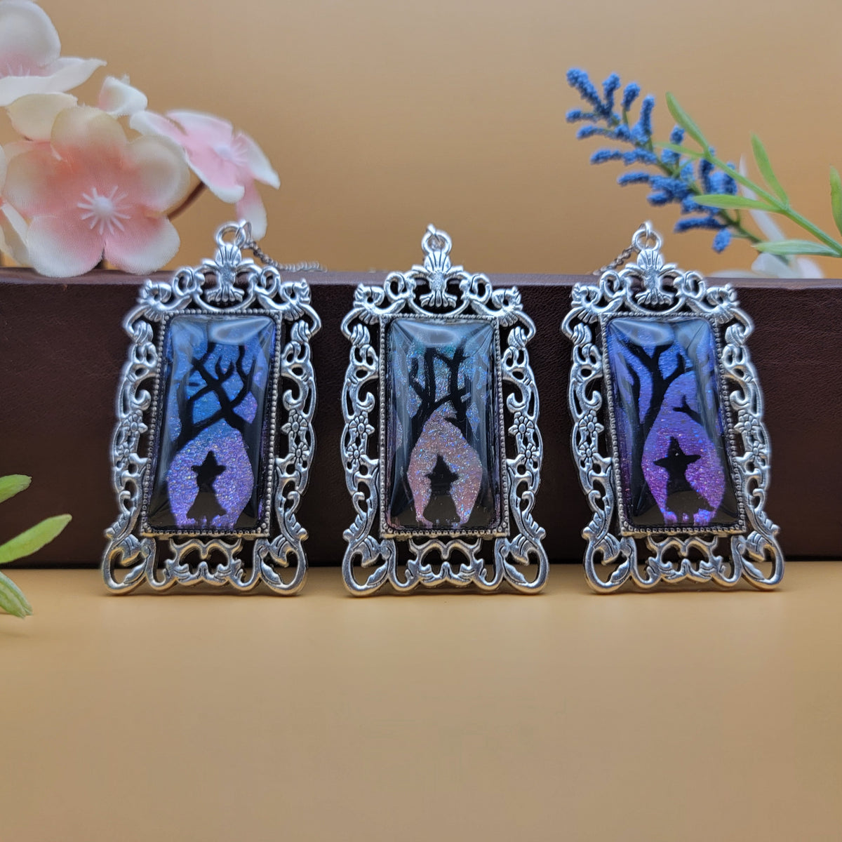 A hand painted pendant, featuring the silhouette of a little witch walking between trees, set against colorful, sparkling backgrounds. Each pendant is one of a kind! In addition to their sparkle, they also have a bit of glow to them! Glowing photos were taken after exposure to blacklight.