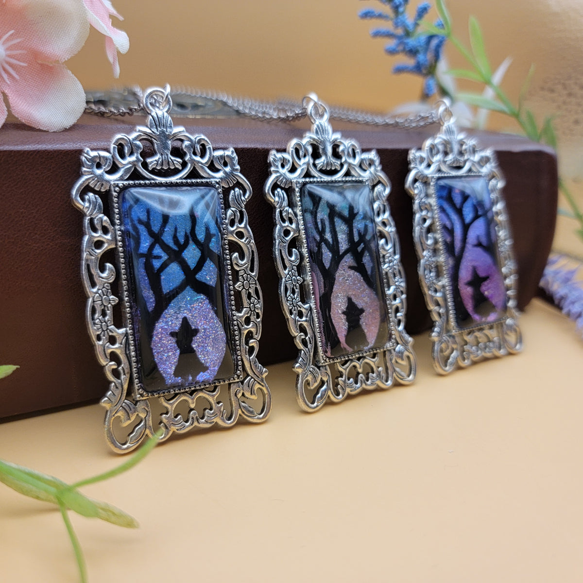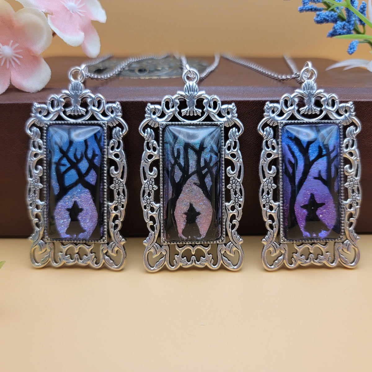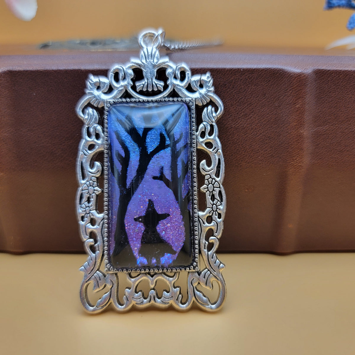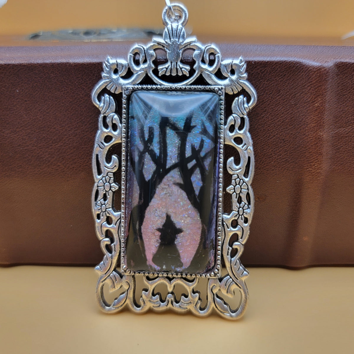 A hand painted pendant, featuring the silhouette of a little witch walking between trees, set against colorful, sparkling backgrounds. Each pendant is one of a kind! In addition to their sparkle, they also have a bit of glow to them! Glowing photos were taken after exposure to blacklight.