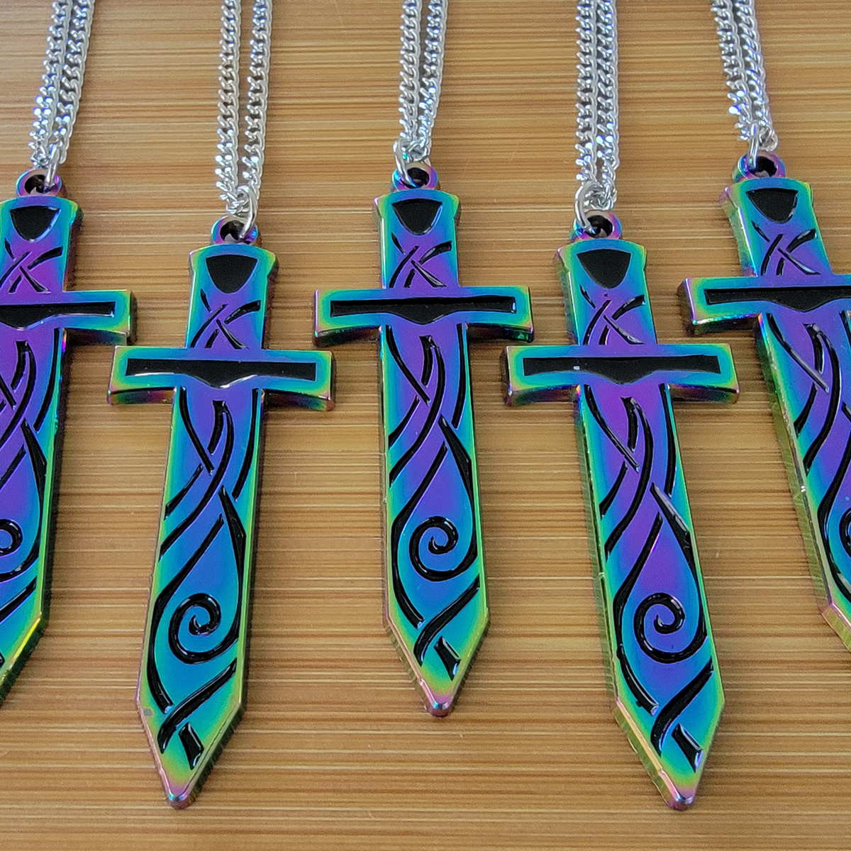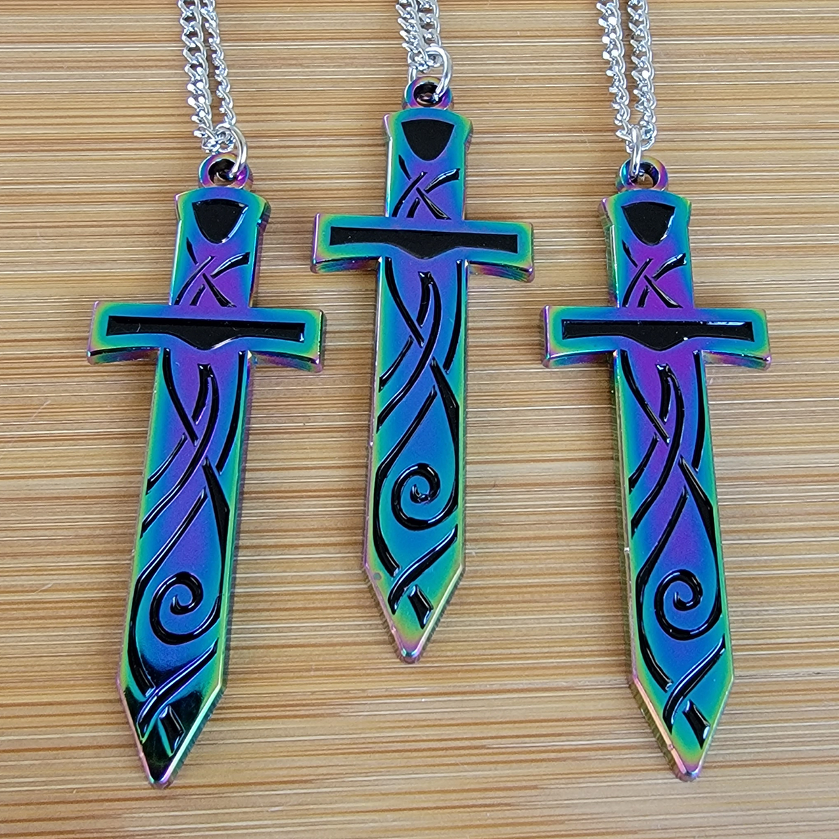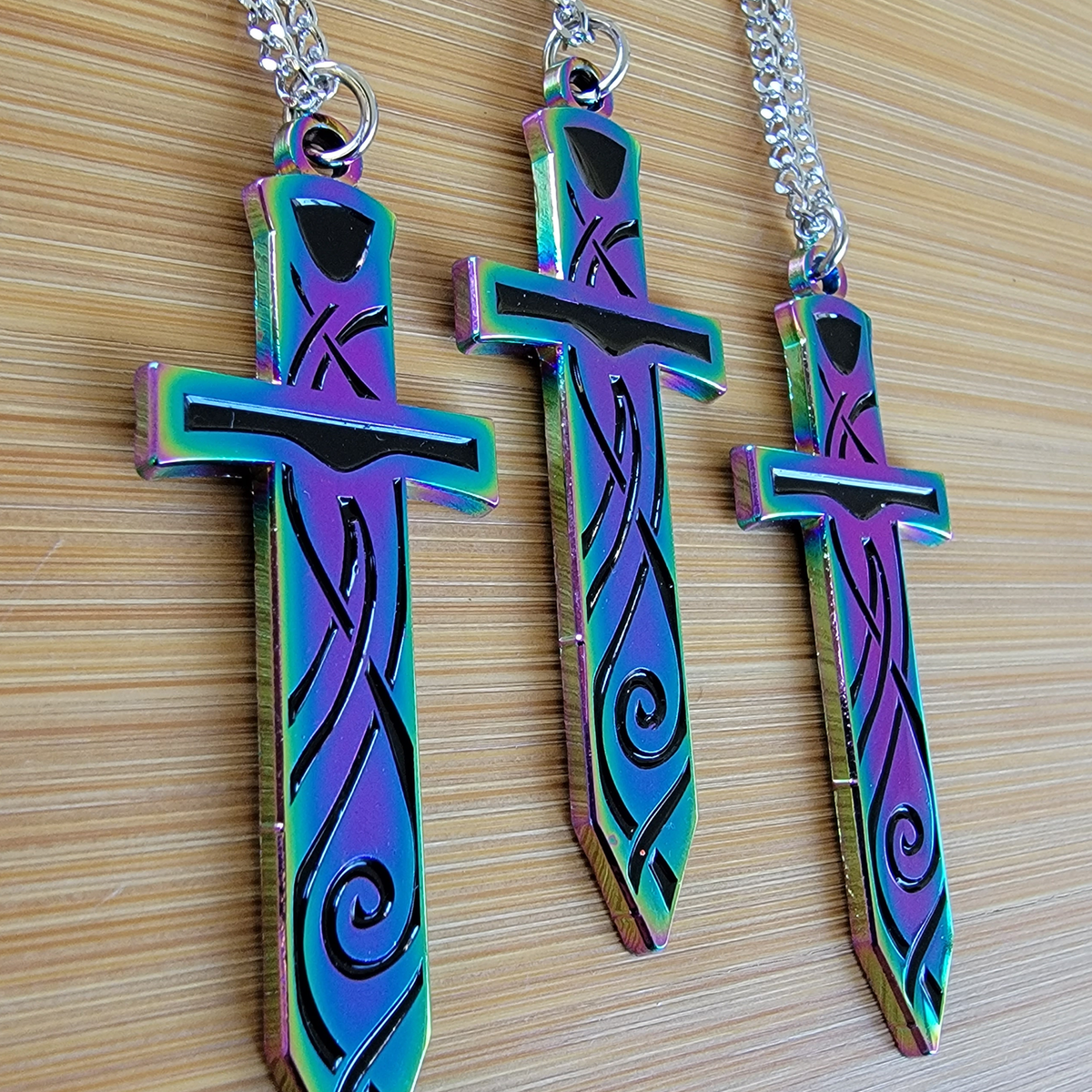 Sword pendants measure 55m long and are rainbow plated with an enamel design. Choose from a 20 inch stainless steel chain or a 24 inch black chain. Pendants and chains are nickel free. Listing is for one pendant and chain. See more swords and check out rainbow dagger earrings.