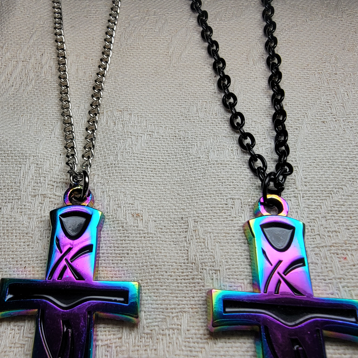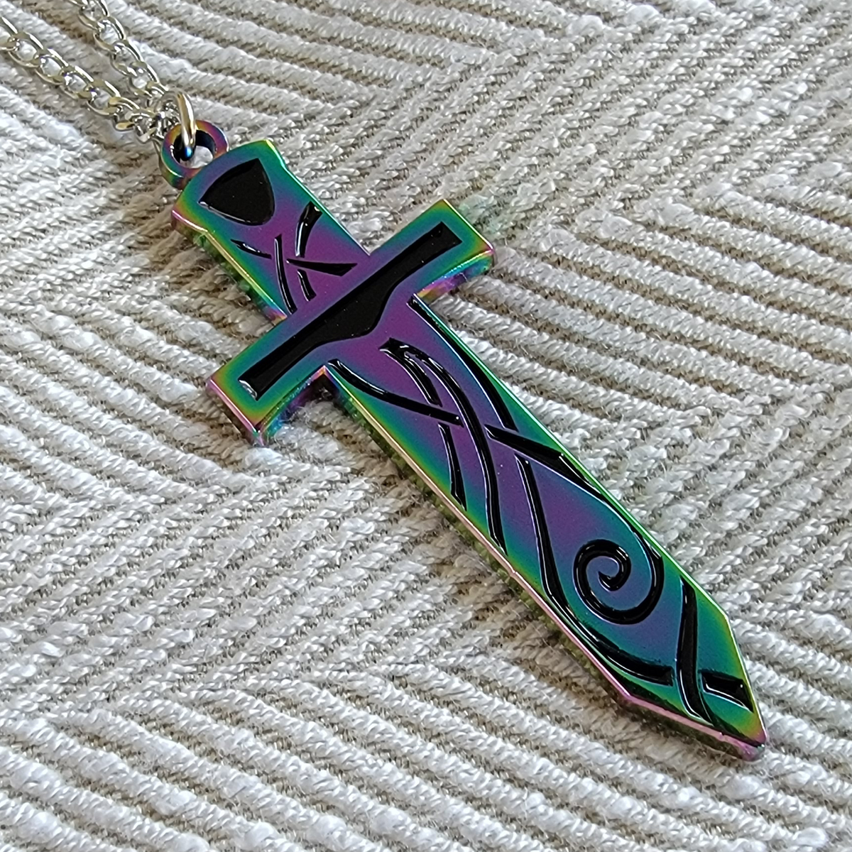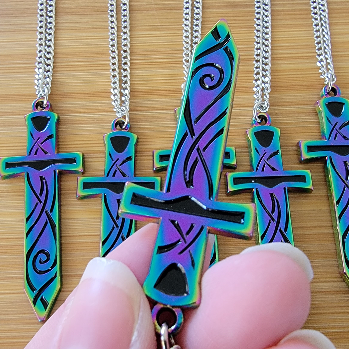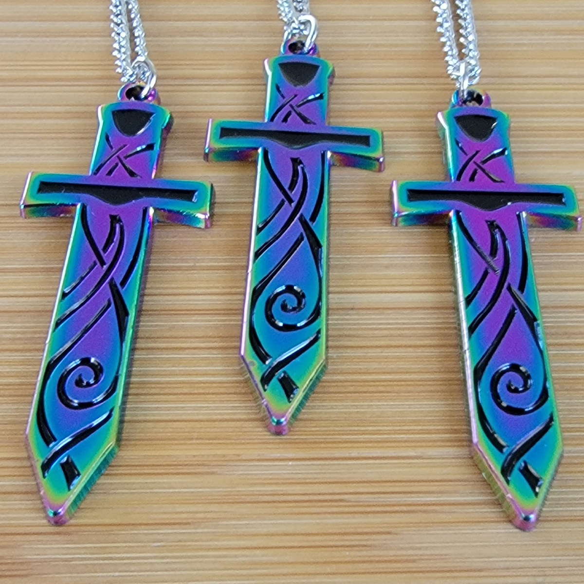 Sword pendants measure 55m long and are rainbow plated with an enamel design. Choose from a 20 inch stainless steel chain or a 24 inch black chain. Pendants and chains are nickel free. Listing is for one pendant and chain. See more swords and check out rainbow dagger earrings.