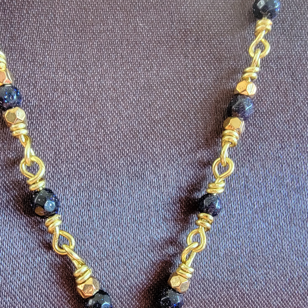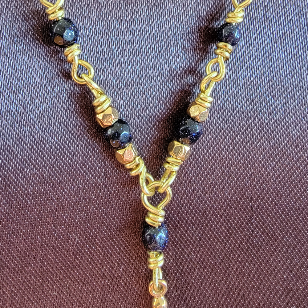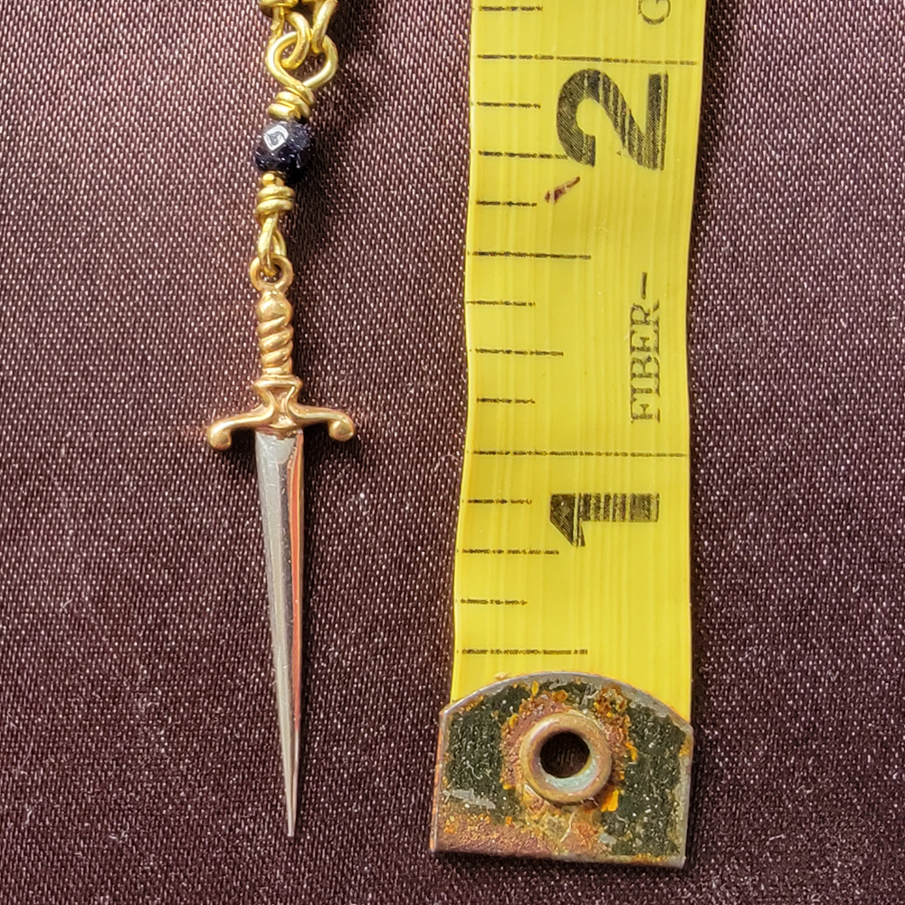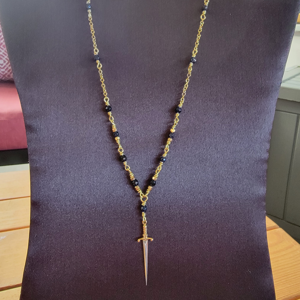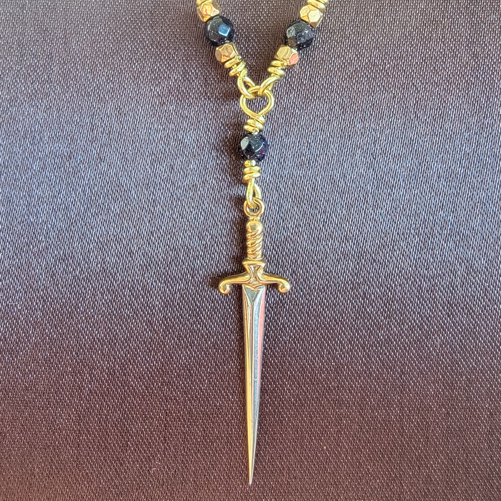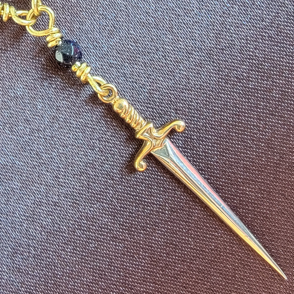 This dazzling necklace features a delicate brass and sterling silver sword on a brass toned chain interspersed with with glittering blue goldstone and metallic beads on twisted wire. Sword pendant measures approximately 1.5 inches in length. Necklace measures just under 20 inches in length.