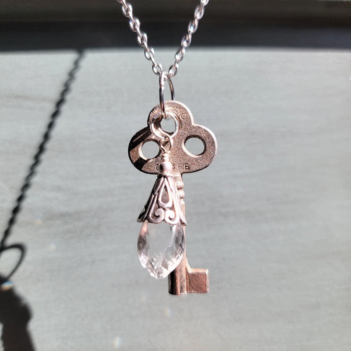 A vintage key with a sparkly piece of quartz covered in a swirly bead cap. Everything is on a stainless steel chain.