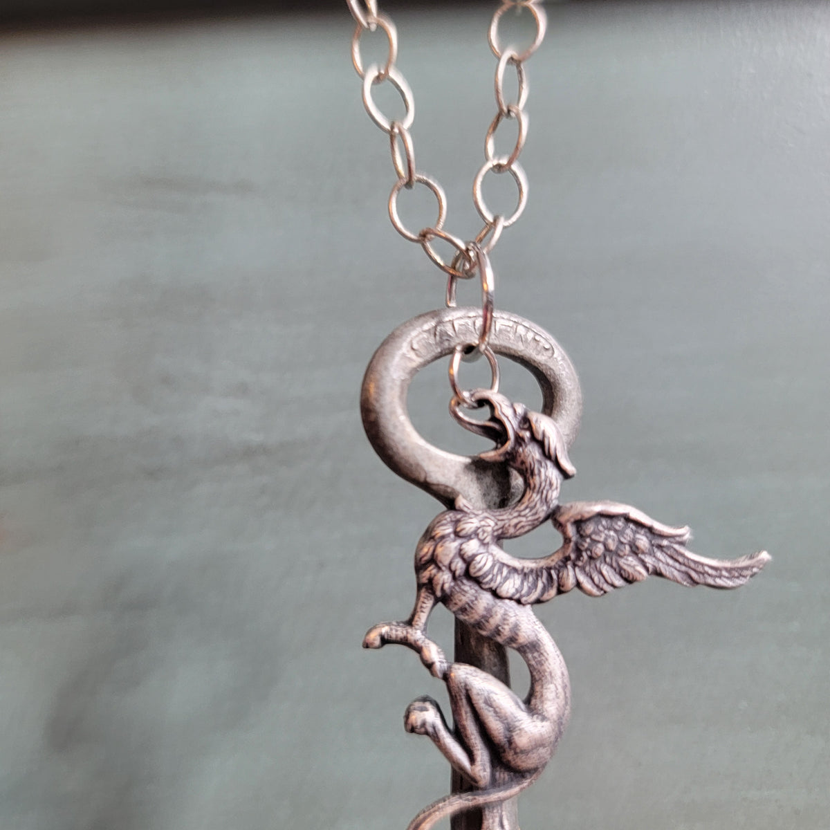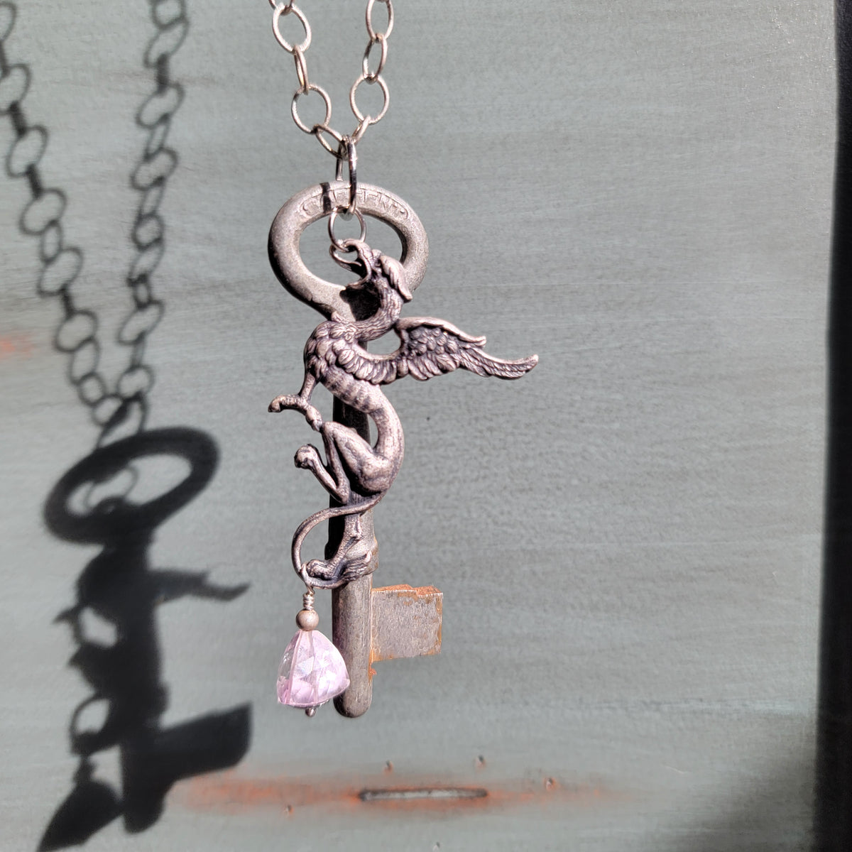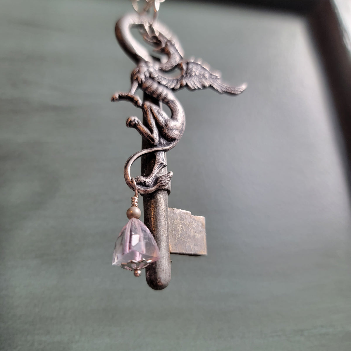 A vintage key with a griffin that has a pyramid-shaped piece of amethyst hanging from its tail. The key has the word "SARGENT" stamped on it, though the letters are fading.
