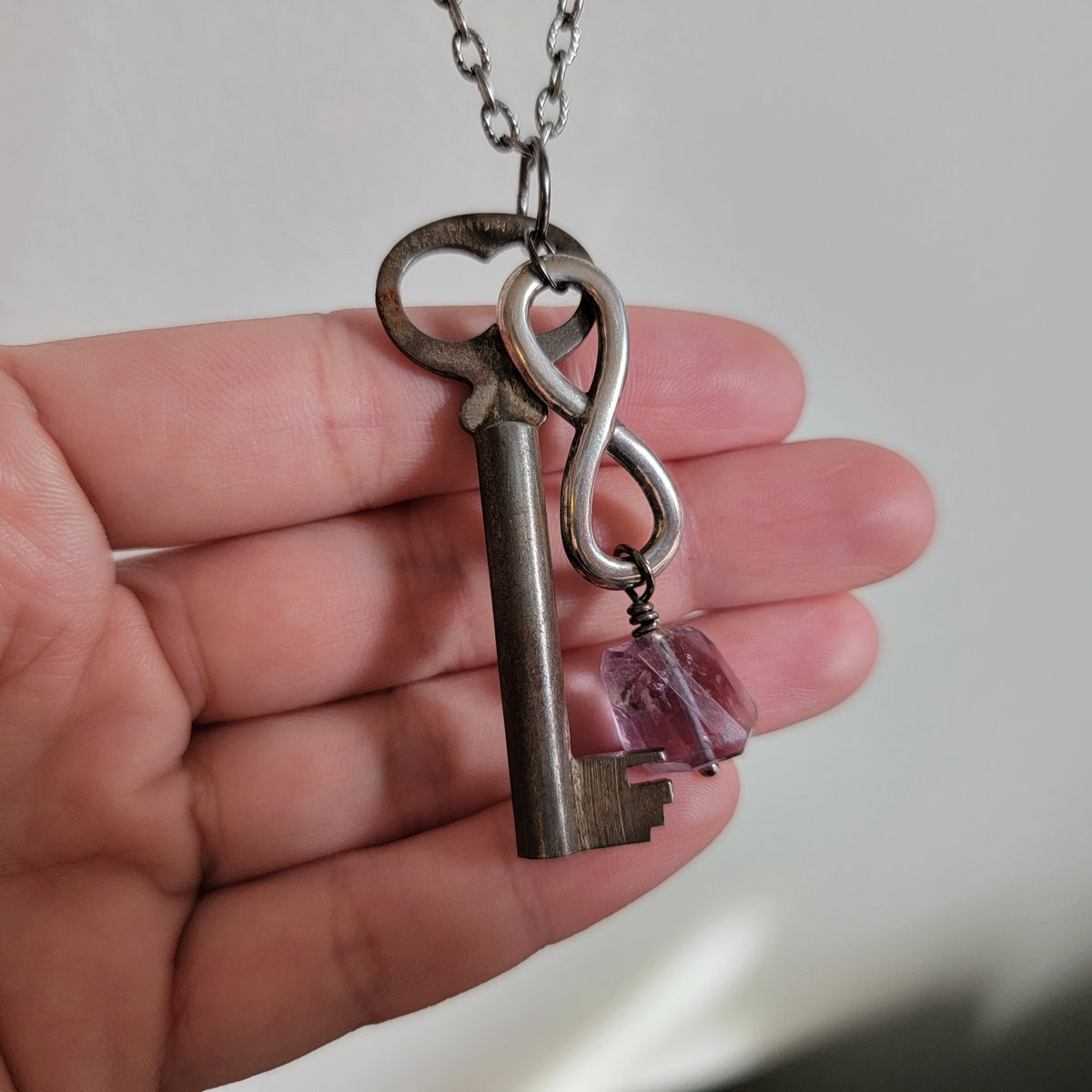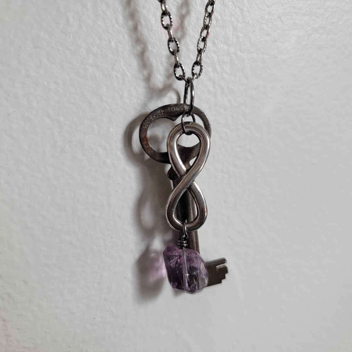 A vintage key with an infinity charm with a gorgeous piece amethyst dangling from it. The key has the word "CORBIN" stamped on one side, and stamping on the other side that is harder to make up.