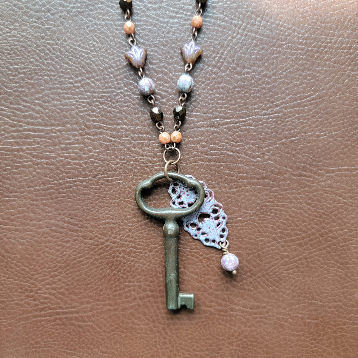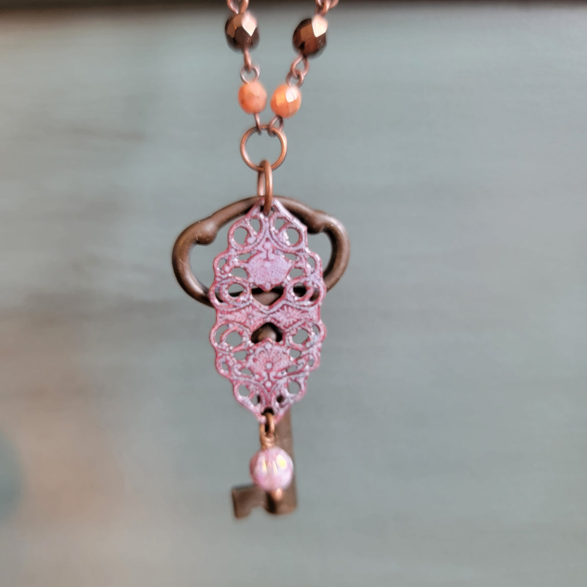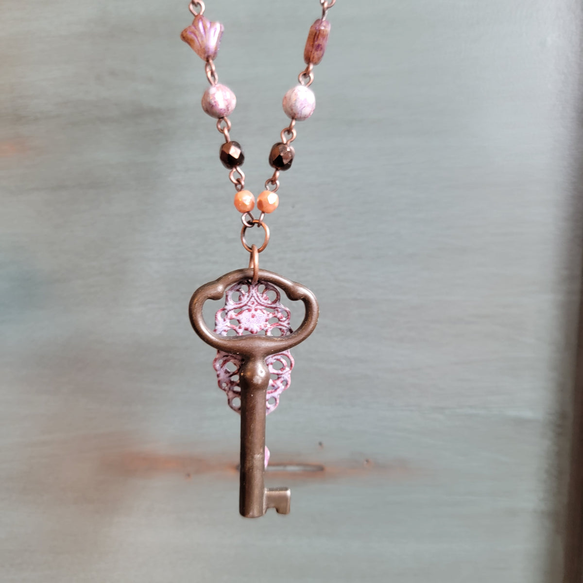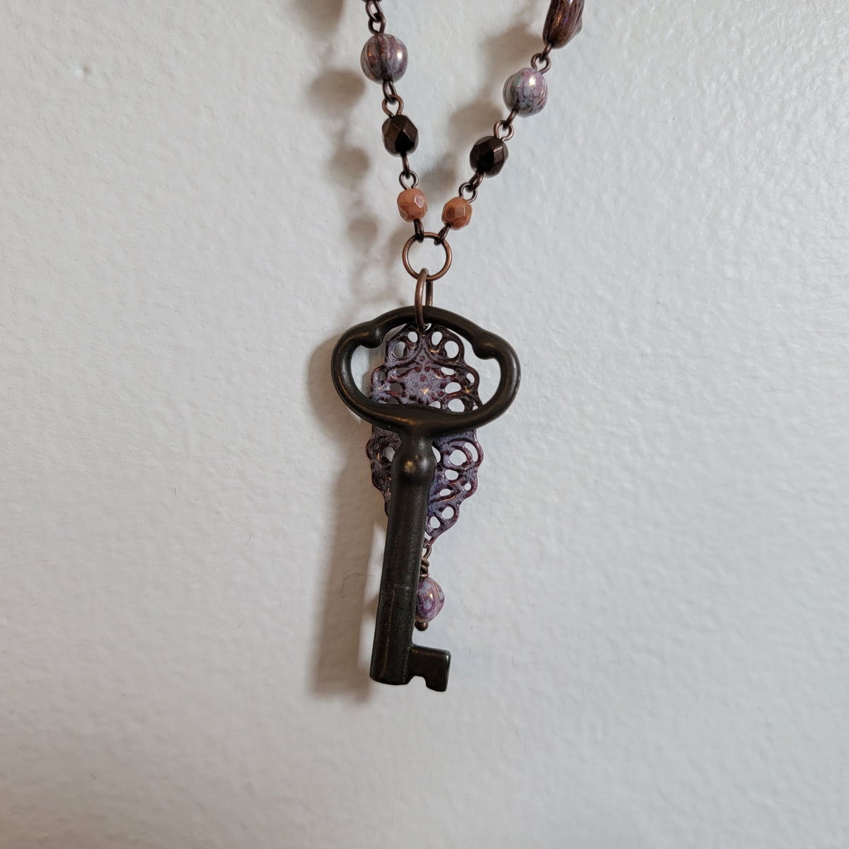 A vintage key with a purple filigree piece with a bead on one end, all hanging from beautiful beaded chain. The chain has beads of pink, mauve, and purple.