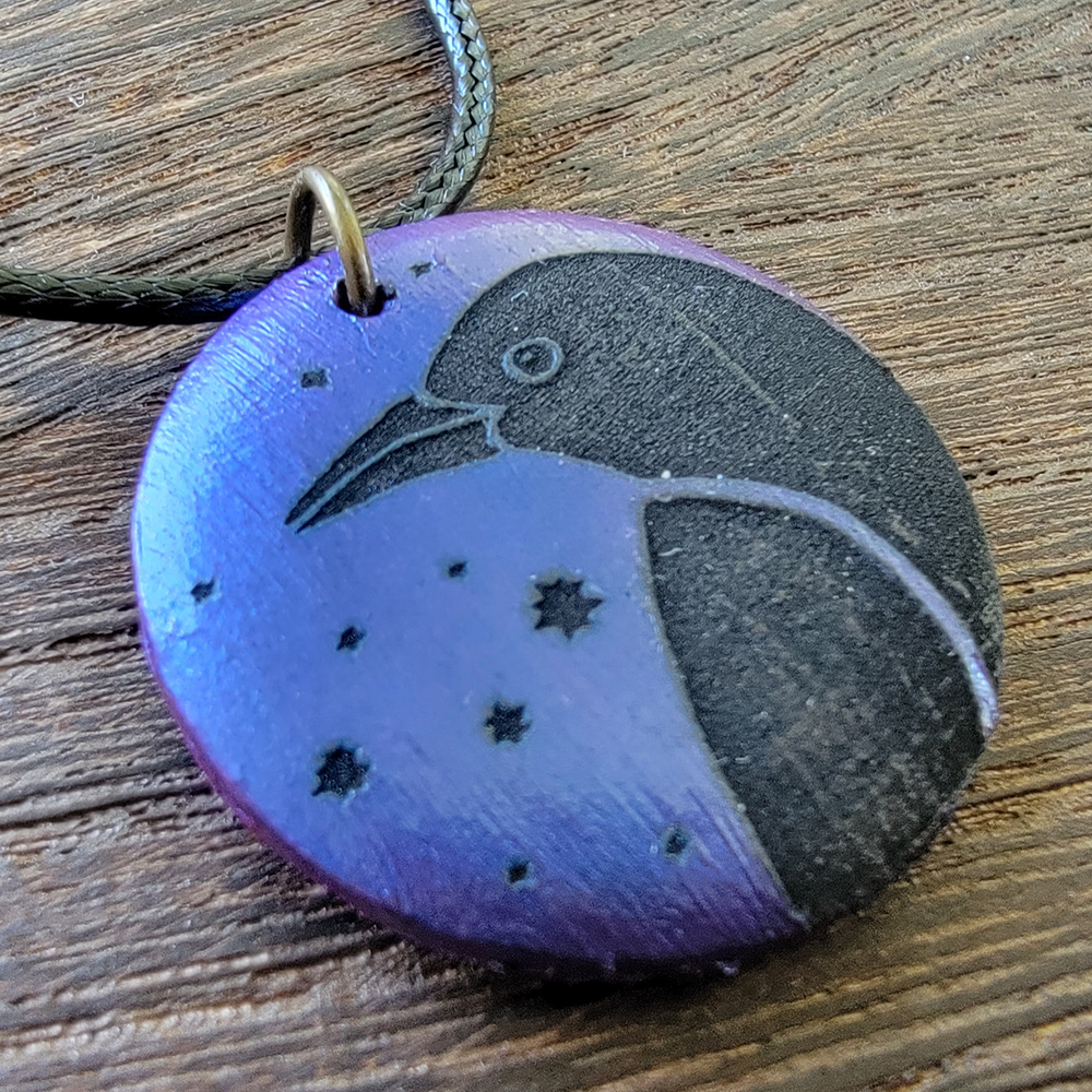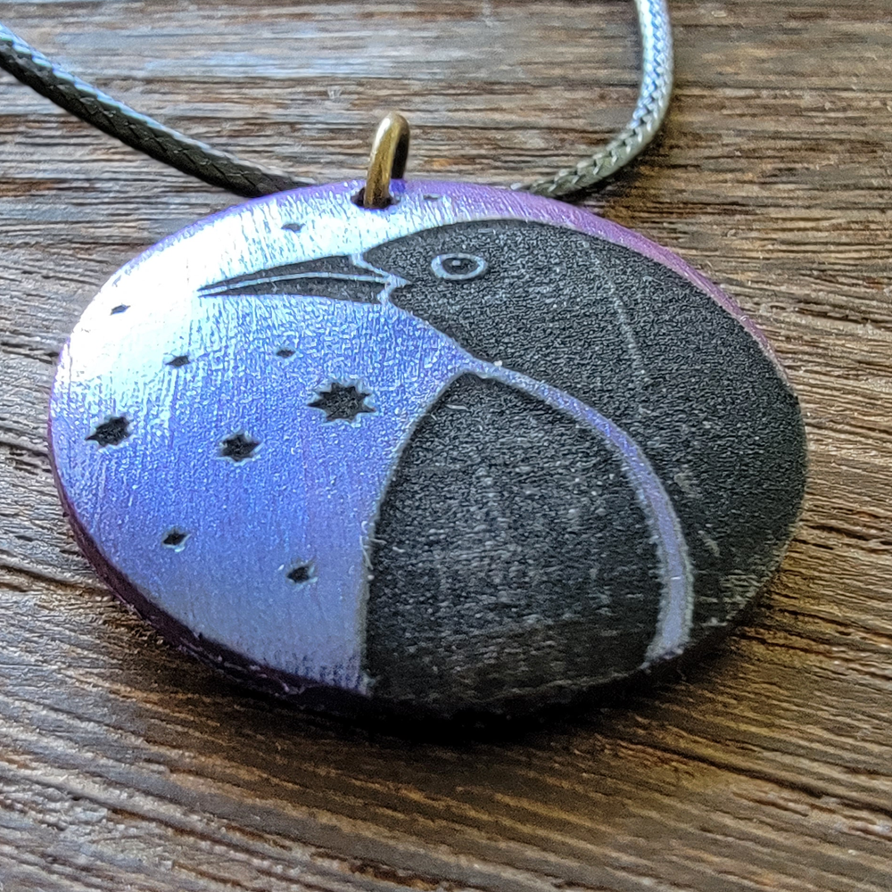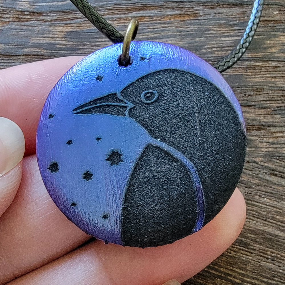 A wooden pendant with a crow against a starry blue-violent iridescent background.