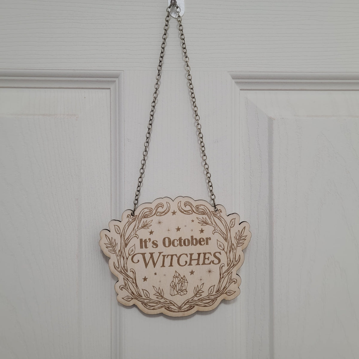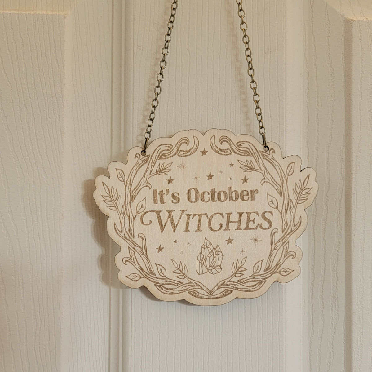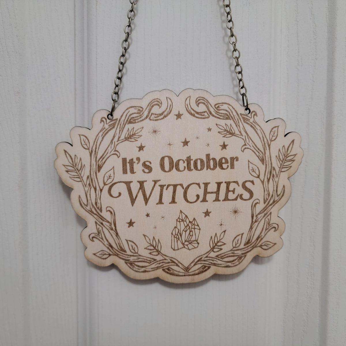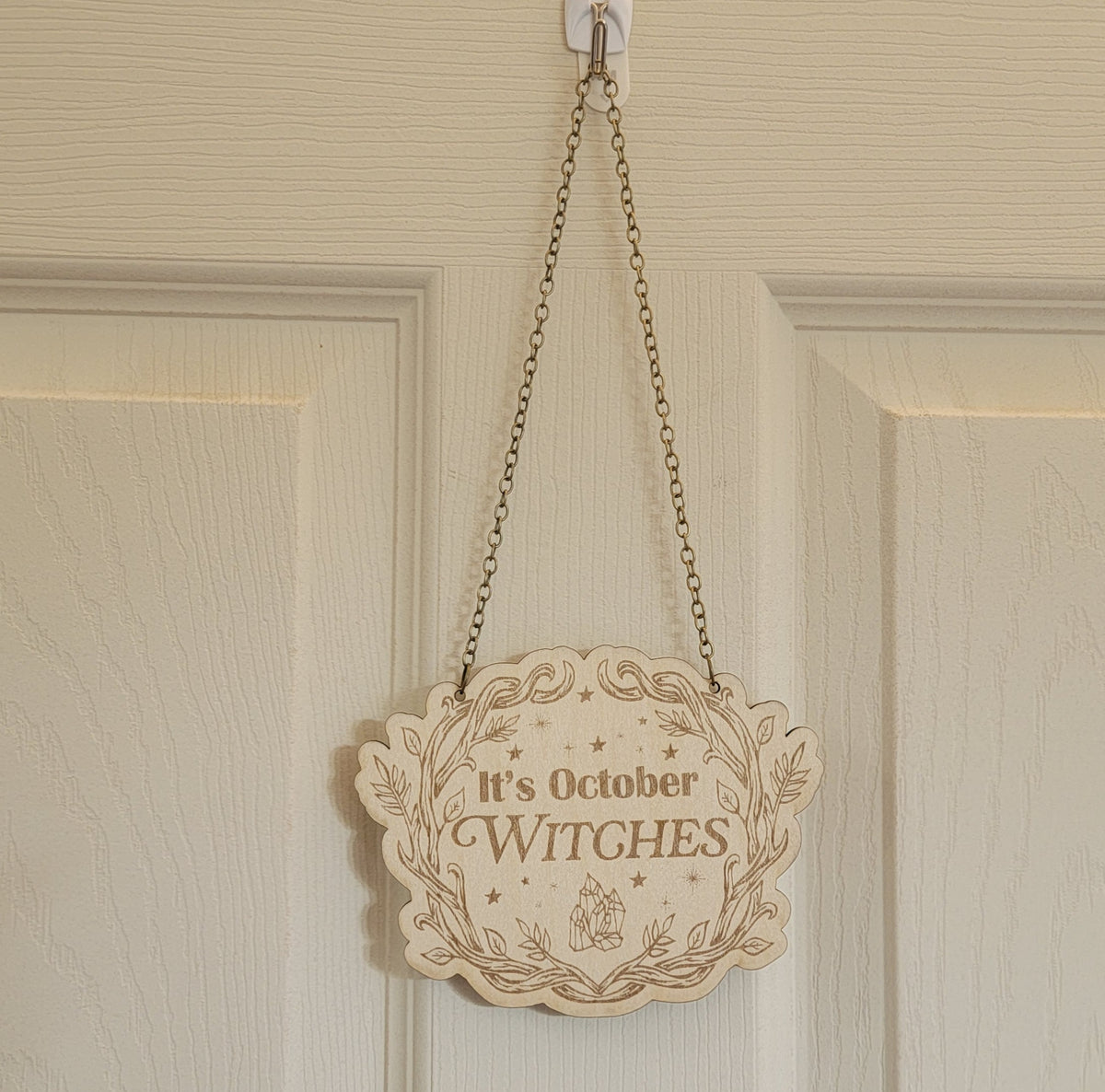 A natural wood sign, laser engraved with a whimsical vine design and "It's October Witches"