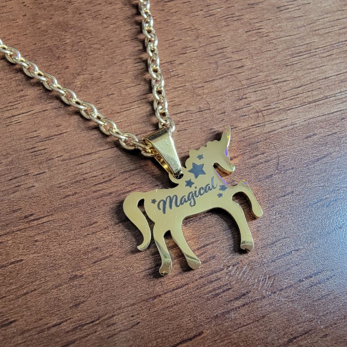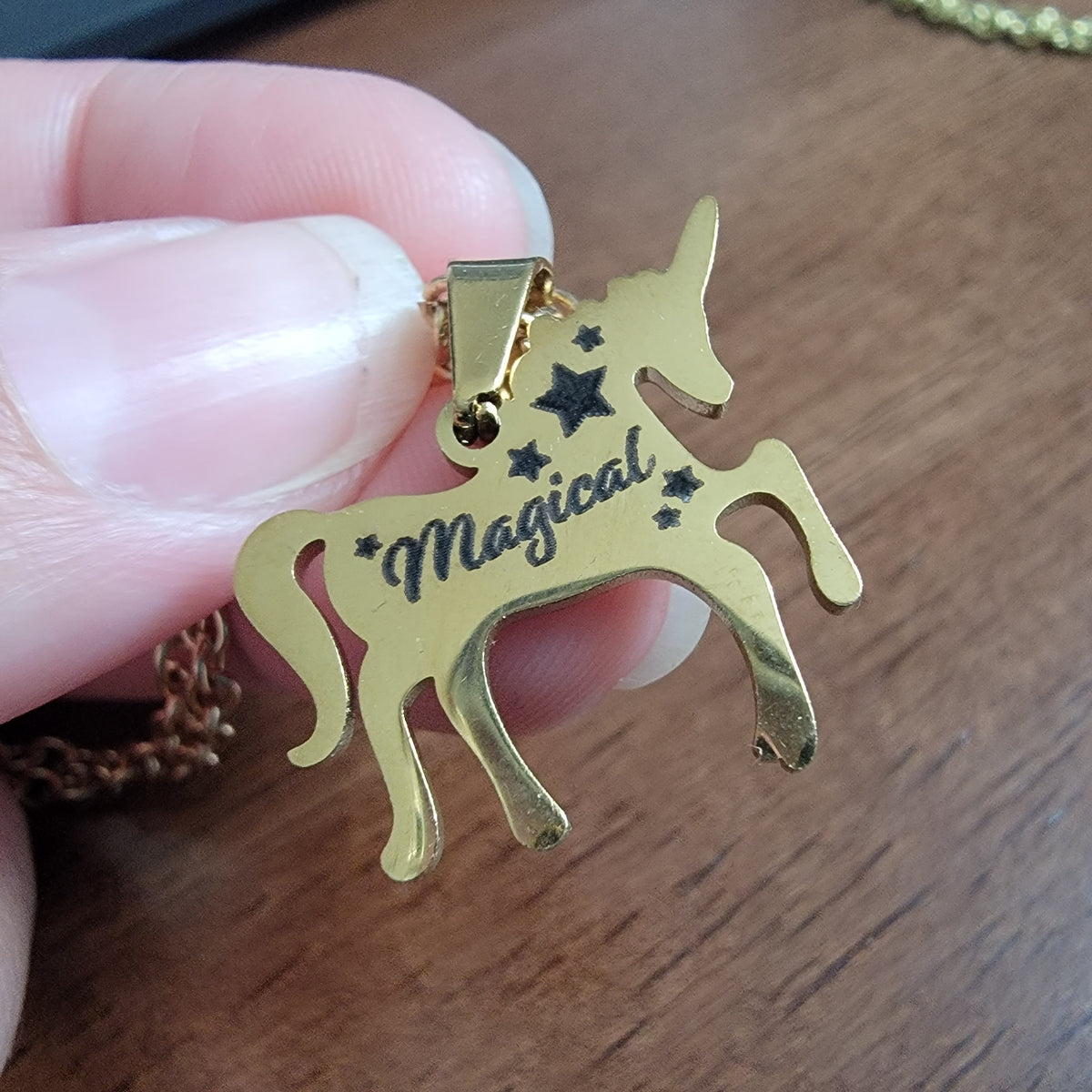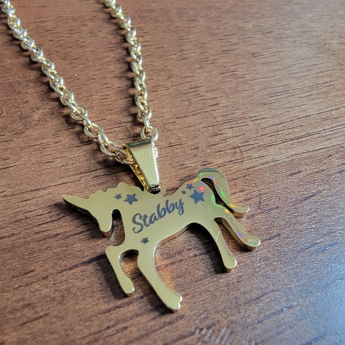 A dainty unicorn pendant for every mood! This little unicorn has been laser engraved on both sides, so it can cover all occasions. One side of the unicorn says "Magical" surrounded in stars, and the other side says "Stabby" surrounded by stars. A