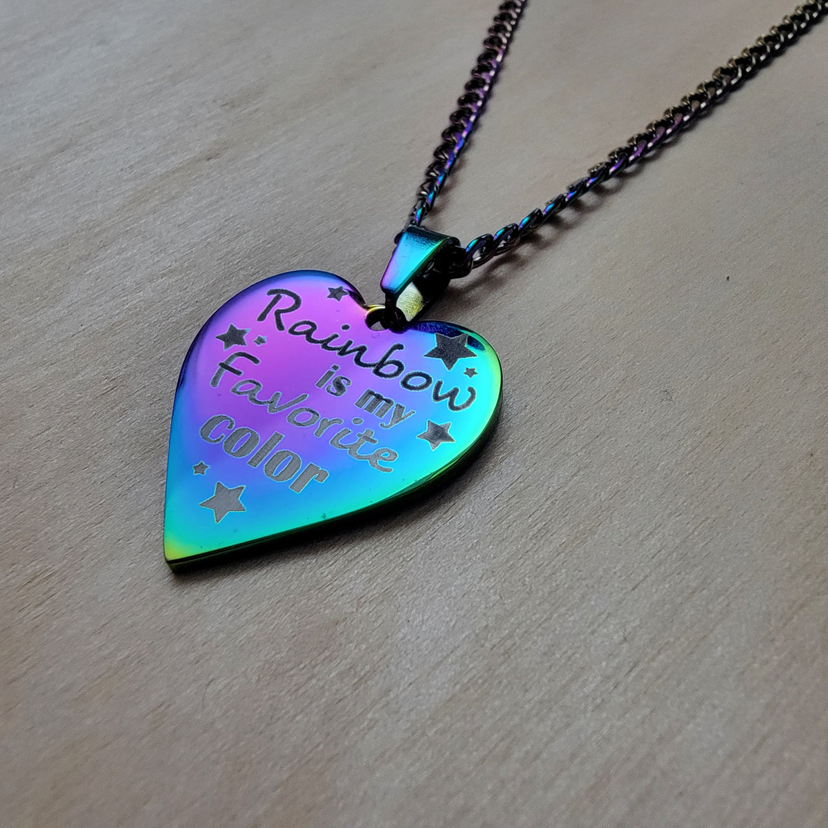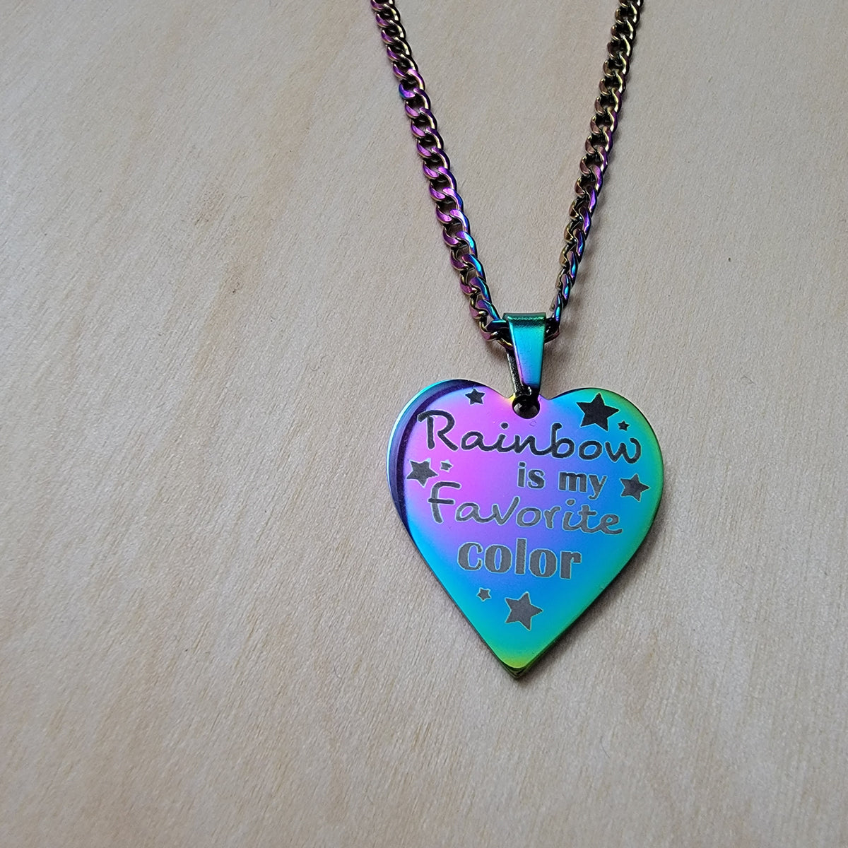A rainbow heart pendant that declares "Rainbow is my favorite color" surrounded by stars. Design is laser engraved on a stainless steel, rainbow plated pendant.